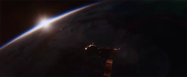 The scene that comprises the third turning point of Gravity begins with the camera on Stone as she discovers that the Soyuz pod is out of fuel. Right before Stone violently swears at the empty tank, the viewpoint abruptly cuts to outside the capsule, where Stone can be seen pounding the control panel in frustration. Although the viewer is no longer inside the craft with Stone, there is still diegetic sound coming from her. Her transmission to Houston in-the-blind is heard as if over radio communication. This is the first indication that something unusual happening.