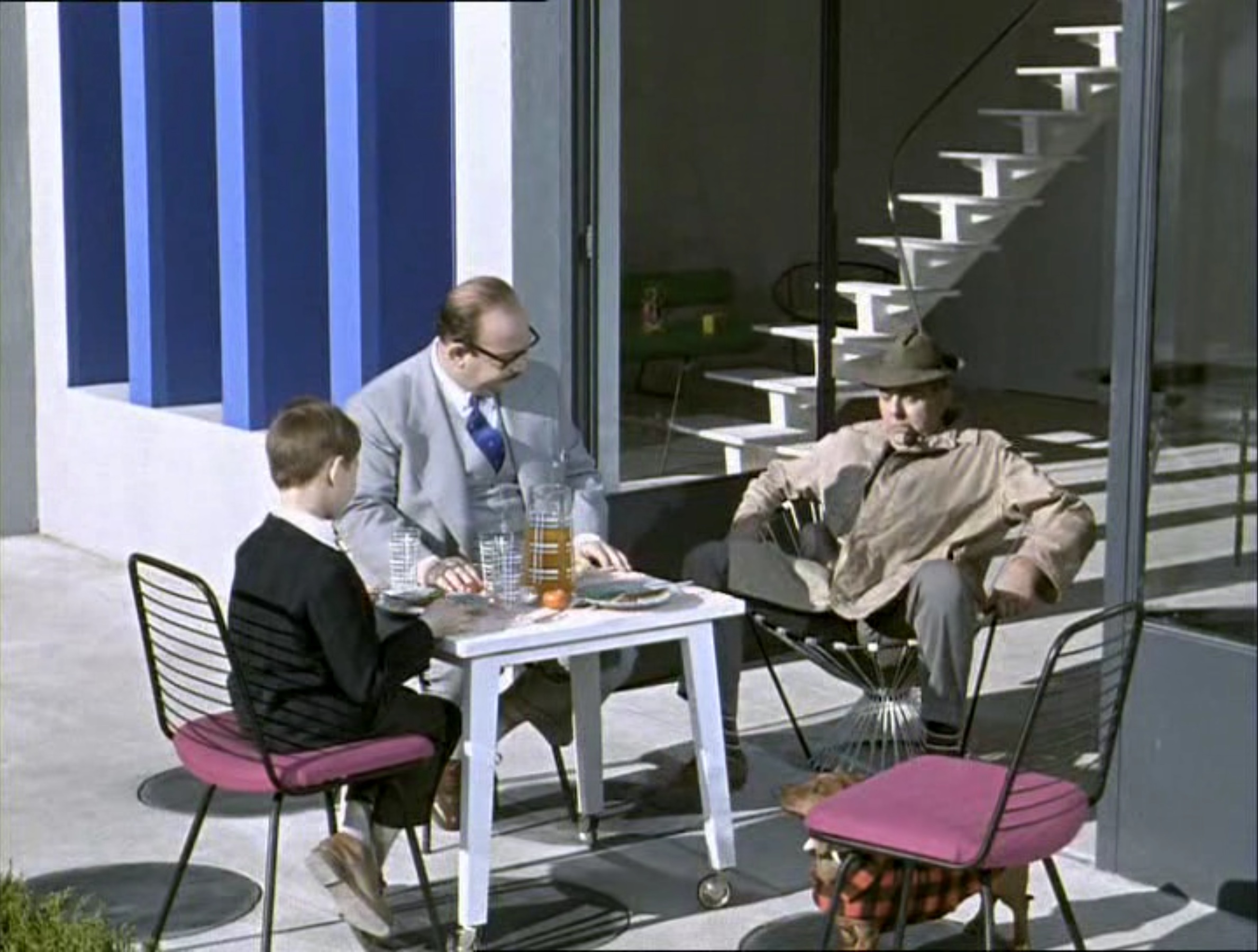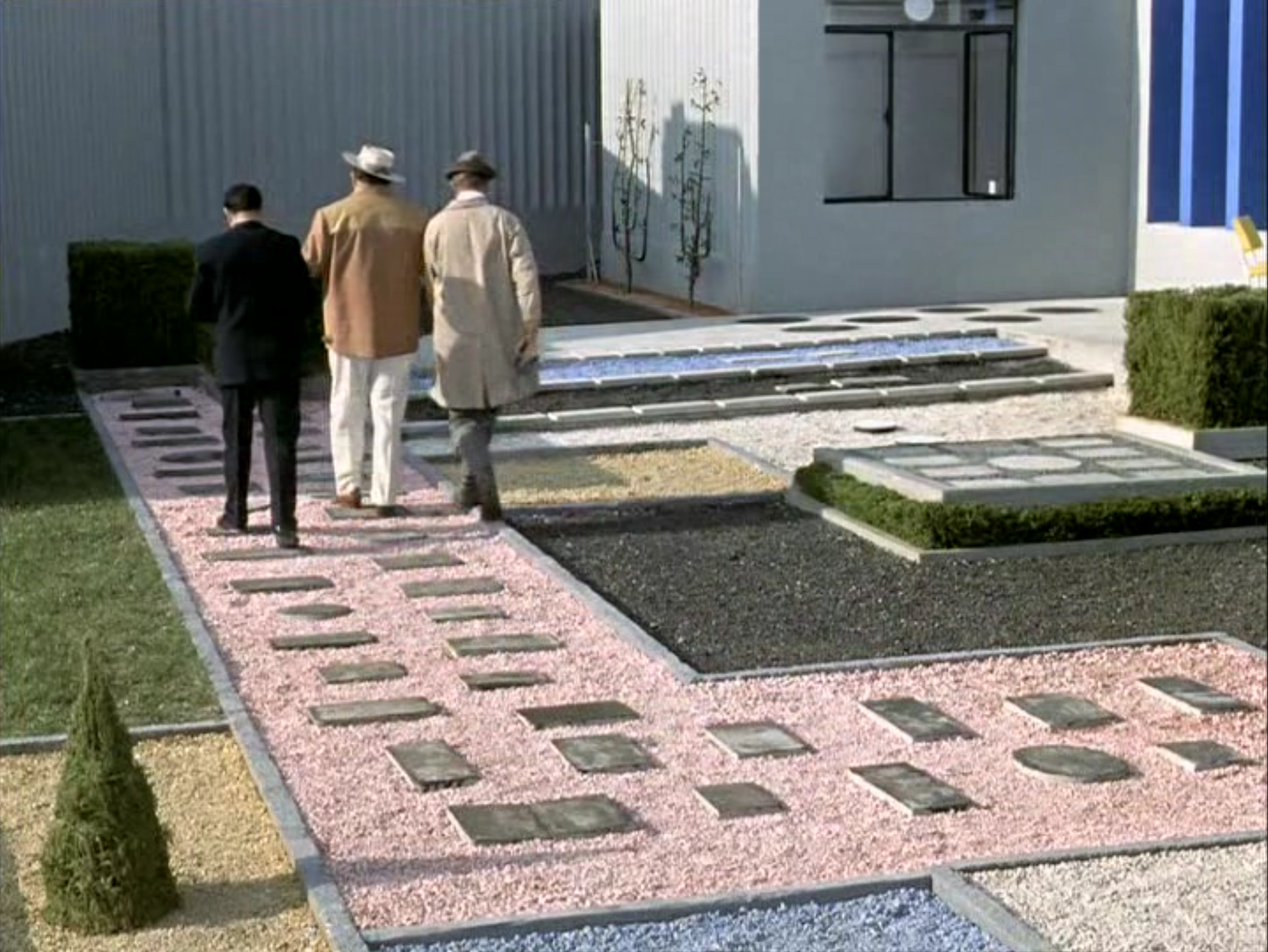 It is evident that Hulot is a foreigner in this modern zone from the moment he passes through the Arpel’s gate on his bicycle. The sight of him respectfully parking his bike as one would a car, with pipe in mouth, registers as pitifully antiquated.