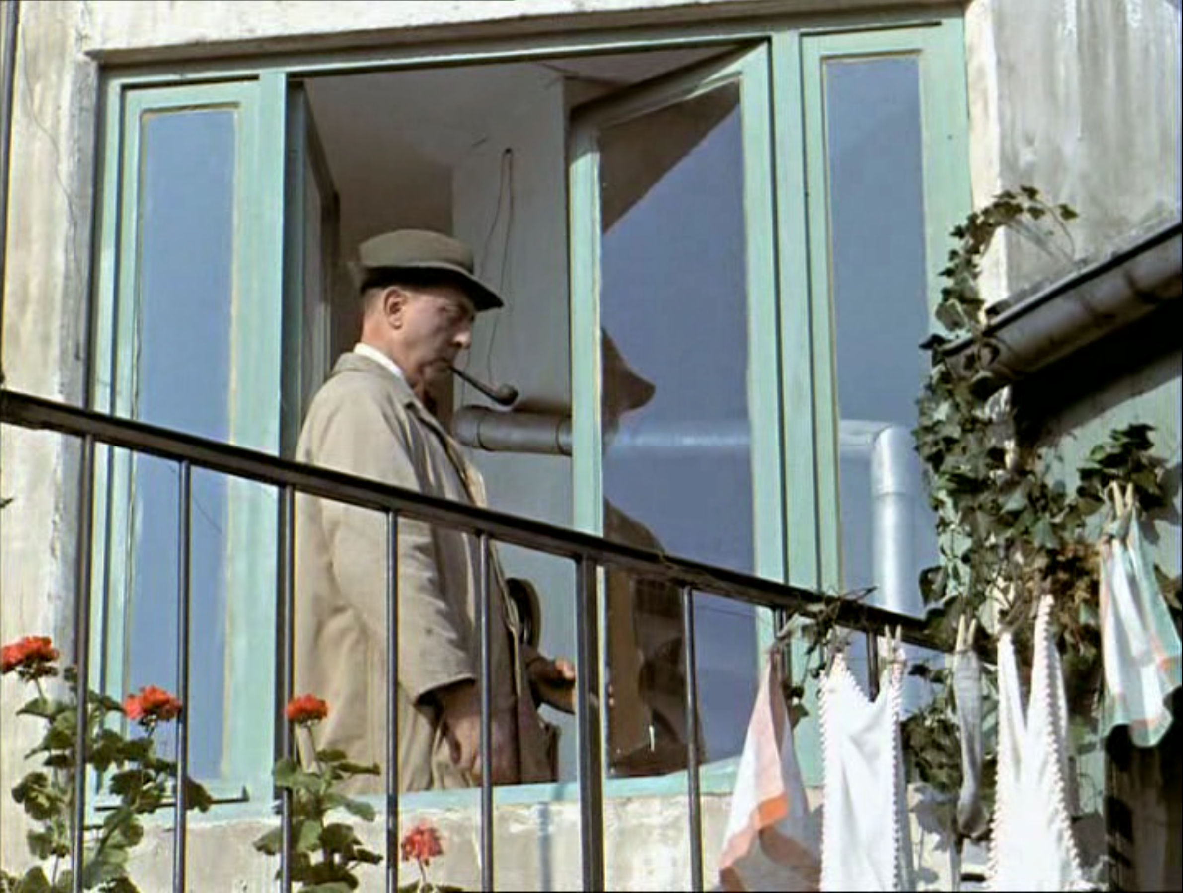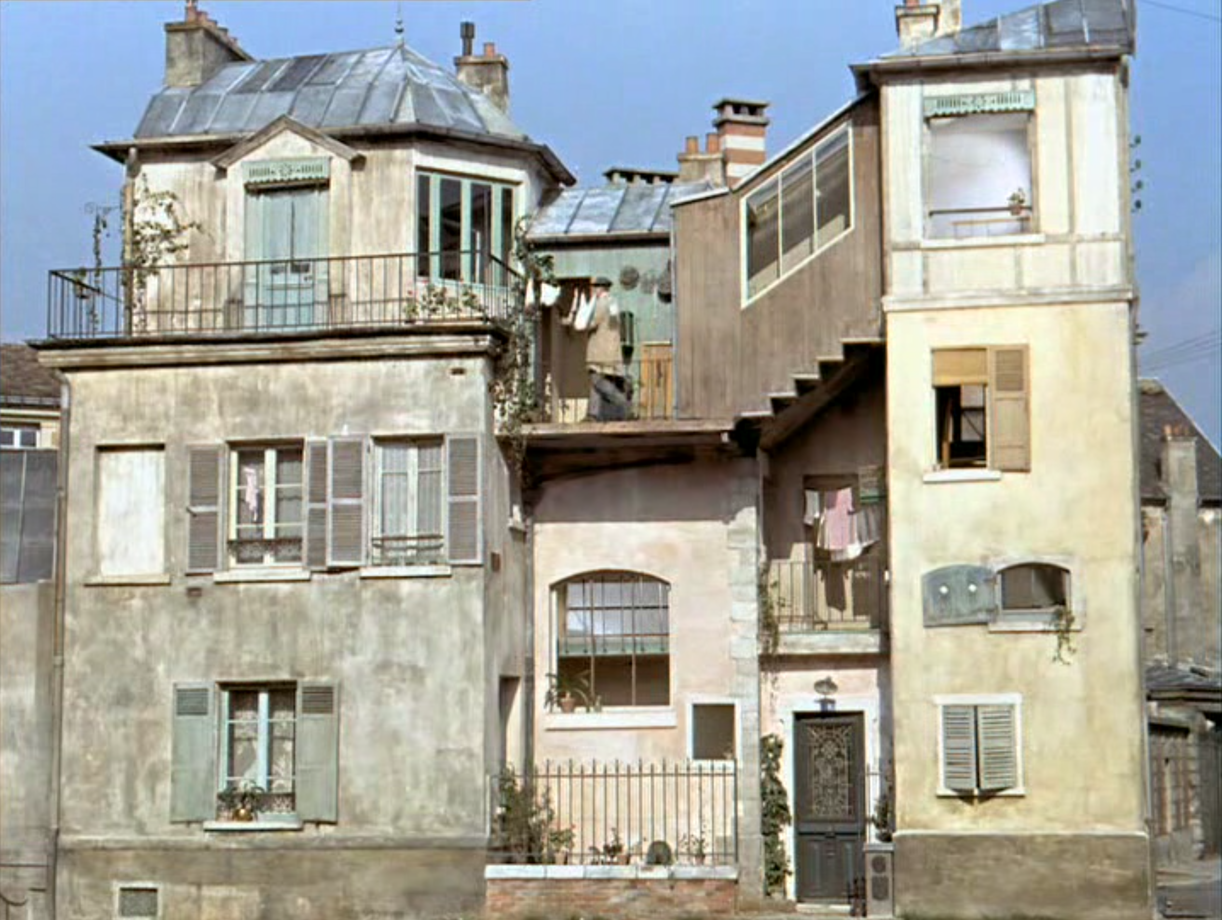Monsieur Hulot’s home in the old city is characterized by an improvisational nature; the style of comedy associated with this location follows suit. This improvisational nature is evident from Tati’s introductory long shots of the building, even before Hulot has appeared and begun to interact with it.