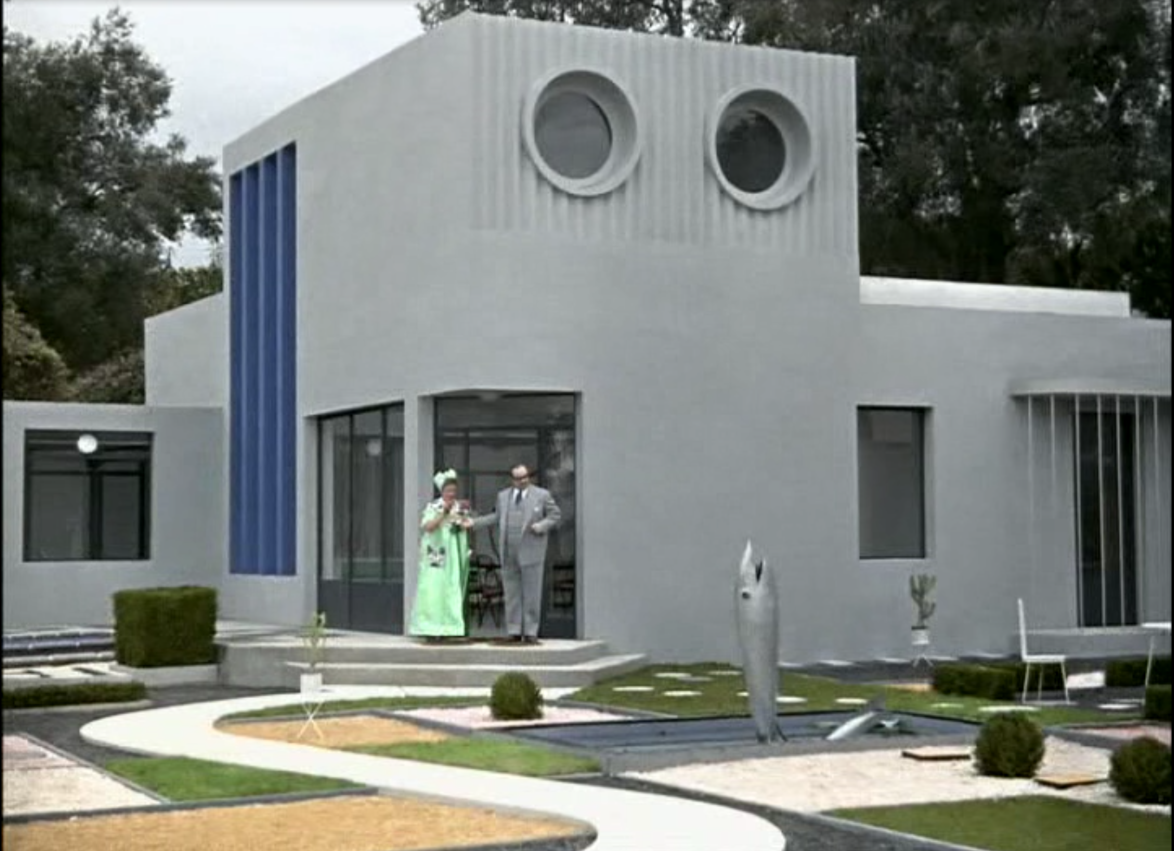 In sharp contrast to the improvisational tone of Hulot’s home in the old city, the home of his relatives in the new city is intensely scripted. In the same prolonged long shot style, Tati lingers on the exterior of the home while life happens within and around it as an introduction to this world. Instead of Hulot bumbling around a whimsical French apartment building, we are given Monsieur and Madame Arpel emerging from their home, which looks like either a small factory or a large robot. Its upper windows look like eyes and the main entrance is an off center mouth. The senselessly curved walkway and semi-operational fountain fish point to this house as a zone of arbitrary rules. Its arbitrary nature is not fully exposed, however, until Hulot arrives on the scene.