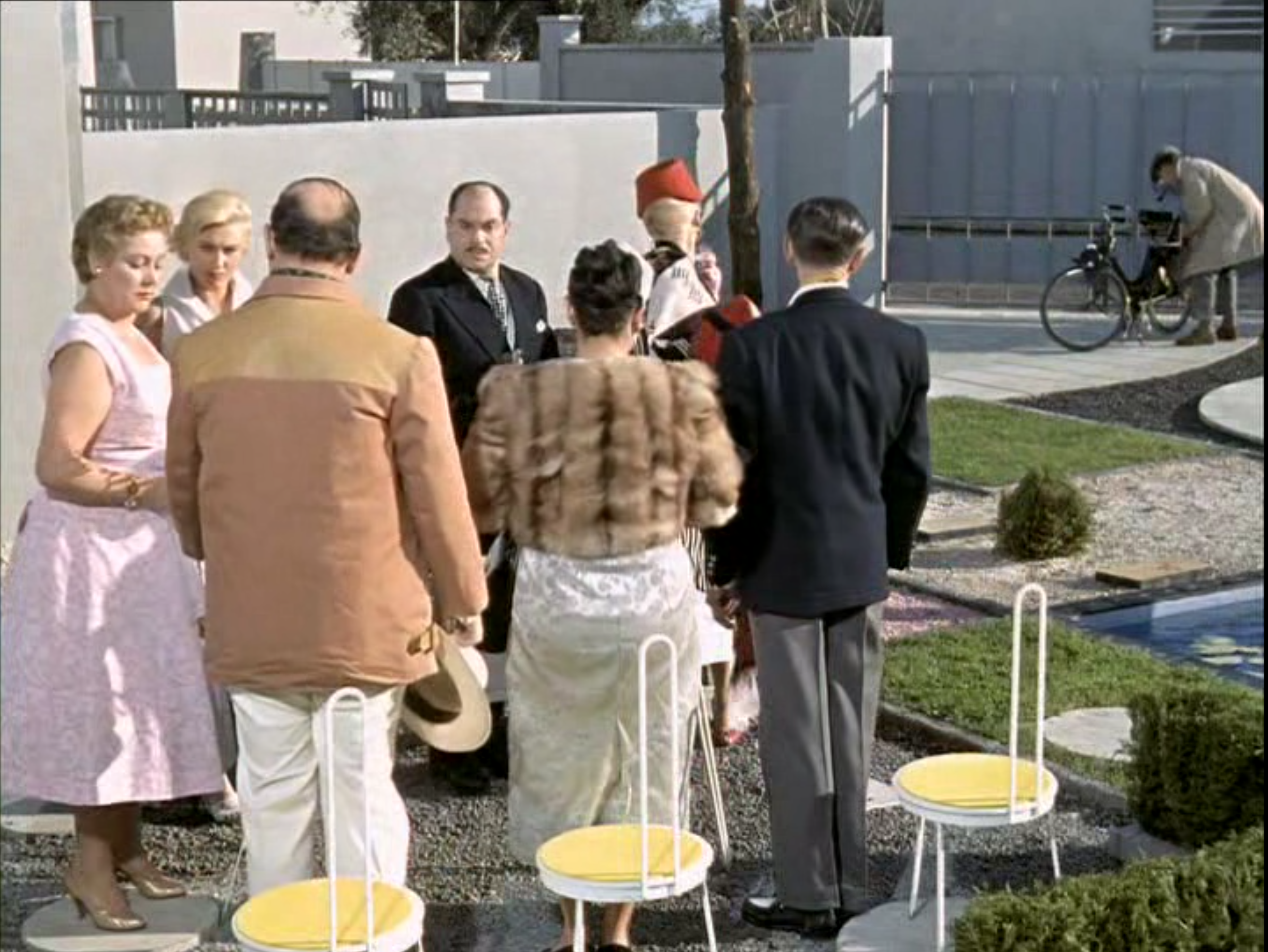 The principle on which this scene’s comedy rests, and the beauty of Hulot in general, is that as he moves from a zone of improvisation to a zone of rules, instead of conforming he superimposes his improvisational lifestyle onto the norms of a rule-based society. So he arrives at the party on his bicycle, because his bicycle is his means of transportation, and this time it registers as hilarious because of the appalled manner in which the Arpels and their guests all react to this entrance.