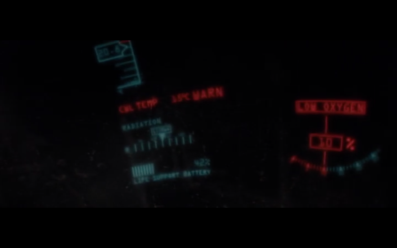 One of the most obvious perils of space travel is the lack of oxygen in space. At 15:15 seconds into the film, the camera presents a point of view shot from Stone’s perspective as she floats off into the depths of space with no way to maneuver herself back to safety. The audience gets a shot of her helmet readings revealing that she only has 10% oxygen left. The point of view shot effectively puts the audience into Stone’s situation, exaggerating the terror of the moment and reenforcing the dangers of life in space.