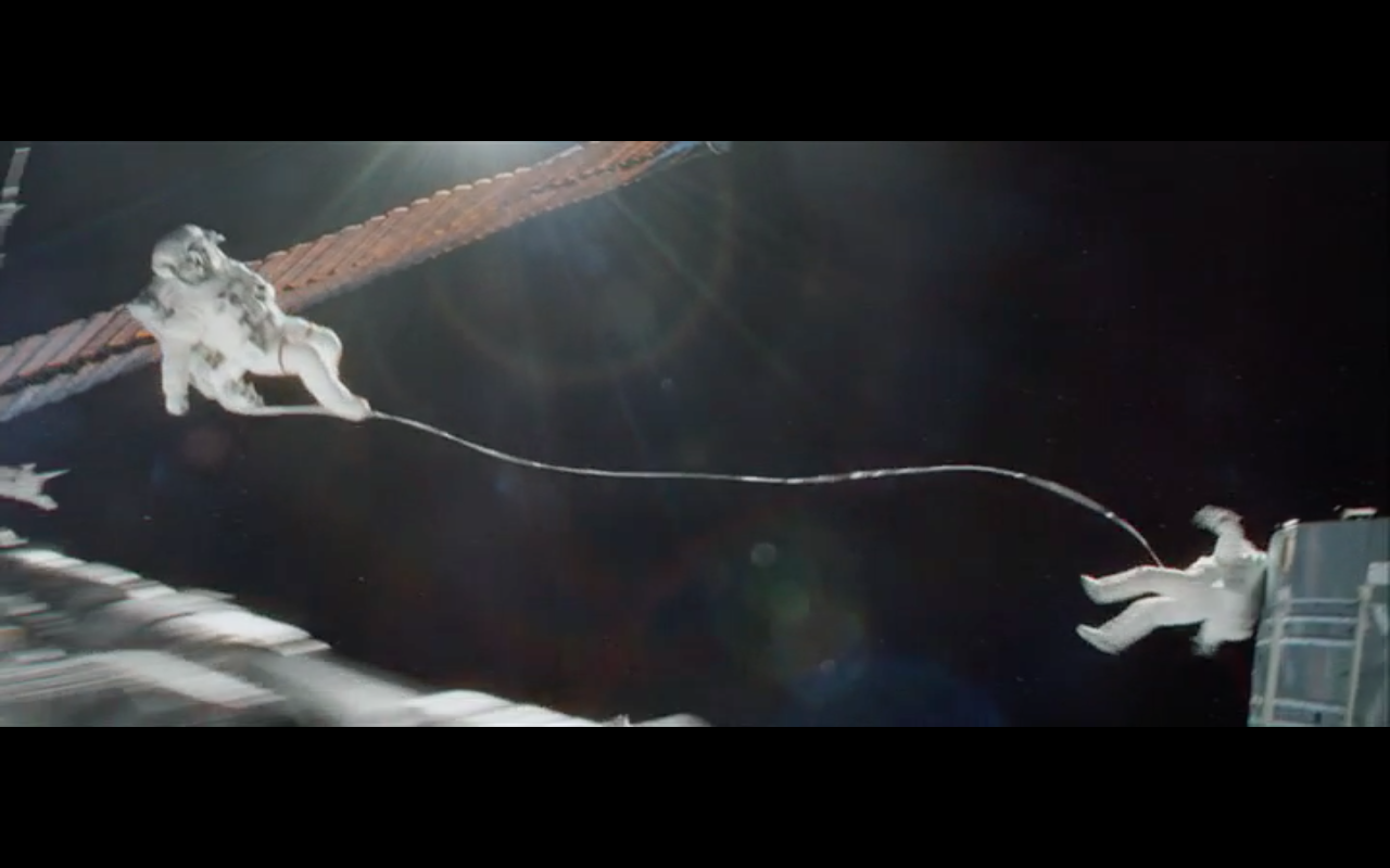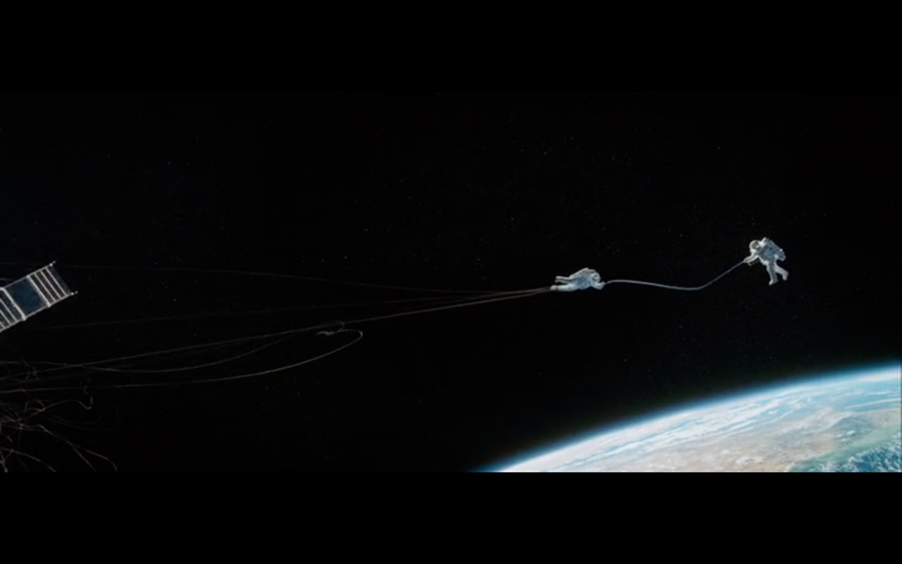 Eventually, as Stone drifts away from the ISS, her foot get caught in a net of ropes. Kowalski eventually drifts towards her where Stone grabs the tether. However, Kowalski’s momentum carries him further away from the ISS, stretching the ropes and tether until they are entirely taught. Even though Stone and Kowalski both have an object to ground themselves with, they still are helpless to control their movements. This is illustrated well by the screenshot below of Stone and Kowalski being strechced out under the laws of physics. Kowalski realizes this and understands that if Stone is to live, he must detach so that she can be pulled back to the ISS. Here, natural forces reveal itself again to be the powerful antagonist of the film, taking another victim in Kowalski.