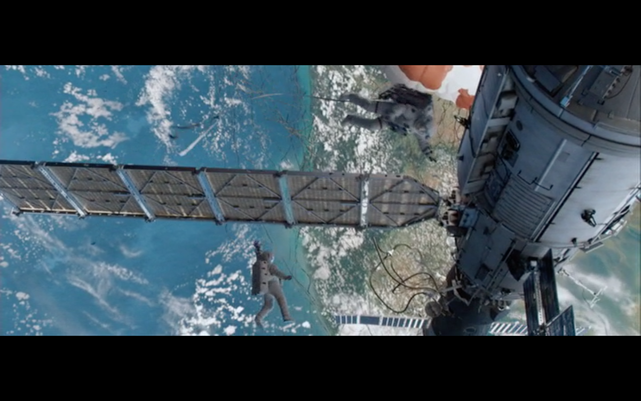 The scene begins with Stone and Kowalski tethered together as they project themselves into the shuttle. Kowalski uses all the fuel to direct them towards the shuttle, resulting in Stone and Kowalski speeding towards the ISS. At this point, with no fuel, Stone and Kowalski’s movements are entirely at the whim of the gravitational forces imposed upon them. They slam into the ISS and fly off, floating helplessly through space desperately trying to grab onto something. At one point they detach from each other, leaving Stone helplessly falling away from the ISS. All of this movement highlights the limitations of maneuvering in space. The image below, with Stone and Kowalski flailing in the foreground and the earth taking up the background, does a good job of juxtaposing the helplessness of navigation in space with the comfort and safety that earth offers.