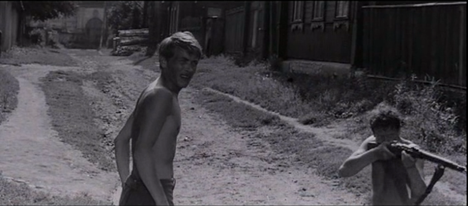 The Red and the White destabilizes the audience and uproots any chance at a cohesive narrative by omitting the use of distinct, named characters. Very few of the figures shown in The Red and the White are ever referred to by name and none have a backstory. Characters come into the story unannounced and die unceremoniously soon after. Most importantly, Jancso rejects the use of heroes in war films. Viewers rely on the trope of the protagonist as a hero. The protagonist does not always have to begin their journey as a valiant hero, but by the time the film ends, there is an expectation that they will proudly accept their hero-status. Jancso rejects the heroism of war by denying the audience a traditional hero to invest in. Similarly, he denies all of the other characters a chance to prove themselves. Jancso teases the audiences with moments of possible heroism, only to disappoint them. Twenty-six minutes into the film, two of the White Guard attempt to escape capture by the Red Guard and successfully subdue one of their assailants. Jancso provides the viewer with a very classic action-hero montage. In the image below the two nameless soldiers prepare to face off with other members of the Red Guard. The audience thinks that perhaps these two men will become the central figures of the film. However, the film quickly moves away from their story line, leaving their fate ambiguous.