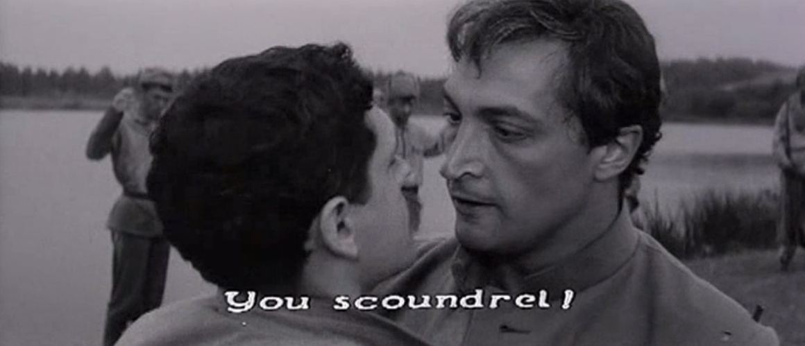 Following this sequence, the film turns to the farm of an innocent civilian family. Jancso introduces one of the few named characters, J. Glazunov, Lieutenant of the White Guard. The evil J. Glazunov orders the father of the family killed and sexually harasses one of the young women, forcing her to disrobe in front of him. With the introduction of a clear villain, mustache and all, the audience assumes that the hero will sweep in to save the family. Instead, the father’s death and woman’s violation happen in almost complete silence. The other family members do not scream in protest. J. Glazunov gives no evil monologue explaining his actions. He then dies less than five minutes after these events as punishment for his crimes. The simplistic treatment of these moments keeps the audience from caring too deeply about any character. By the time Glazunov dies the audience realizes that each character’s life on screen is ephemeral. Even with this knowledge the viewer still holds out for the arrival of a hero because it is impossible to imagine a war movie without one. Finally, fifty-one minutes in, the film introduces a character that most resembles the classic war hero. Commander, as the other soldiers refer to him as, makes his entrance in defense of men about to be shot for supposed cowardice.
