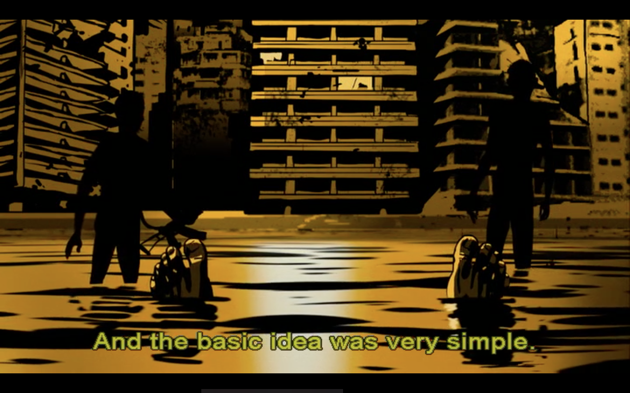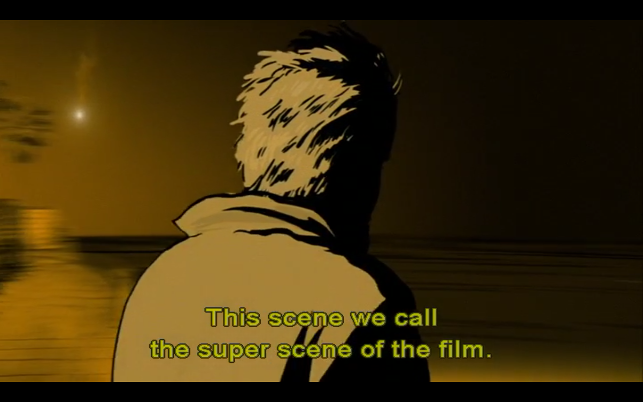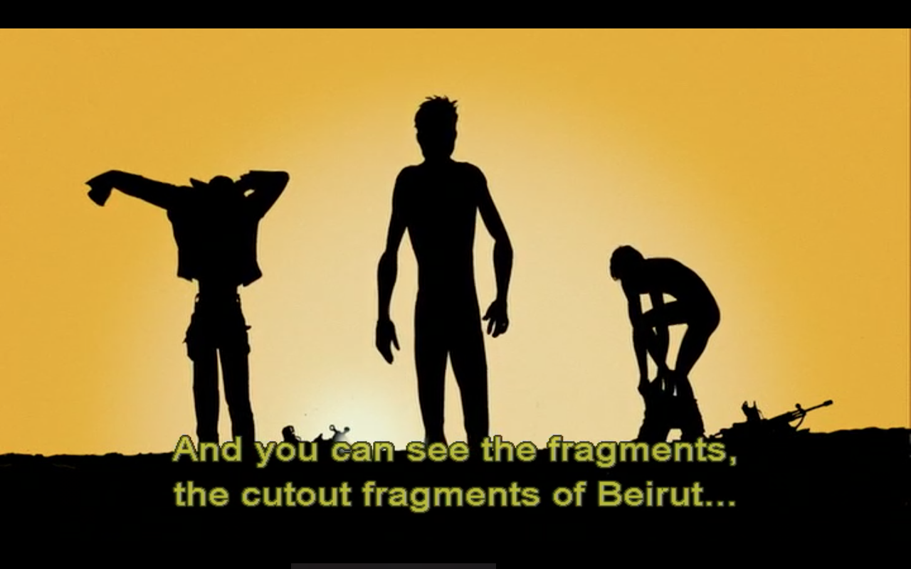 [Figure 1][Figure 2][Figure 3][Figure 4]This is a prelude into the scene of the rise from the sea, which reappears three times throughout the film and serves as the driving force behind Folman’s desire to recover his memory. Not only does it portray a strange amalgam of destruction and birth through its evolutionary appearance, but also introduces the trend of blurring reality and illusion.