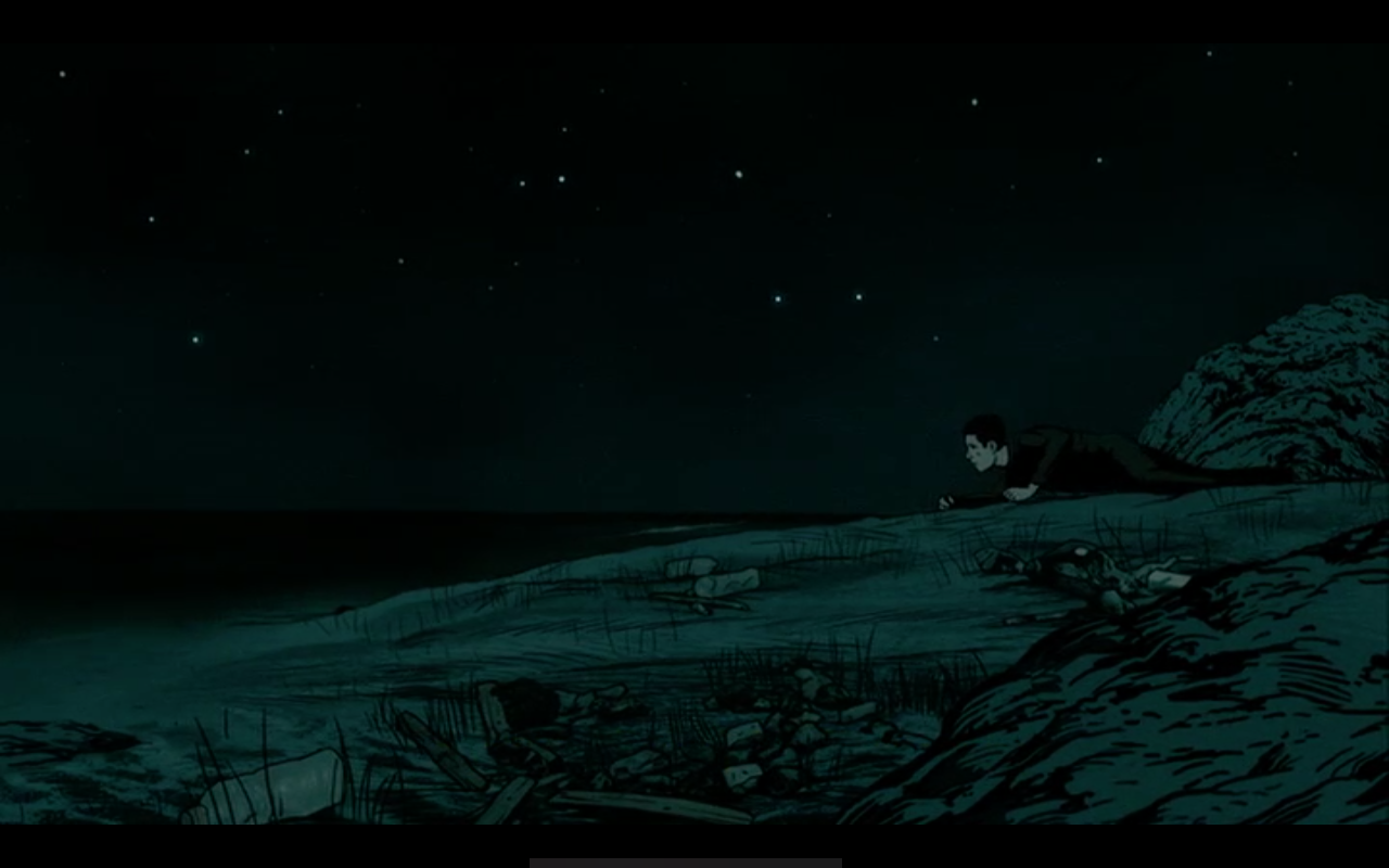 [Figure 27][Figure 28]Lastly, the crawling into the water from the beach in Figure 27 illustrates a regression into a space of protection and infancy similar to Folman and Cna’an’s child-like state when in the sea. Then Figure 28 portrays a coming out of a protected state and future confrontation with reality– in Folman’s case the realisation of the massacre as he is surrounded by the wailing women, and in Dayag’s the guilt of survival and cessation of visiting his friends’ graves.