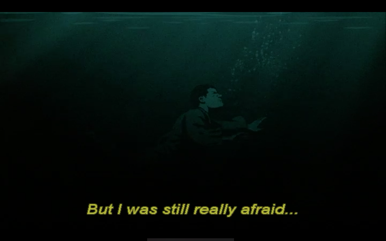 Similarly, Cna’an has his own hallucination involving the sea that is embodied as a woman come to “take [him] for the very first time.” It is revealed that as a very bright but “nerdy” eighteen year old, he had an urge to prove his manliness and capability, which included being acknowledged by women. And thus he slips into sleep as a means of escape from reality, stating that “even now, I escape into sleep and hallucinate.” The hallucination here is clearly distinguished from reality through the mysterious tone of the music that accompanies the swimming woman in Figure 15, as well as the sudden and almost eerie brightening of the background between Figure 13 and Figure 14 (similar to the sudden flares that appear in Folman’s hallucination).