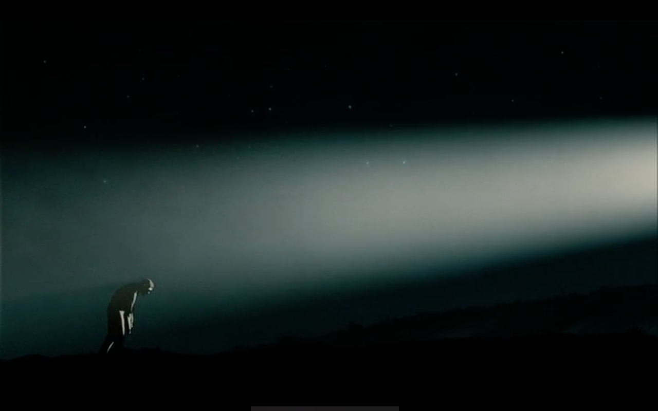 [Figure 9][Figure 10][Figure 11]The change in location of the subject in Figure 9, as well as his younger face illuminated by the flares and the sparkling lights surrounding his naked body bring the viewer fully into a different space. The use of the POV shot transports the viewer closer to Folman but also creates a disorienting perception of narrative that goes between this POV shot and a wider angle (Figure 11) that depicts Folman in the background and instead highlights Cna’an’s presence and importance at the location. Yet as the narrative focus becomes opened even further, created through the use of the following silhouette shot in Figure 12, a more universal image is introduced.