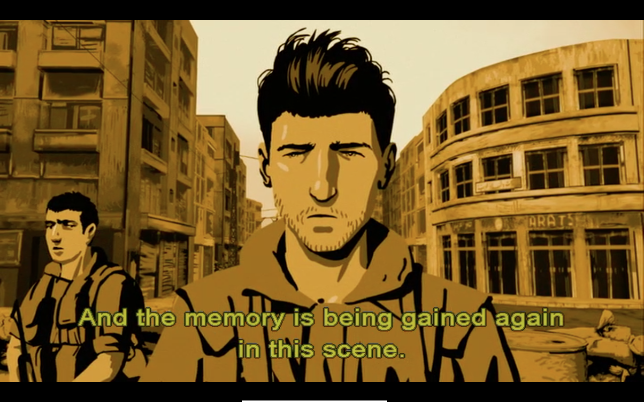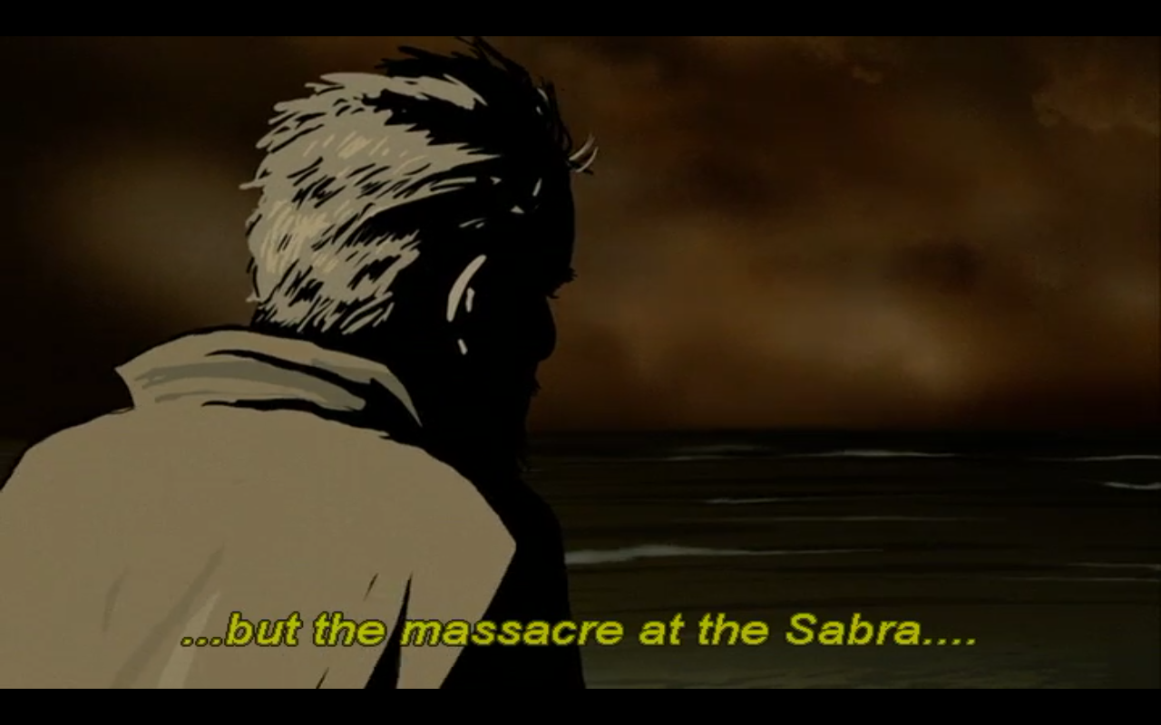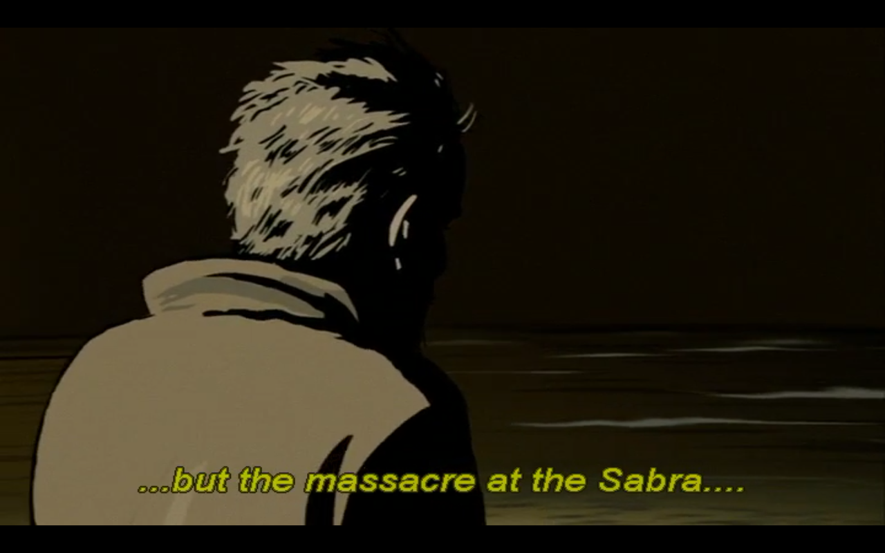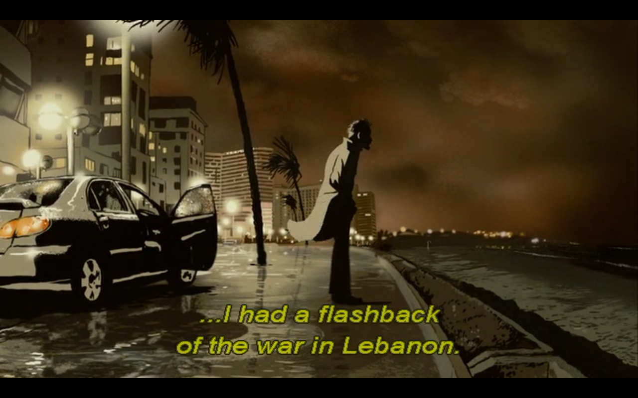 Ari Folman’s Waltz with Bashir first stands out to us because of its use of animation despite its identification as a documentary film– how can a non-fiction narrative be justly portrayed using highly stylised illustration? Yet it is evident by the end that the medium of animation not only allows the viewer to easily cross over any visual and temporal boundaries but also turns around and forces the boundary to be redrawn in a harsh awakening. Thus the documentary footage, hallucinations and flashbacks can all be presented on the same visual plane, that is, until the film’s final clip. Similarly, the characters themselves are enveloped in their own safety nets of self-induced amnesia and coping mechanisms that at once shield them from PTSD symptoms but also help to propagate them.