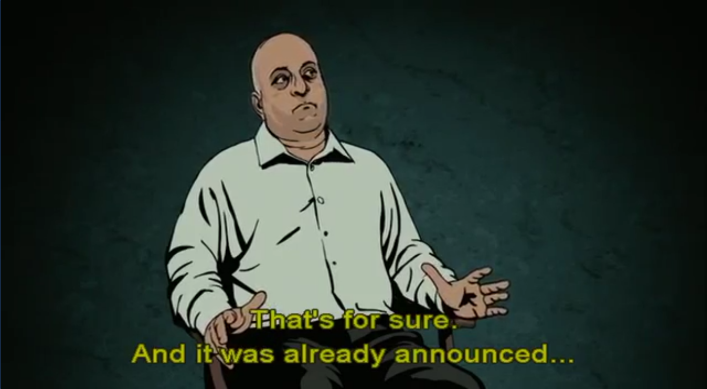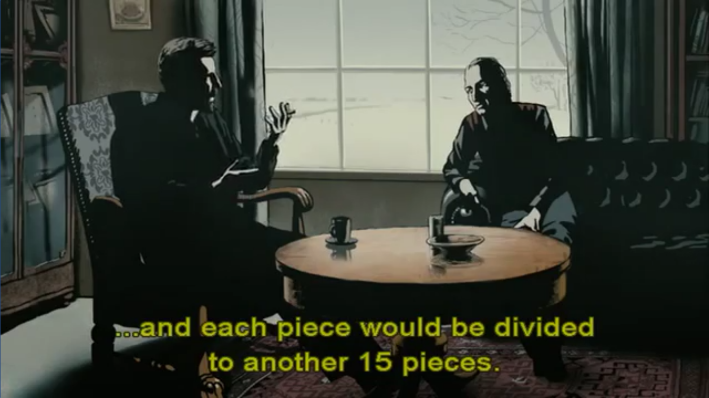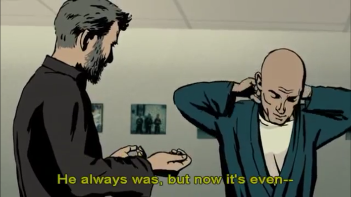 It is true that the characteristics of animation serve to emphasize inexact nature of the dreamscape and the memories, but one may argue that animation is not justified in its use when depicting simple interviews scenes. It is true that the simplistic interview scenes such as the one below are seemingly excessive if one considers why one uses animation to portray the scenes of dreamscape and memory.