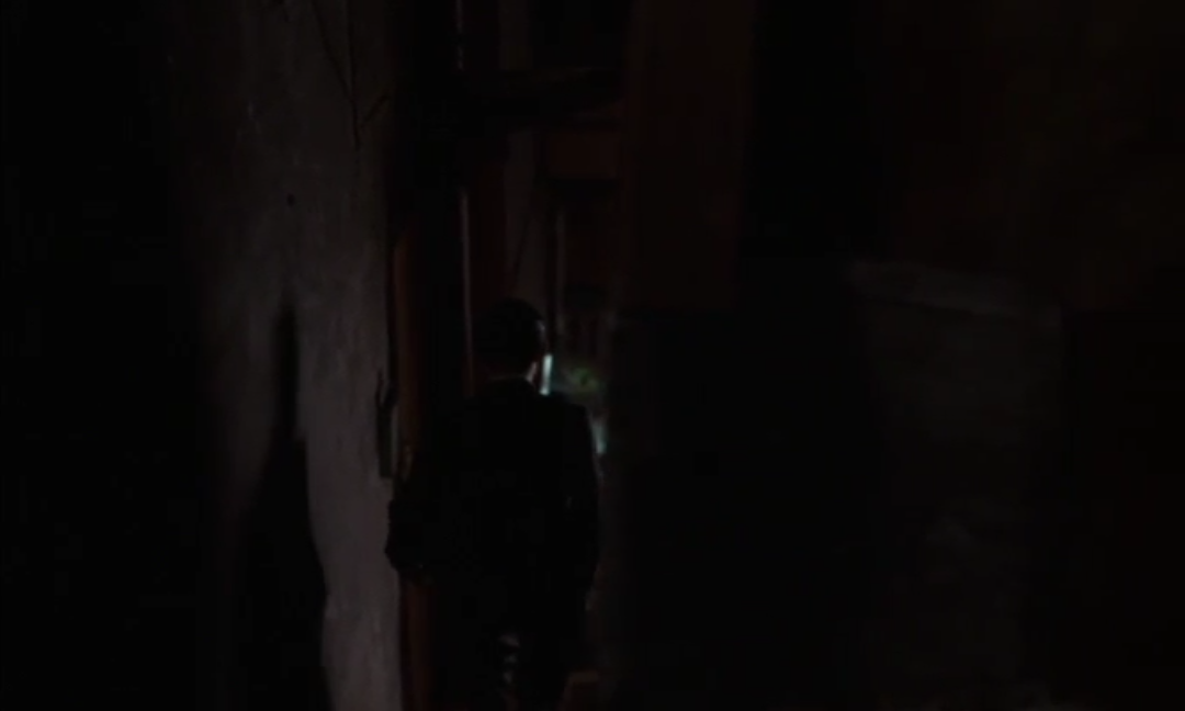 Here the light is once again very dramatic in its sharpness and the dramatic and physical tension it provides. The above frame is particularly poignant because of the shadows present. The single thrown by Chow is lonely and stark against the wall, and also carries narrative significance because it is alone, not accompanied by Su’s shadow – as they are parting. But what is perhaps even more poignant is the shadows of bars that are cast over the characters, because they can be read to have a metaphorical significance: bound by societal convention and scrutiny of neighbours – imprisoned by convention and expectation – Su and Chow must always be secretive and must now even say good-bye (or prepare to) in secrecy.