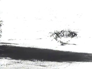 From surfers, we transition to motorized water sports. A series of waterskiing and boating jumps concludes with one in which a daredevil boater is ejected from his boat and lands on dry ground. From here, we transition to bicyclists (riding absurdly-proportioned bicycles), to a tiny motorized cart, through dirt bikes struggling to progress through mud. Finally, we end with a plane – a plane that promptly crashes back into the water. For the first time since we first faded up on the submarine, the film cuts to black.