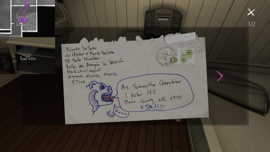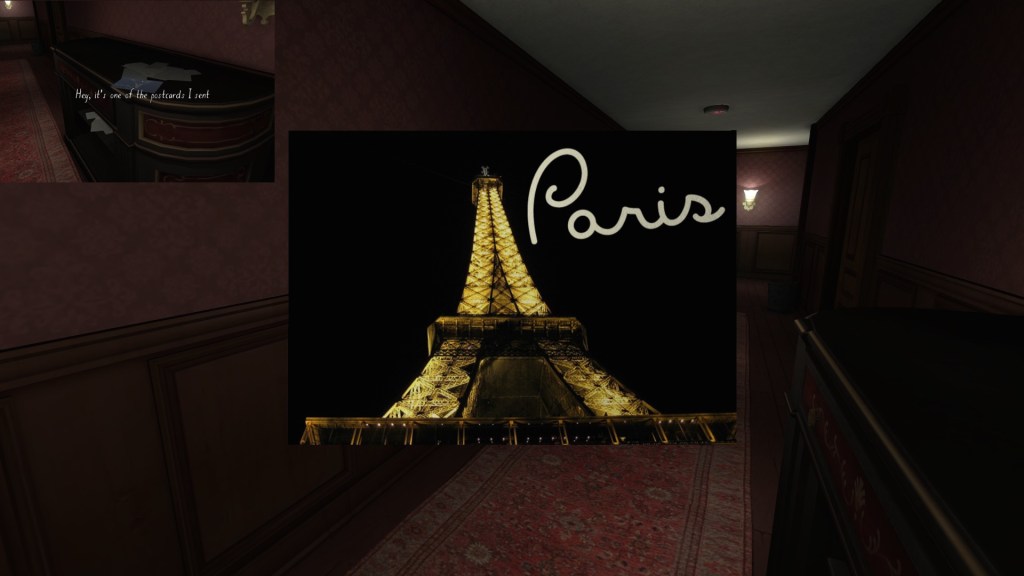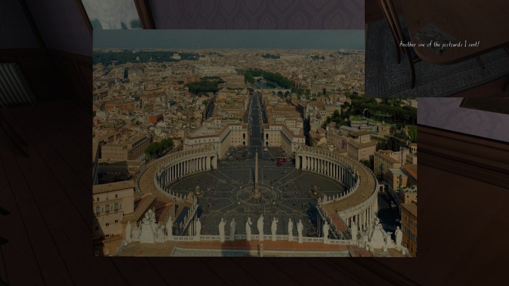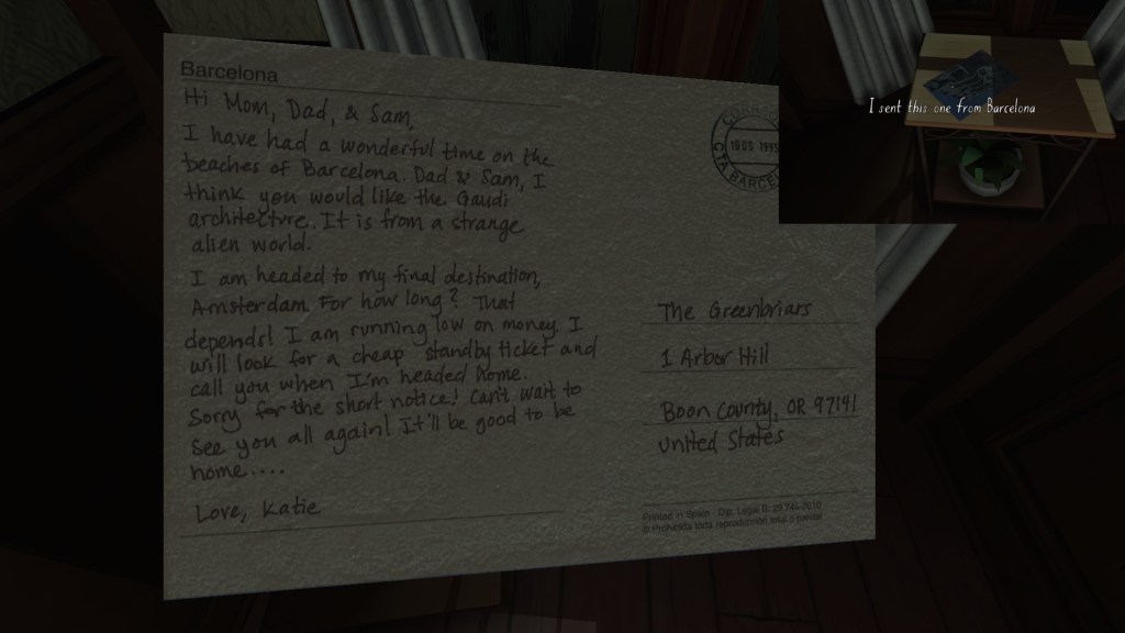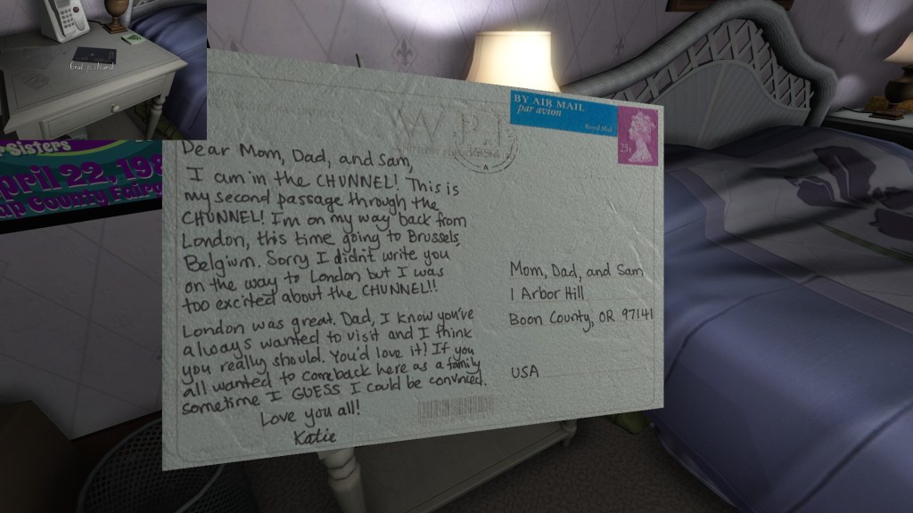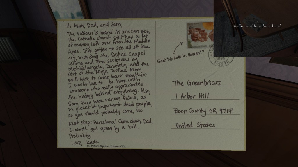 Finally, a series of postcards dotted around the house let us know what Katie was up to this past year, while the family was dealing with its various dramas. I’ve only found four of these, which seems like a small number. Perhaps I’m missing one or two? I’ll update this guide in the future, if I find more.