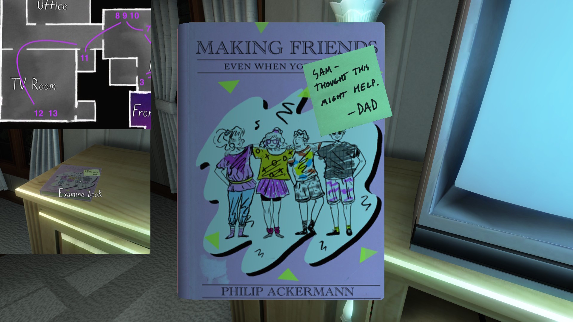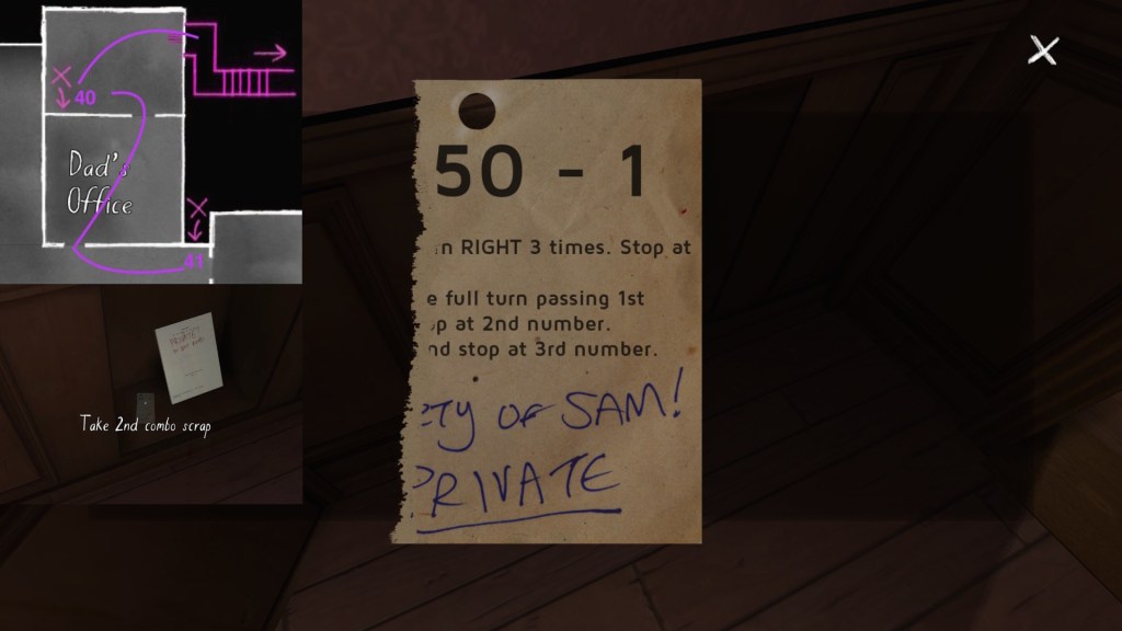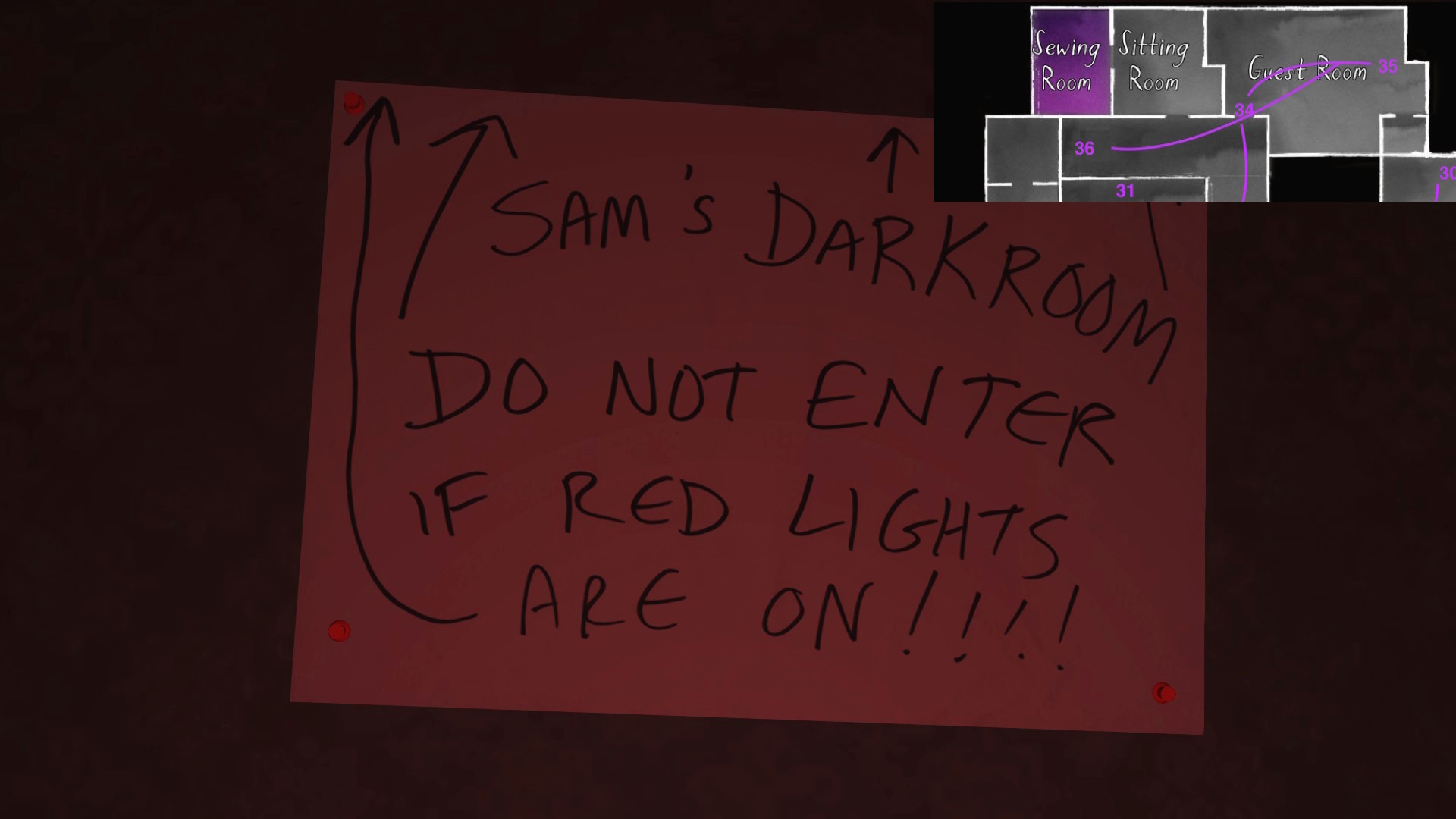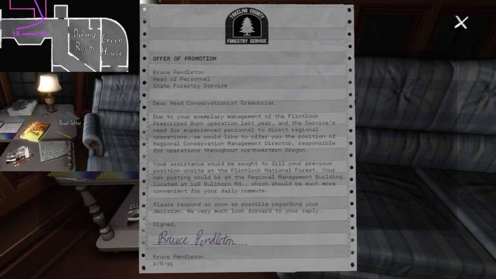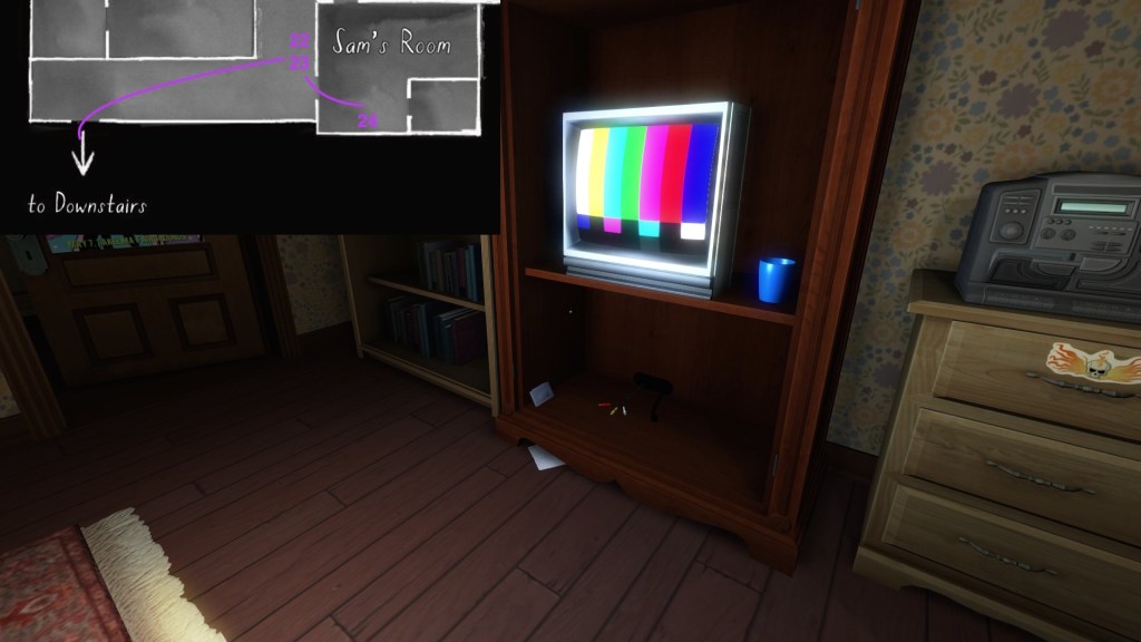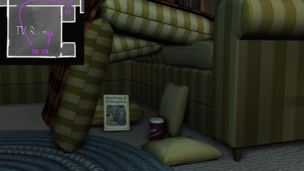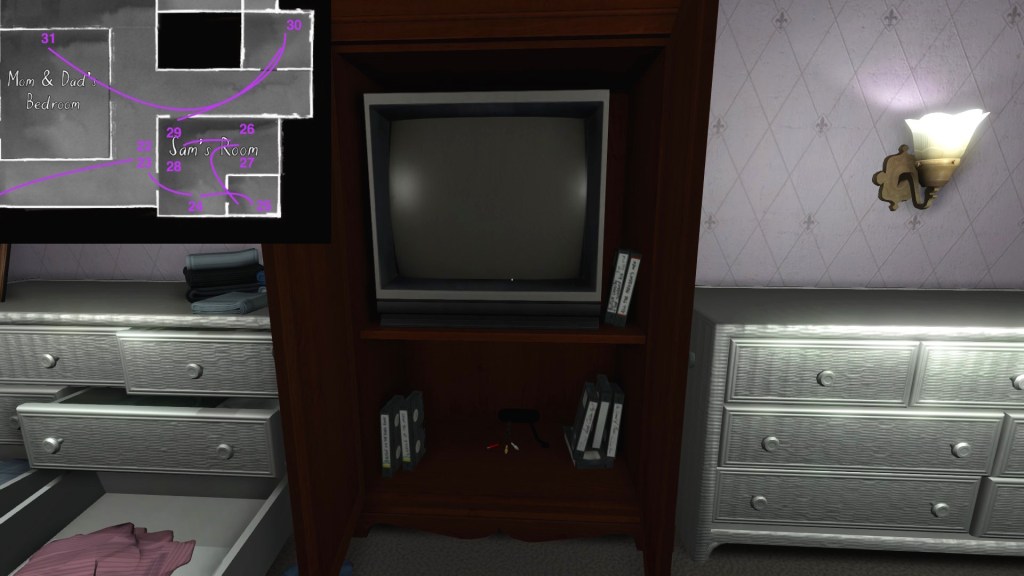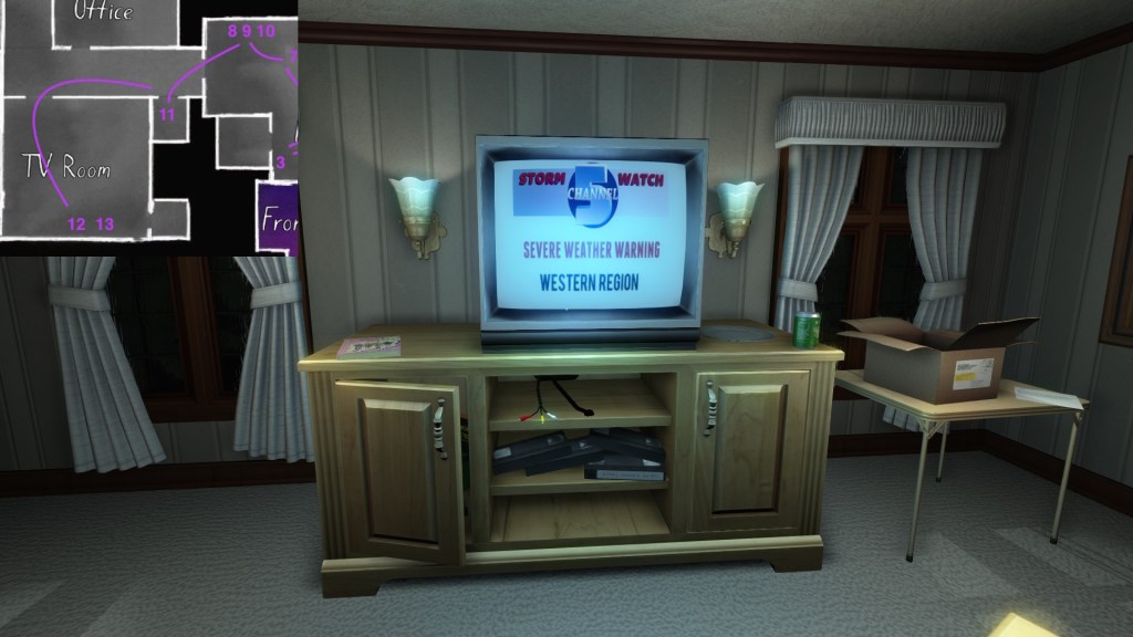 • Looking only at the map, it might seem to make more sense to explore Terry’s office before the TV room. The sound of the severe weather warning, though, combined with the glow of the TV, provide subtle attention-grabbing cues that are likely to funnel players in there first, I think.