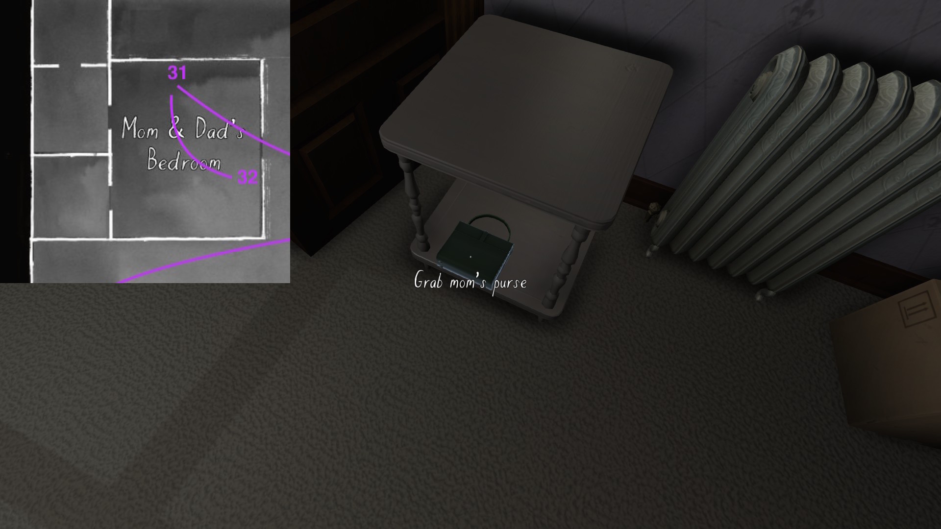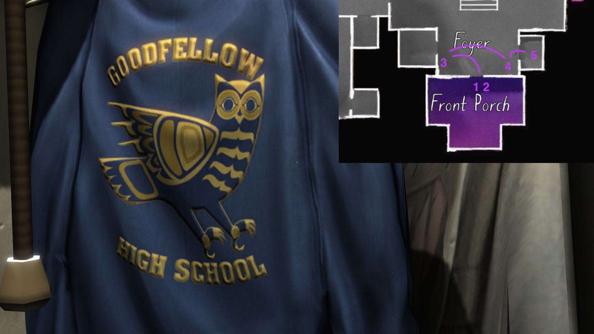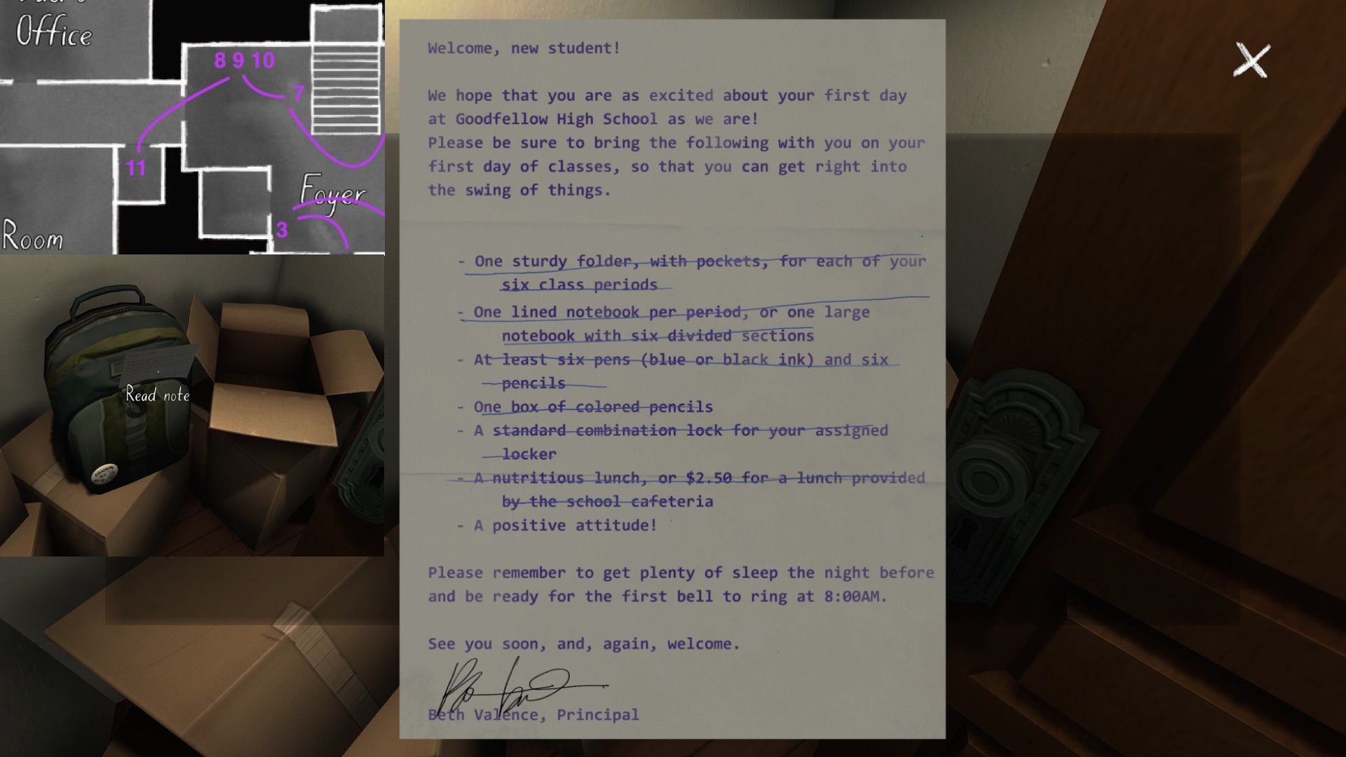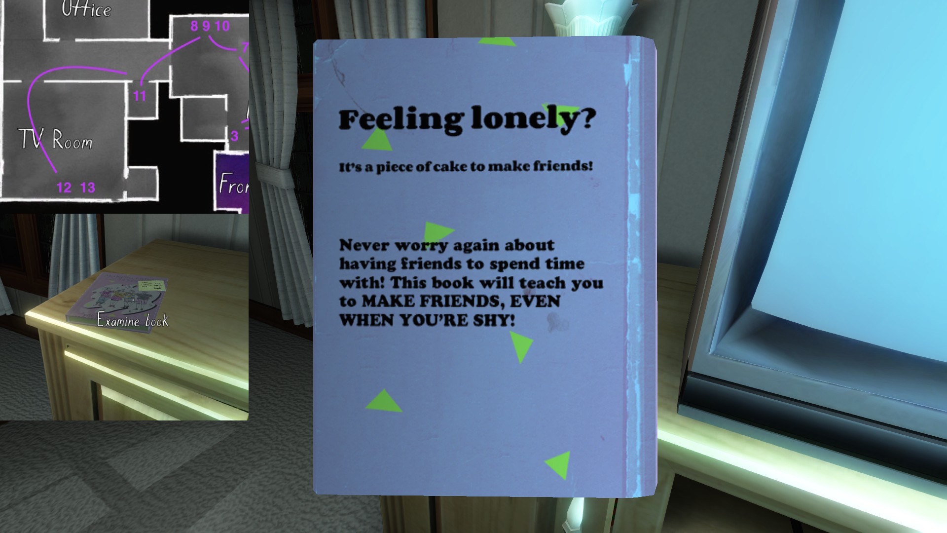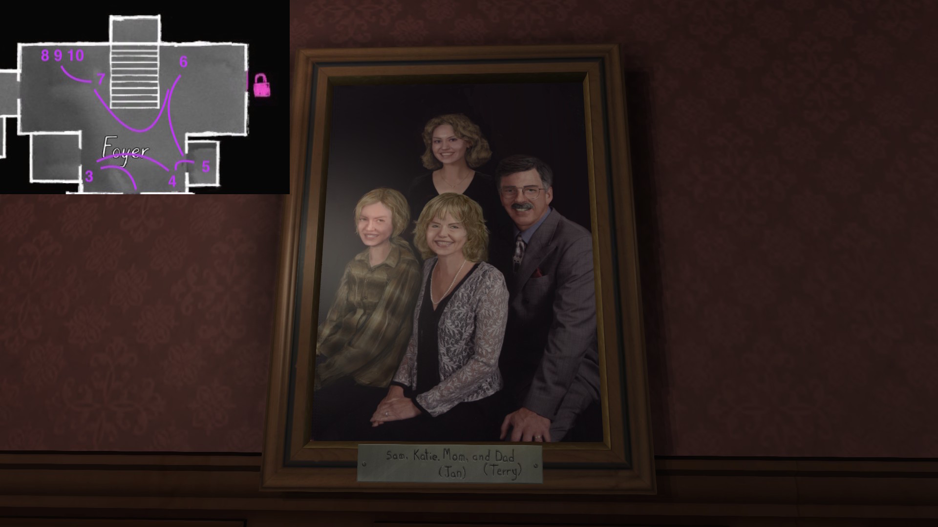 • Looking only at the map, it might seem to make more sense to explore Terry’s office before the TV room. The sound of the severe weather warning, though, combined with the glow of the TV, provide subtle attention-grabbing cues that are likely to funnel players in there first, I think.