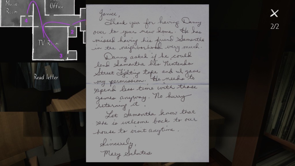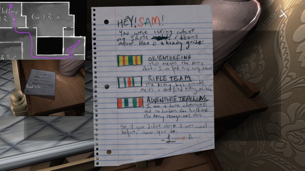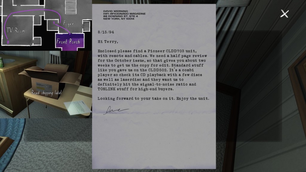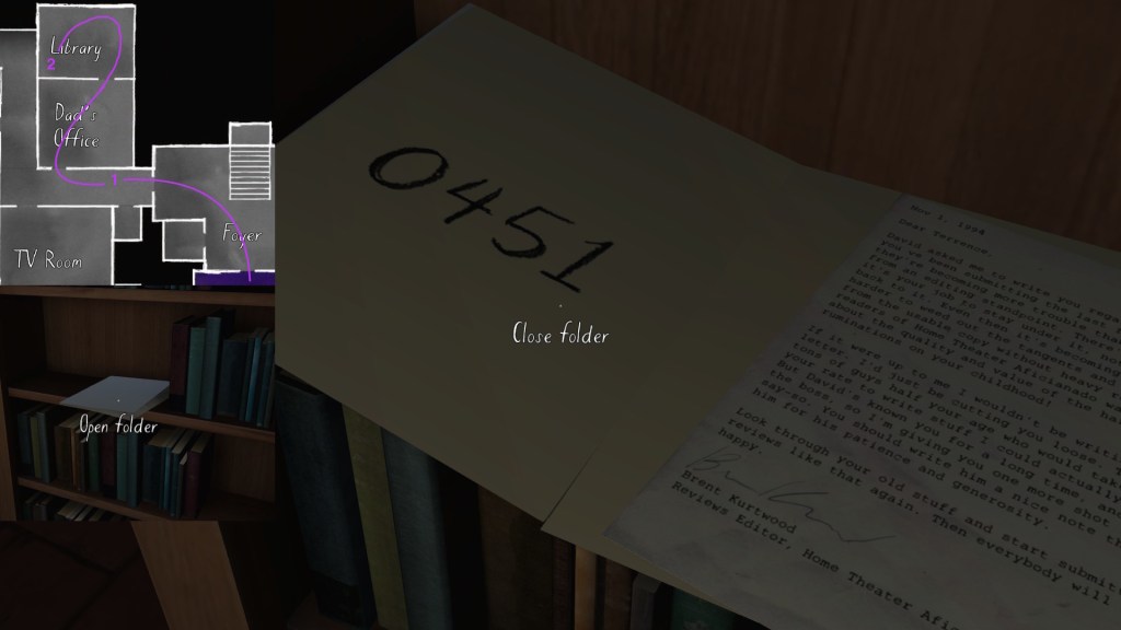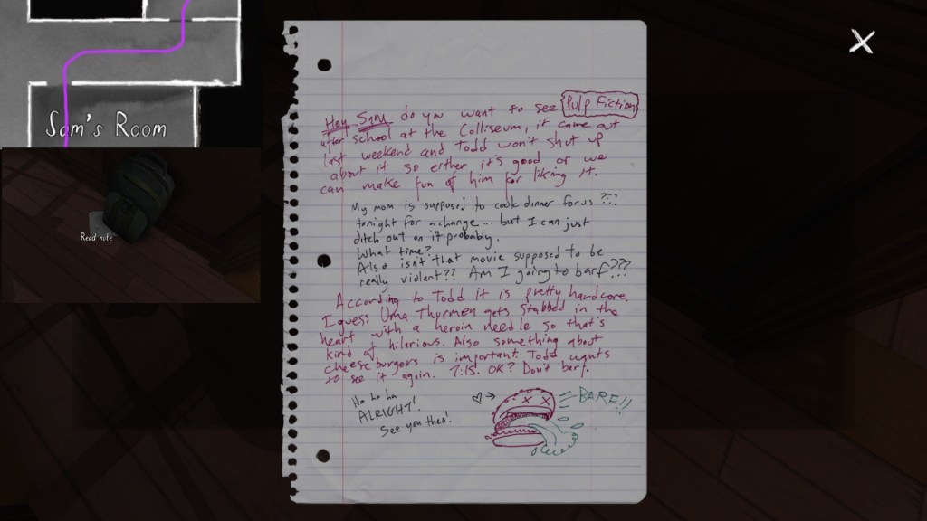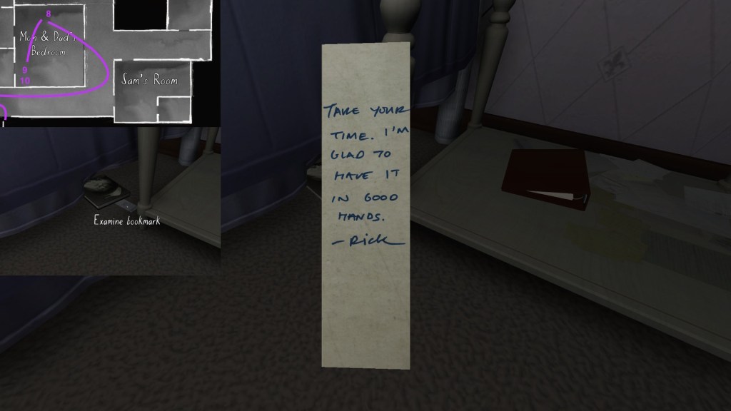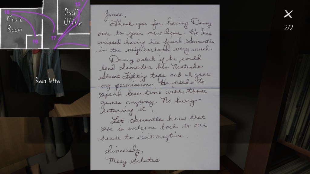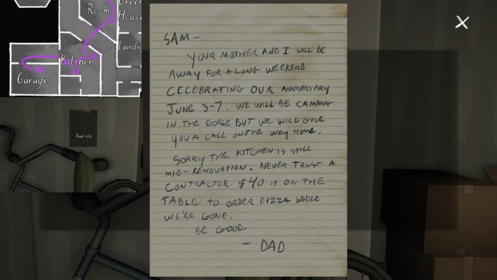 Two weeks ago, I taught Gone Home (The Fullbright Company, 2013) for my “Frames, Claims and Videogames” course. I hadn’t played the game in quite some time, so, in the run-up to the course, I re-played it, searching through the house exhaustively, reminding myself of where every last note and prop was, re-acquainting myself with the ins and outs of everyone’s story. Taking some notes, it occurred to me that it would be nice if there was a guide to it online. Not just a guide to picking up all of the items that give you achievements, or something like that—there are plenty of those online, already. Rather, a guide to the stories Gone Home tells, and where exactly you can find the environmental elements that move those stories forward, and flesh it out.