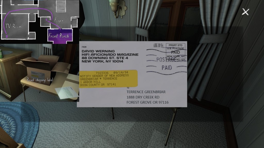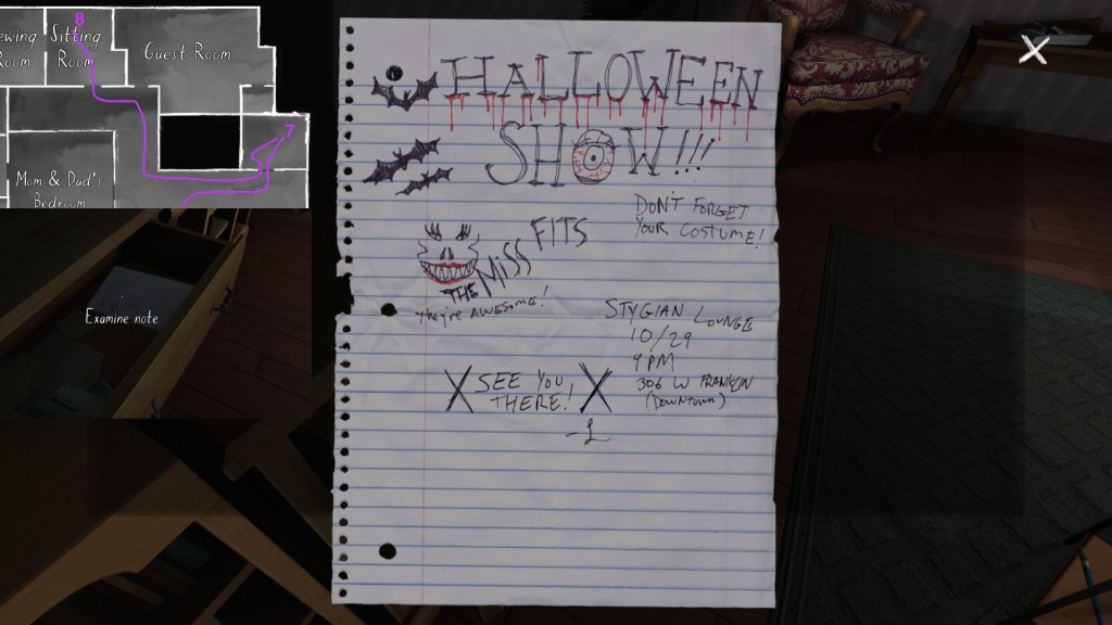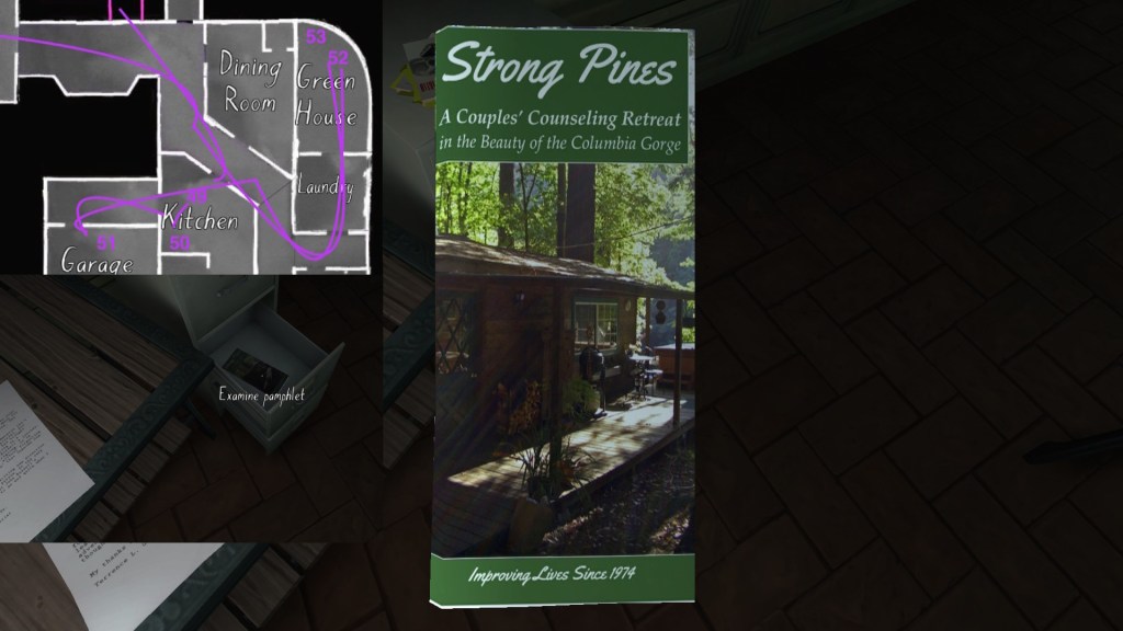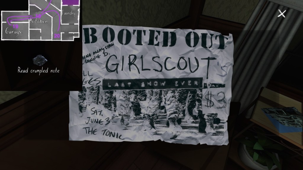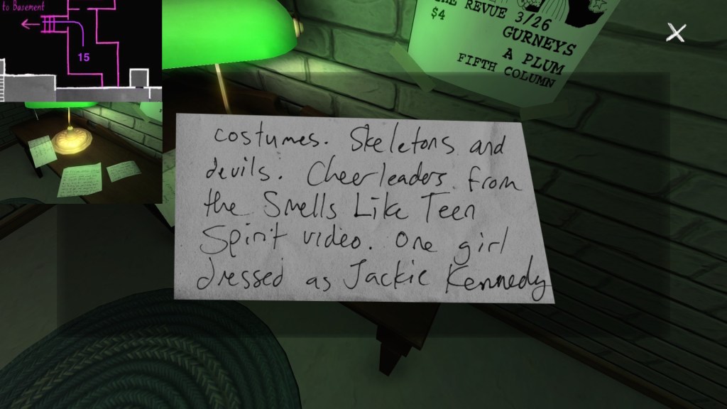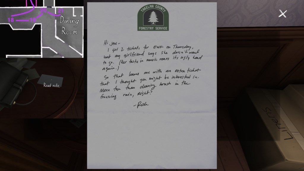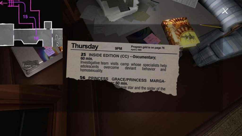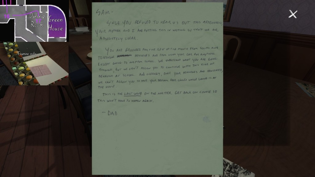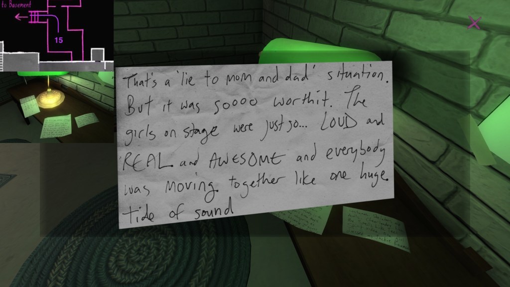Two weeks ago, I taught Gone Home (The Fullbright Company, 2013) for my “Frames, Claims and Videogames” course. I hadn’t played the game in quite some time, so, in the run-up to the course, I re-played it, searching through the house exhaustively, reminding myself of where every last note and prop was, re-acquainting myself with the ins and outs of everyone’s story. Taking some notes, it occurred to me that it would be nice if there was a guide to it online. Not just a guide to picking up all of the items that give you achievements, or something like that—there are plenty of those online, already. Rather, a guide to the stories Gone Home tells, and where exactly you can find the environmental elements that move those stories forward, and flesh it out.