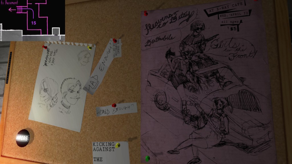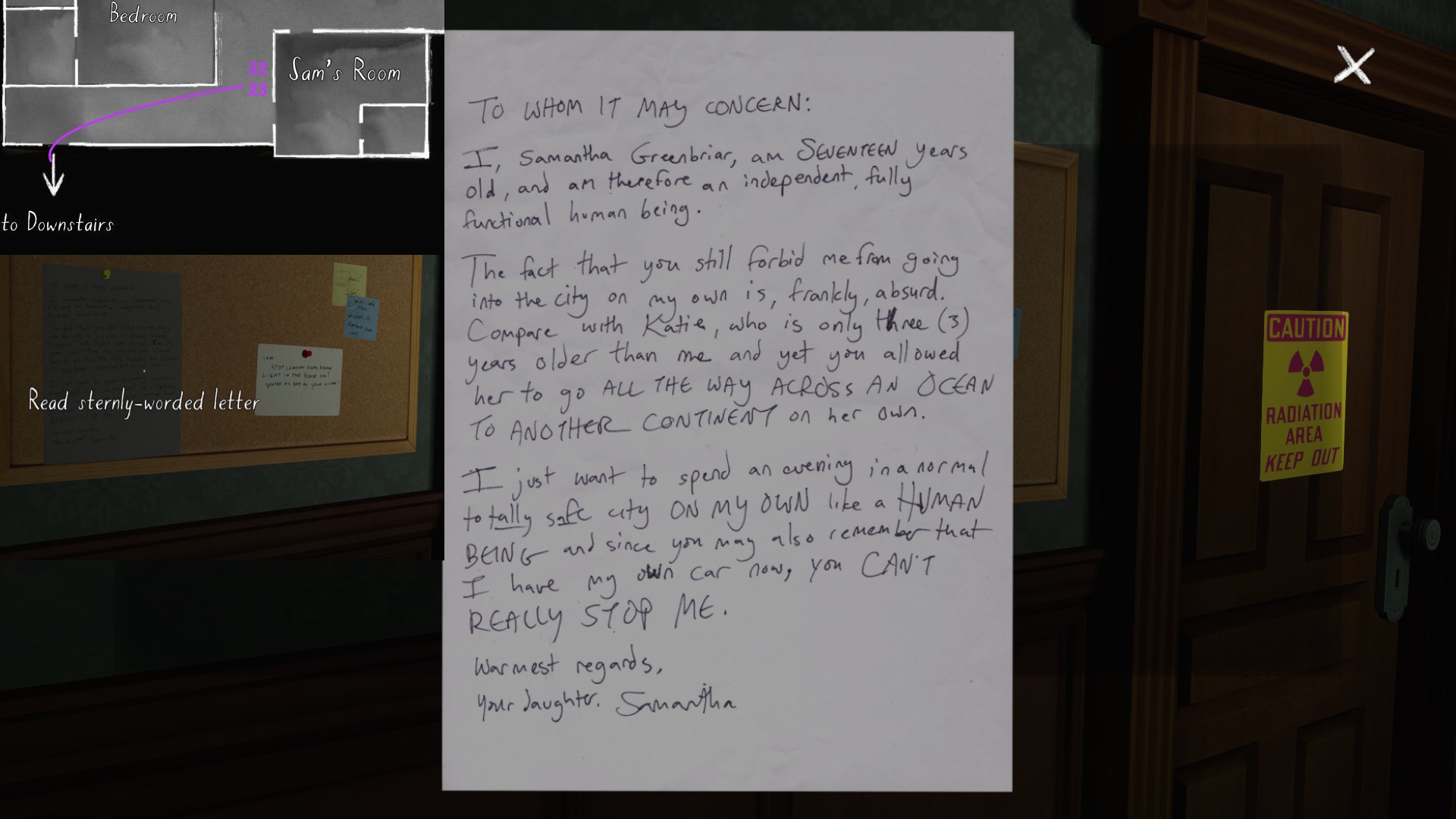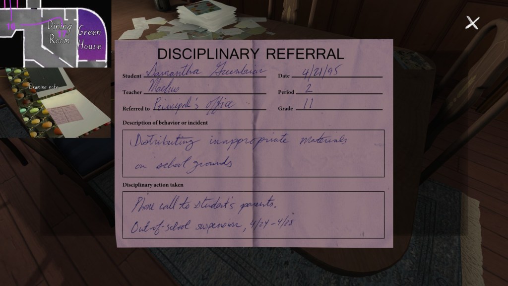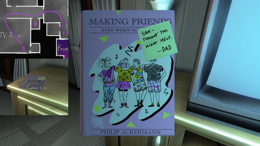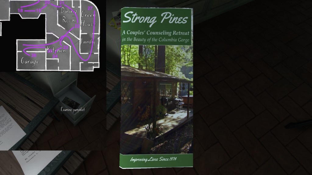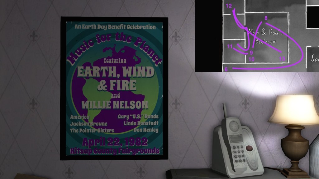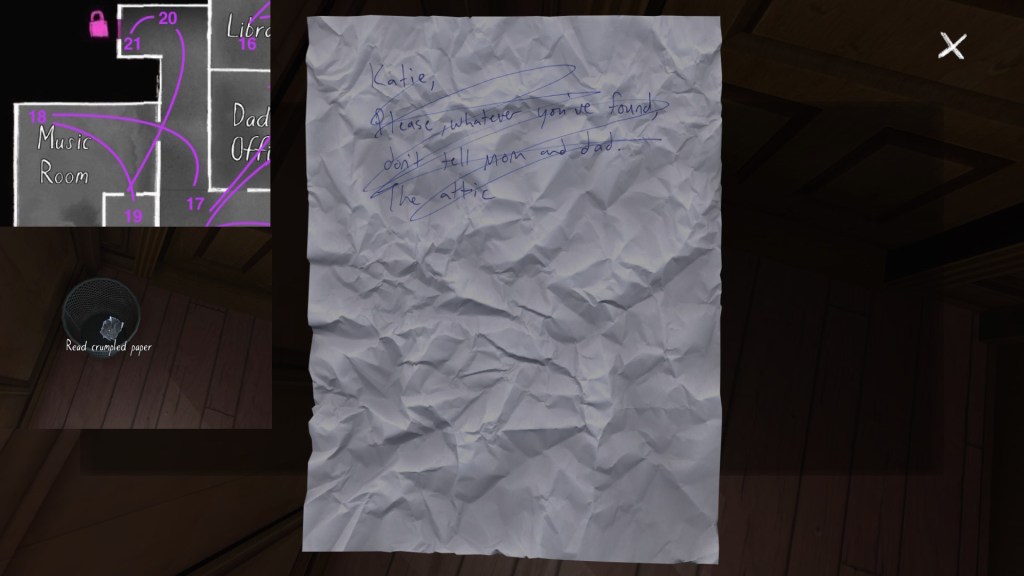 Two weeks ago, I taught Gone Home (The Fullbright Company, 2013) for my “Frames, Claims and Videogames” course. I hadn’t played the game in quite some time, so, in the run-up to the course, I re-played it, searching through the house exhaustively, reminding myself of where every last note and prop was, re-acquainting myself with the ins and outs of everyone’s story. Taking some notes, it occurred to me that it would be nice if there was a guide to it online. Not just a guide to picking up all of the items that give you achievements, or something like that—there are plenty of those online, already. Rather, a guide to the stories Gone Home tells, and where exactly you can find the environmental elements that move those stories forward, and flesh it out.