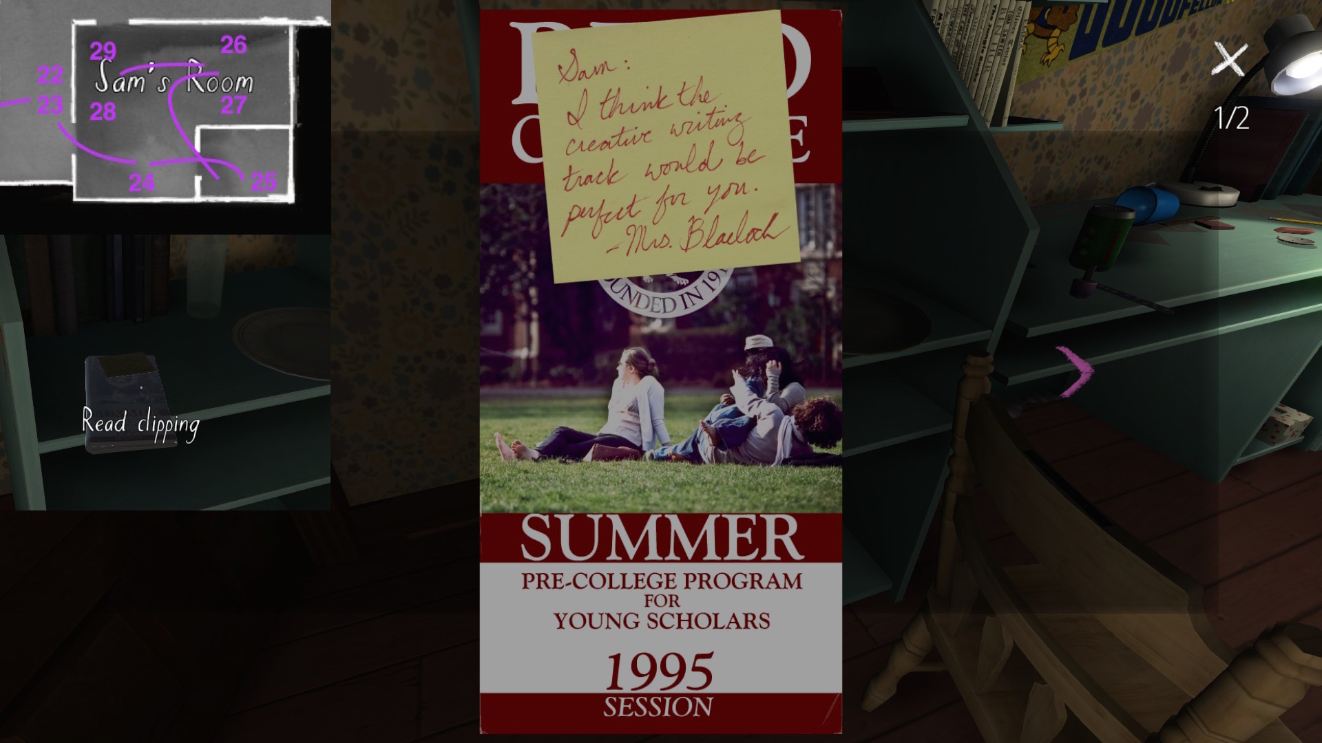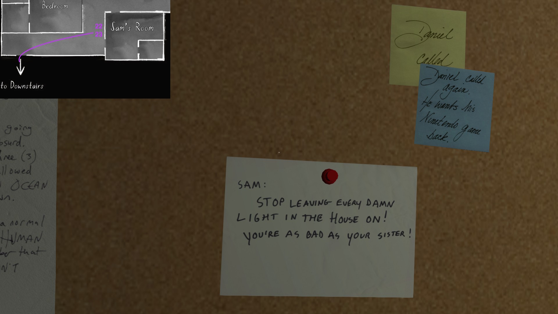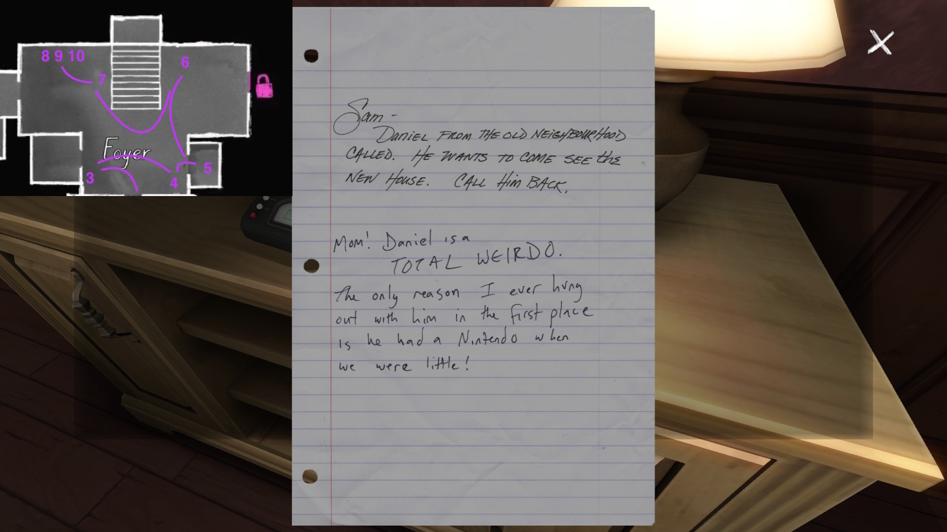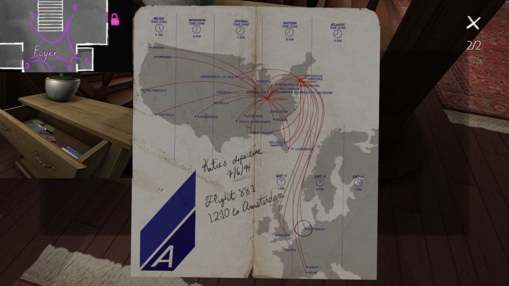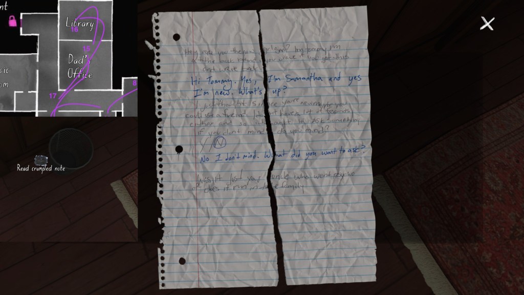 Two weeks ago, I taught Gone Home (The Fullbright Company, 2013) for my “Frames, Claims and Videogames” course. I hadn’t played the game in quite some time, so, in the run-up to the course, I re-played it, searching through the house exhaustively, reminding myself of where every last note and prop was, re-acquainting myself with the ins and outs of everyone’s story. Taking some notes, it occurred to me that it would be nice if there was a guide to it online. Not just a guide to picking up all of the items that give you achievements, or something like that—there are plenty of those online, already. Rather, a guide to the stories Gone Home tells, and where exactly you can find the environmental elements that move those stories forward, and flesh it out.