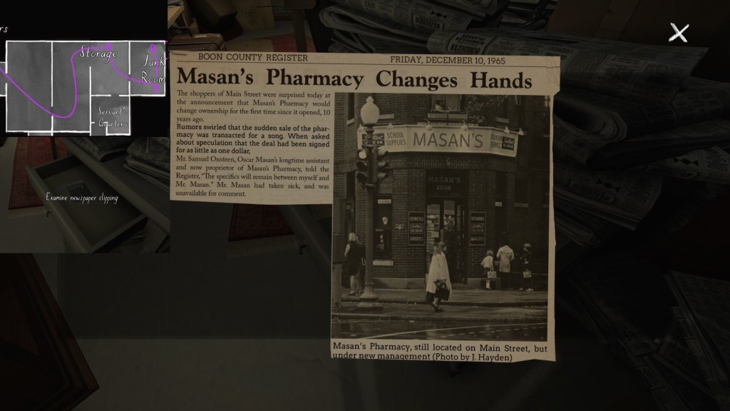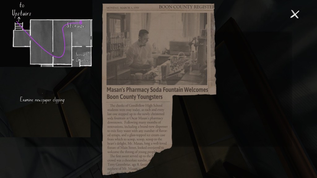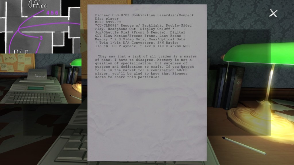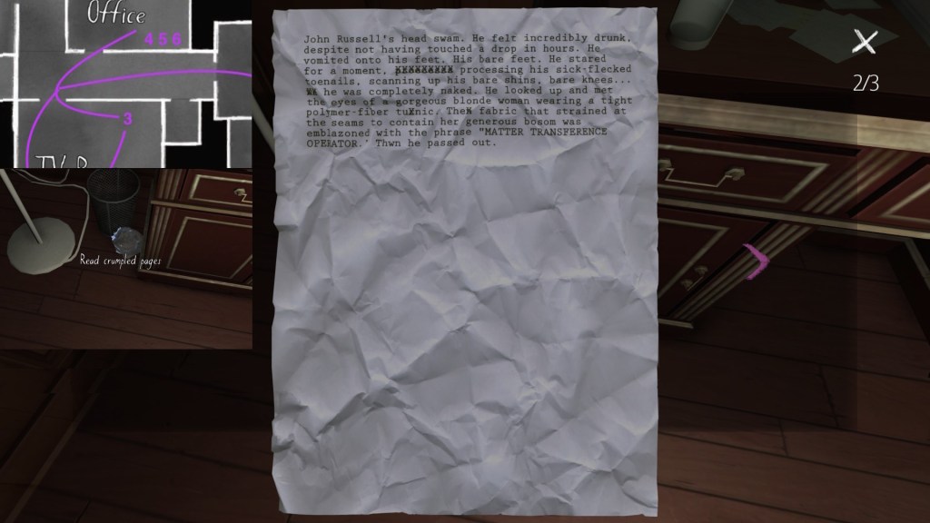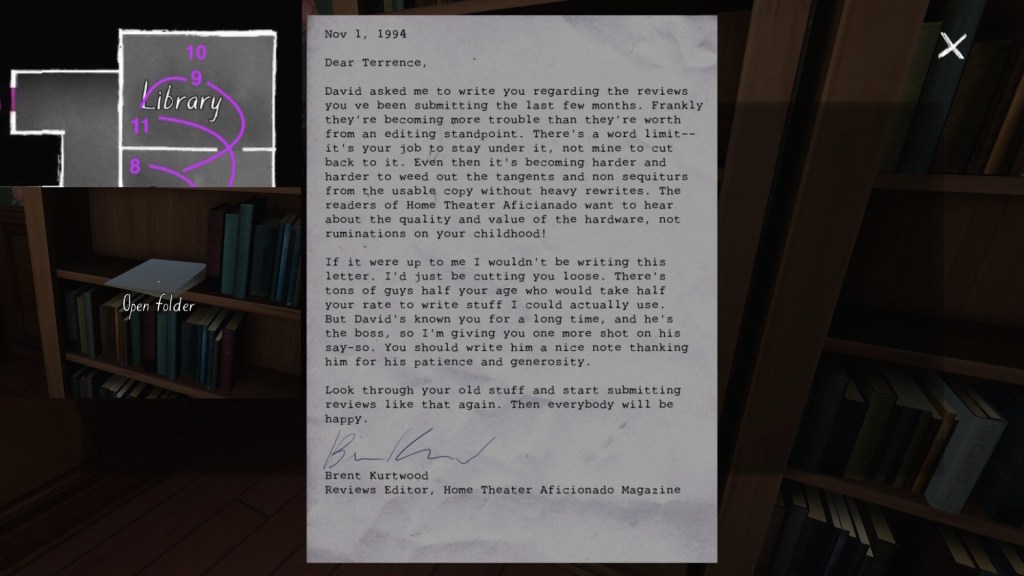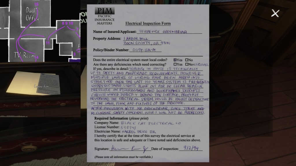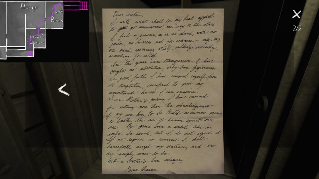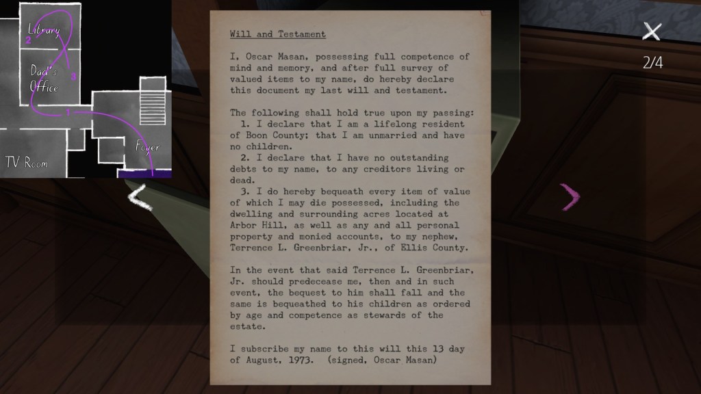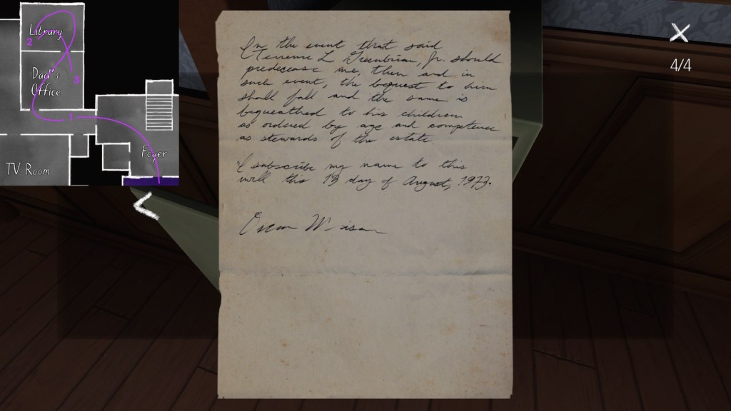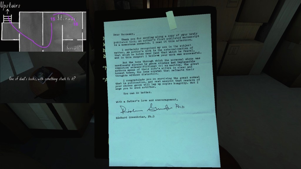 The story of Oscar Maran and his relationship to his nephew, Terry Greenbriar, is difficult in two respects. First, it is difficult simply because it is the toughest to piece together. Its key documents are among the toughest to find in the game, and even when you have everything in front of you, it still requires some amount of interpretive effort to pin everything down. (It is a far cry from Sam and Lonnie’s story, in this regard.) Fully piecing everything together requires not just reading documents, but also paying close attention to other environmental details, such as objects located in strange places. It is a master class in subtle environmental storytelling.