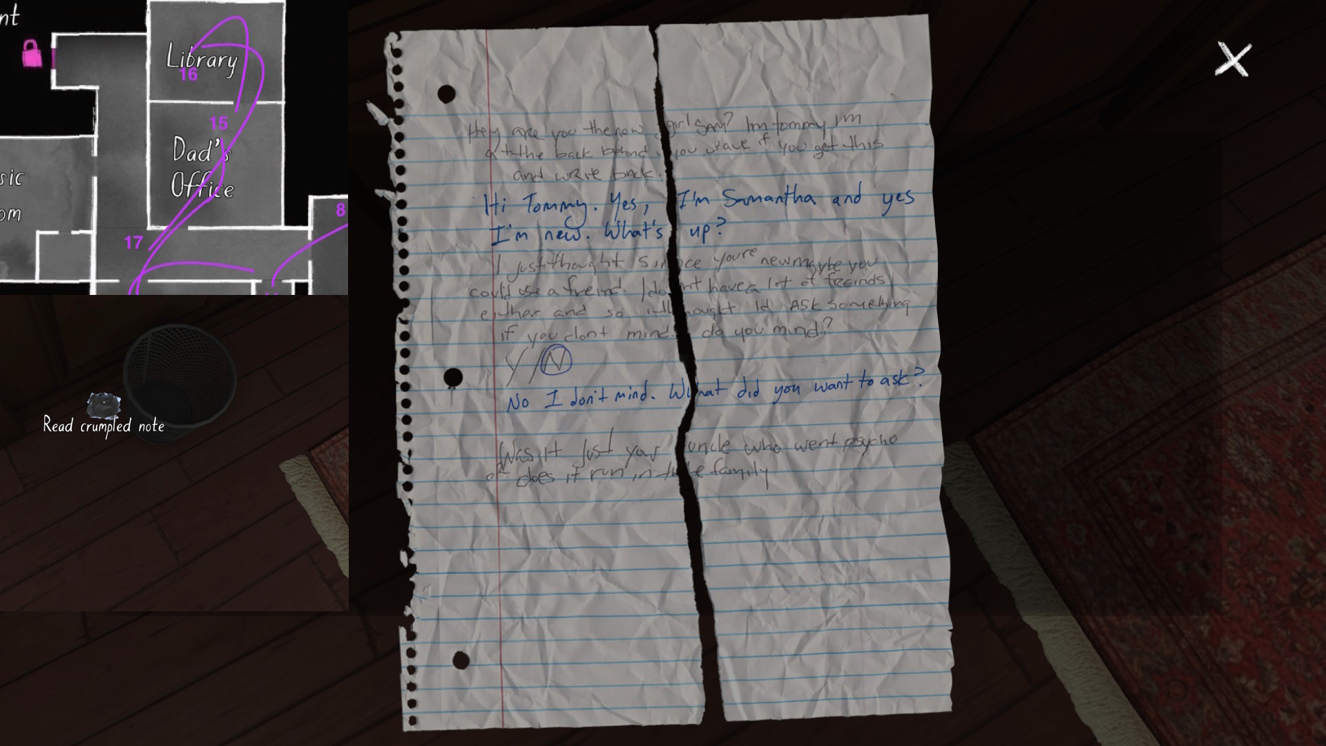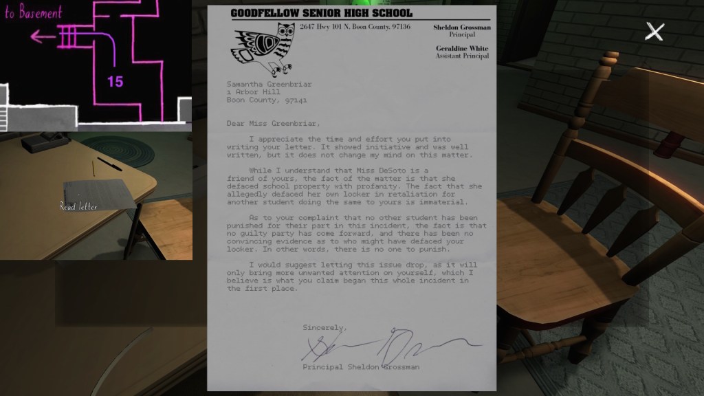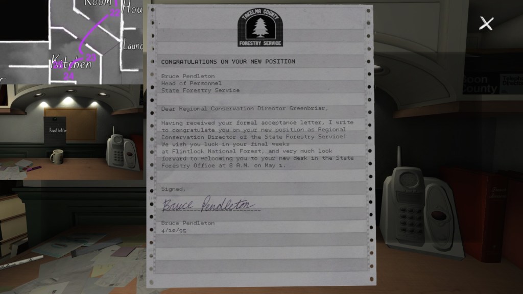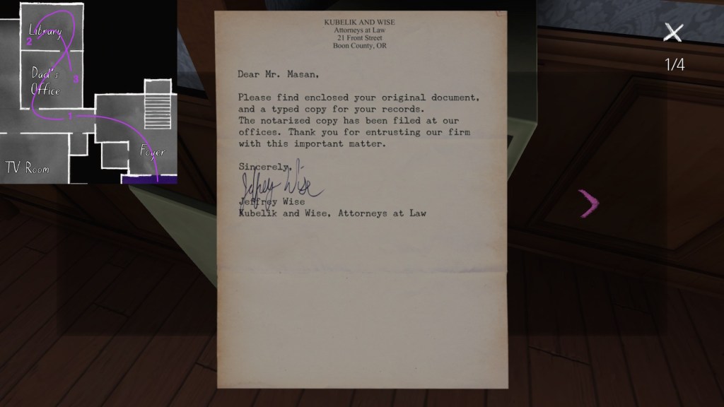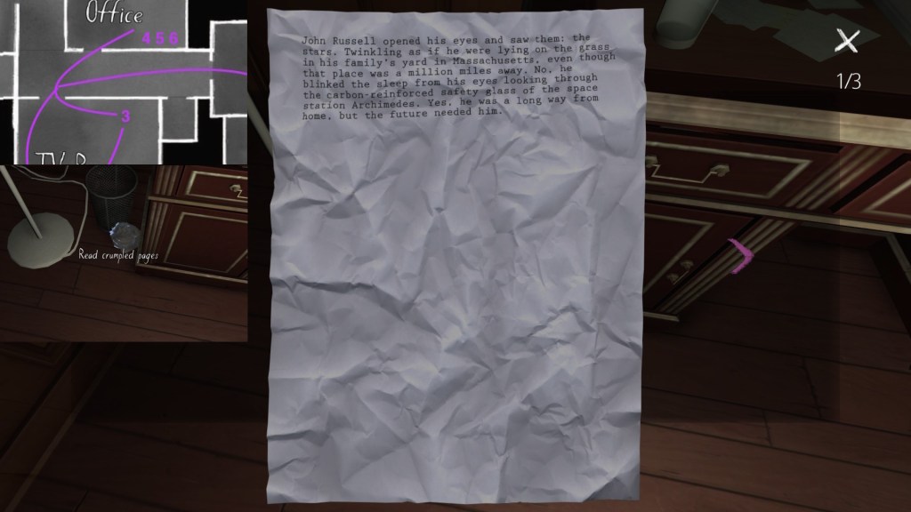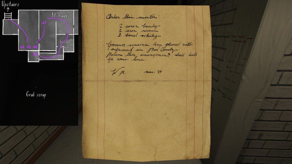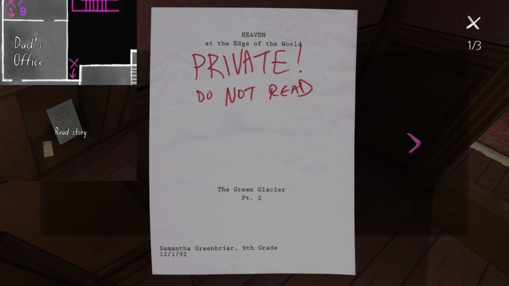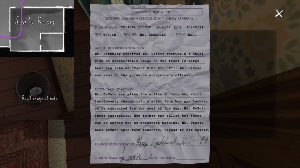 The story of Oscar Maran and his relationship to his nephew, Terry Greenbriar, is difficult in two respects. First, it is difficult simply because it is the toughest to piece together. Its key documents are among the toughest to find in the game, and even when you have everything in front of you, it still requires some amount of interpretive effort to pin everything down. (It is a far cry from Sam and Lonnie’s story, in this regard.) Fully piecing everything together requires not just reading documents, but also paying close attention to other environmental details, such as objects located in strange places. It is a master class in subtle environmental storytelling.