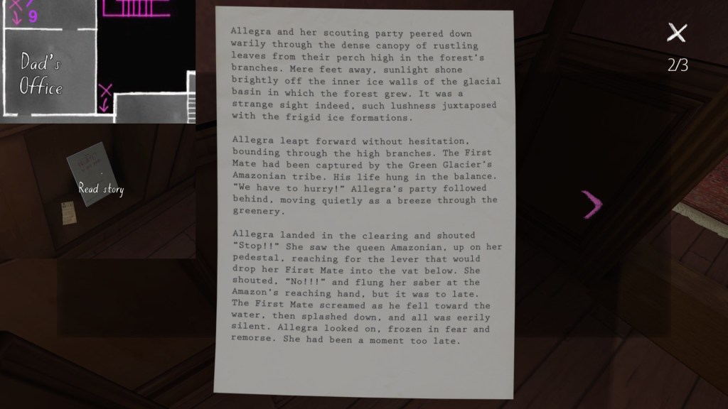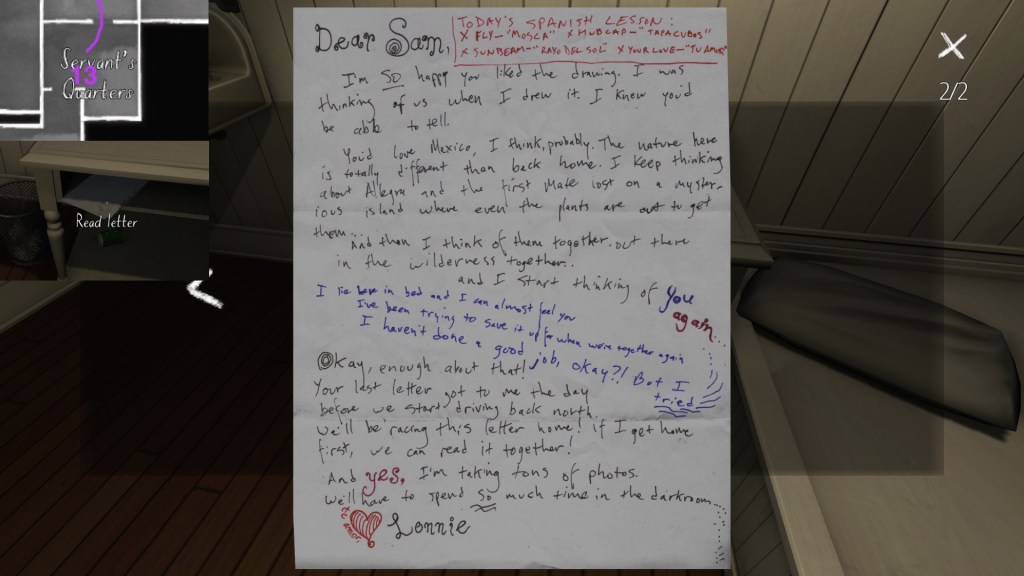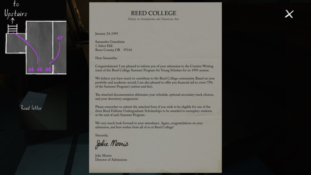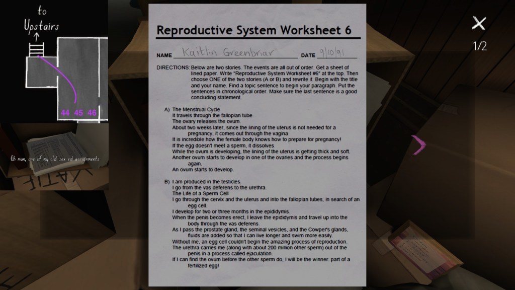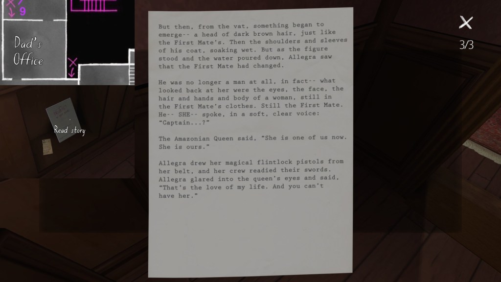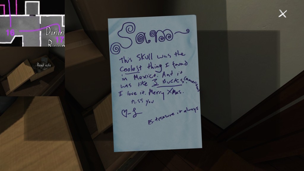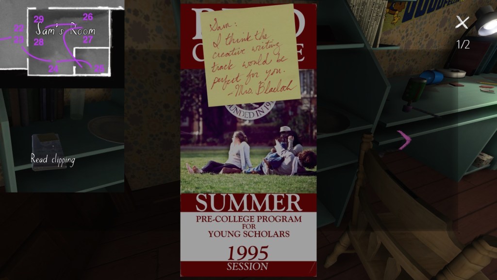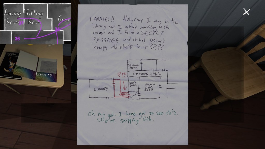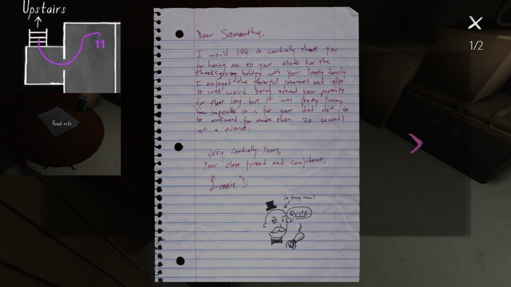 On a final note, if you’re interested in an exhaustive attempt to reconstruct the fabula of Gone Home, you’re looking in the wrong place. My guide cannot hold a candle to this one, by Steam community member Saraneth. Seriously, check it out. It’s awesome, and potentially very useful if you want to study the game further.