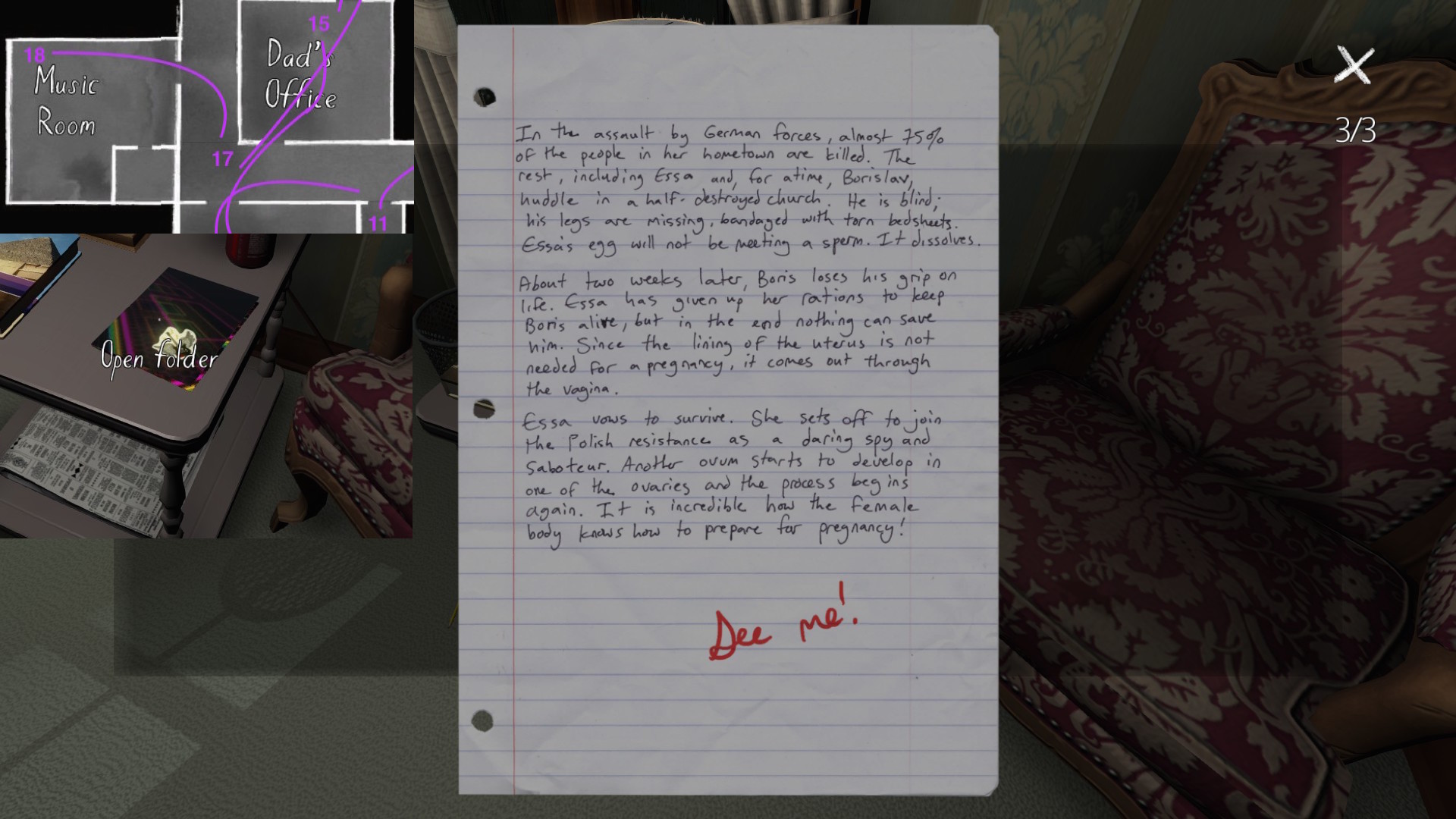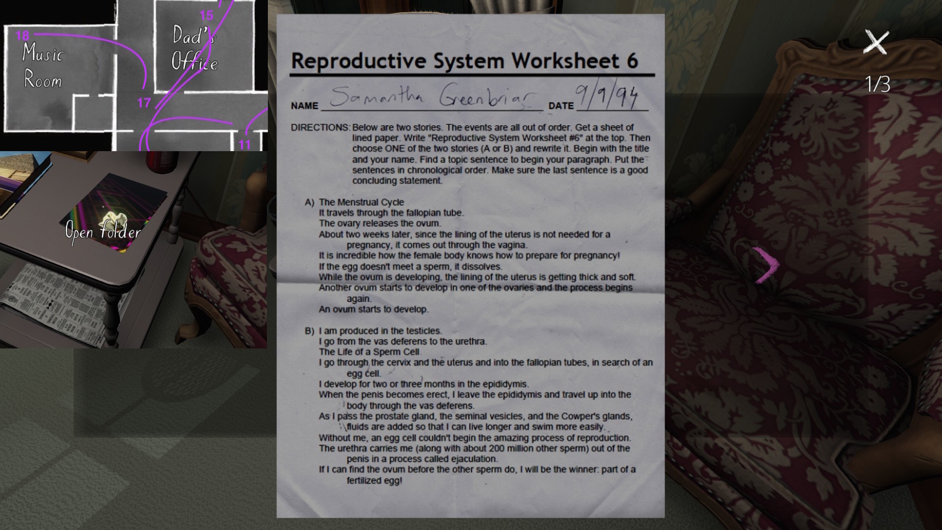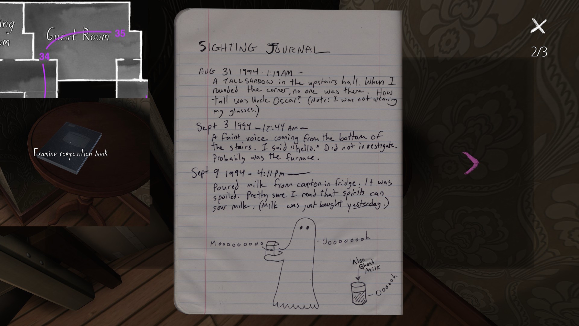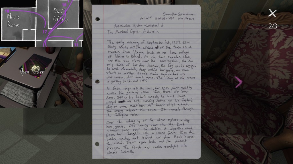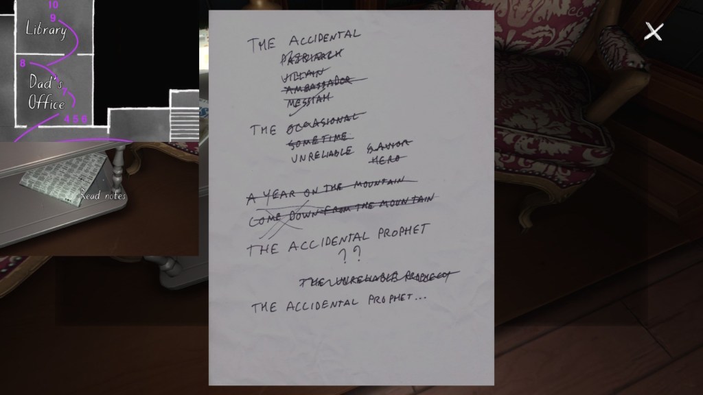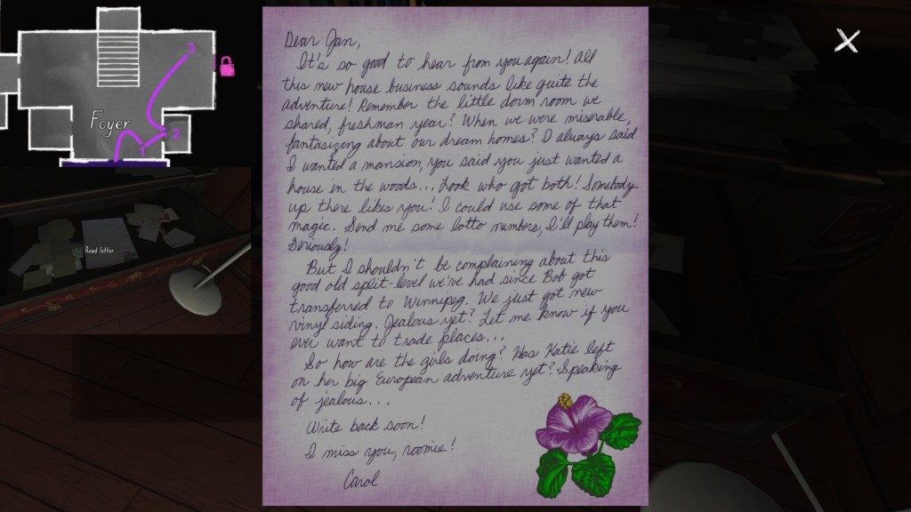 On a final note, if you’re interested in an exhaustive attempt to reconstruct the fabula of Gone Home, you’re looking in the wrong place. My guide cannot hold a candle to this one, by Steam community member Saraneth. Seriously, check it out. It’s awesome, and potentially very useful if you want to study the game further.