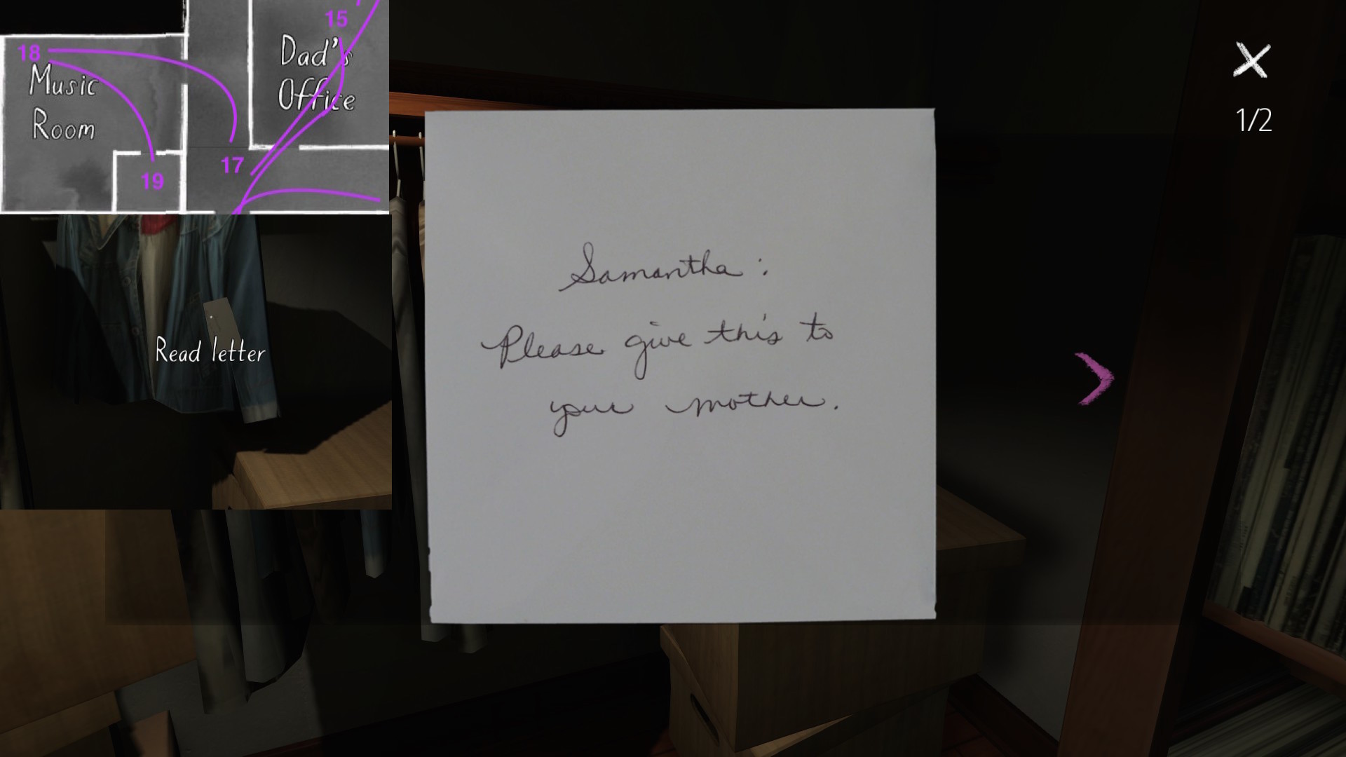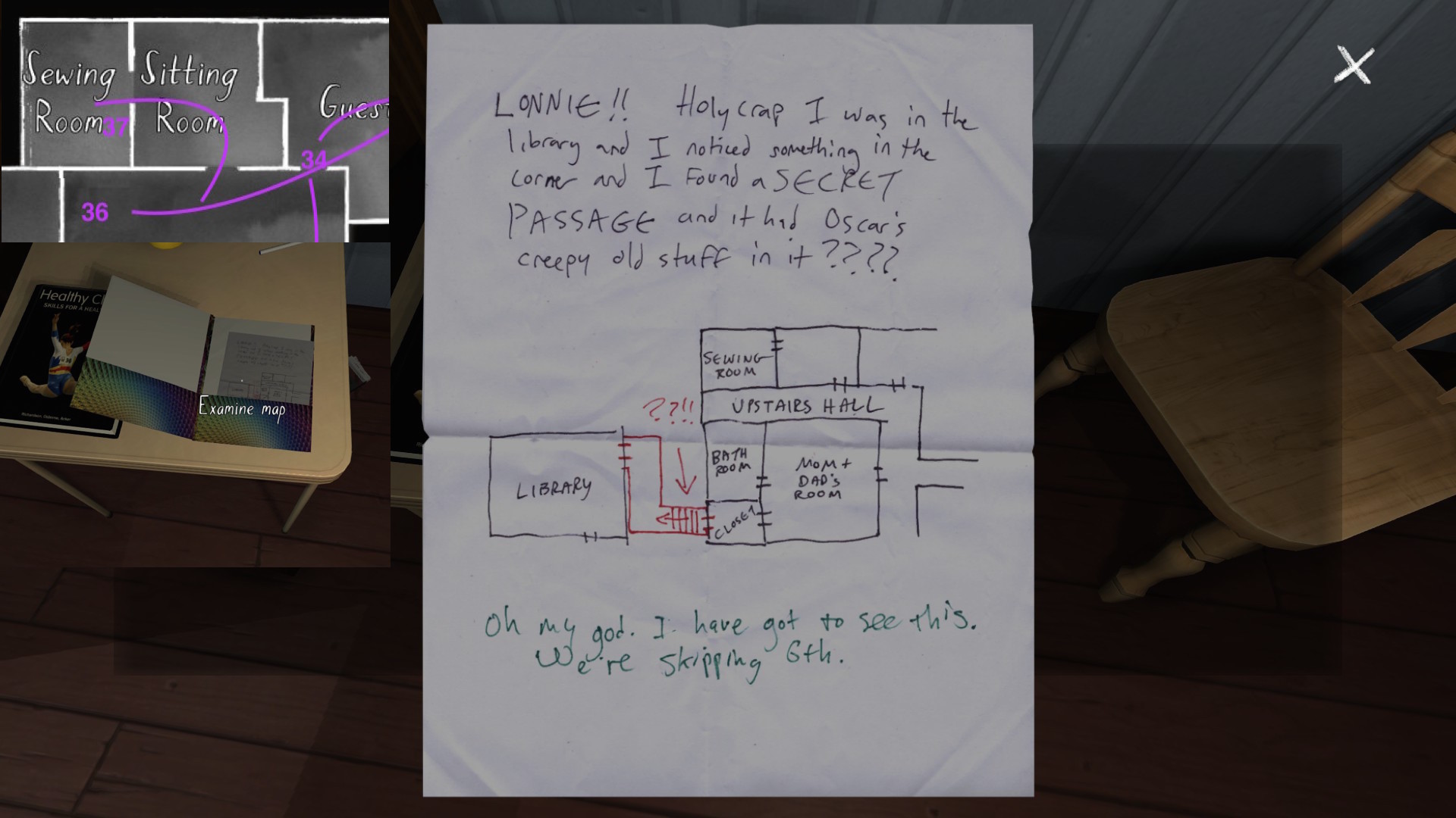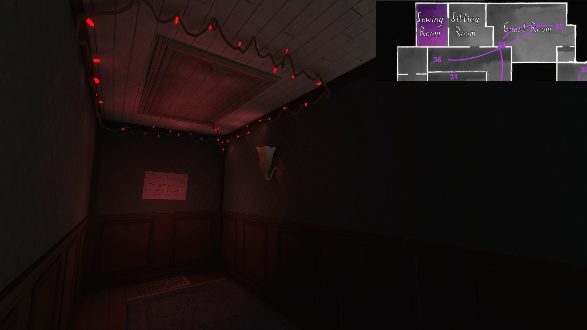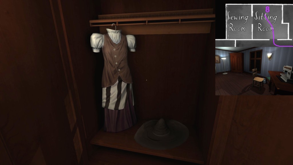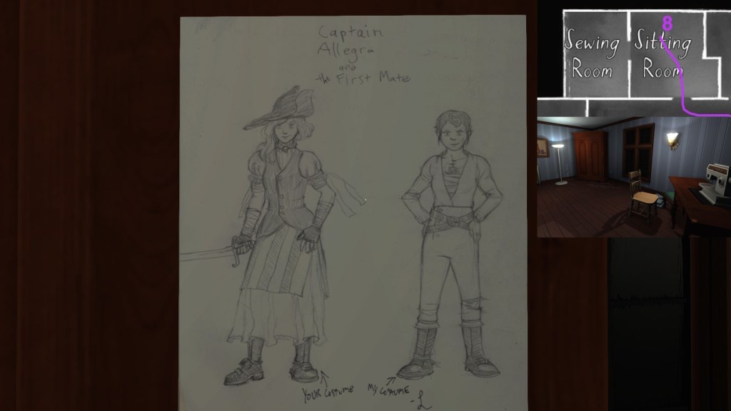 • Sewing room, picking up the first secret passage map