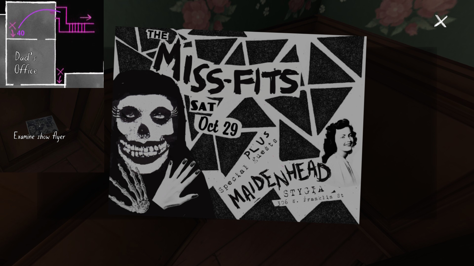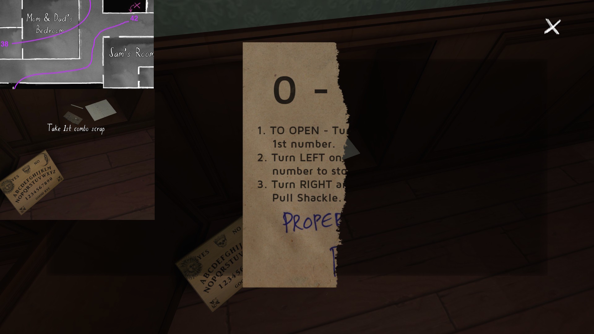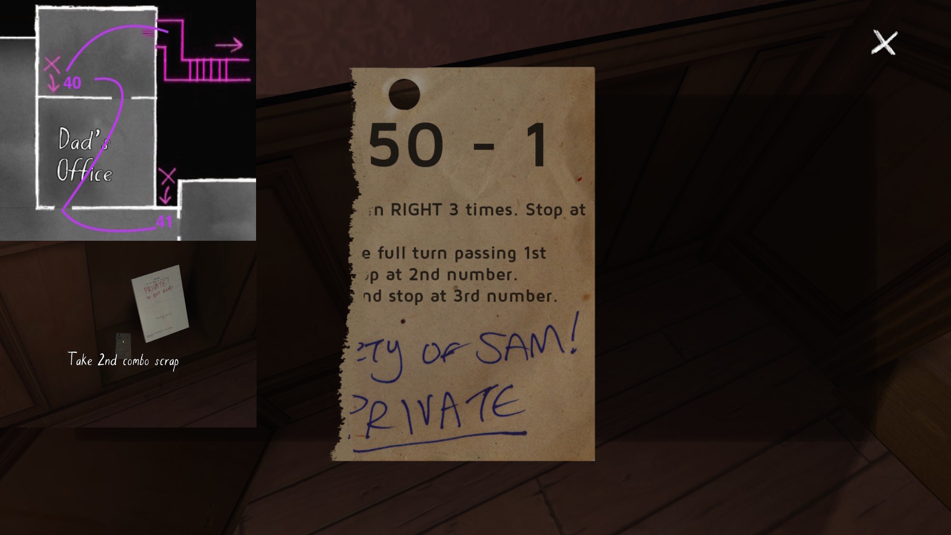 • Sewing room, picking up the first secret passage map