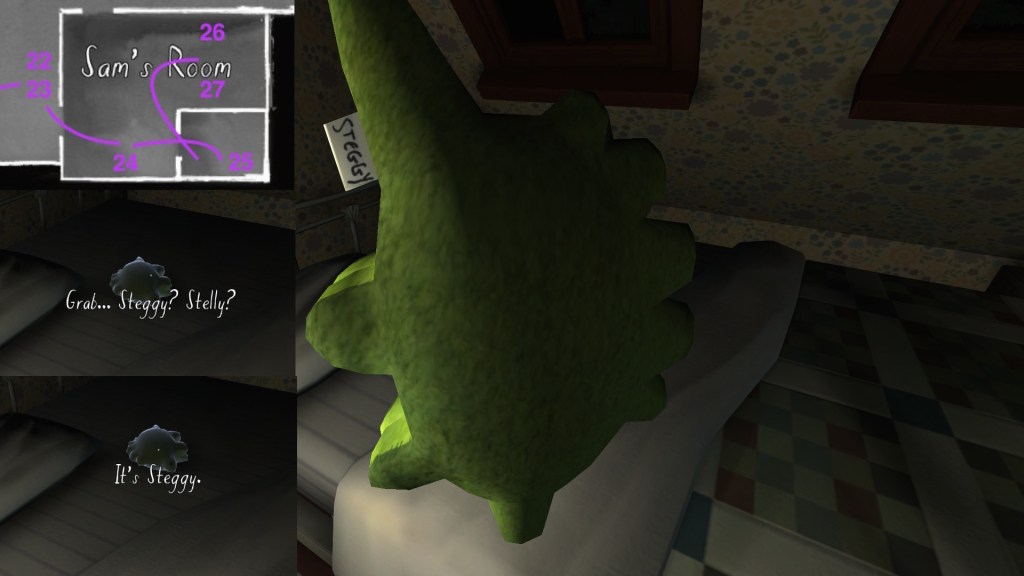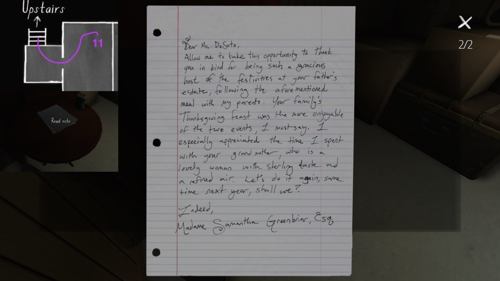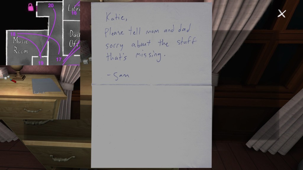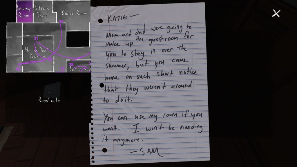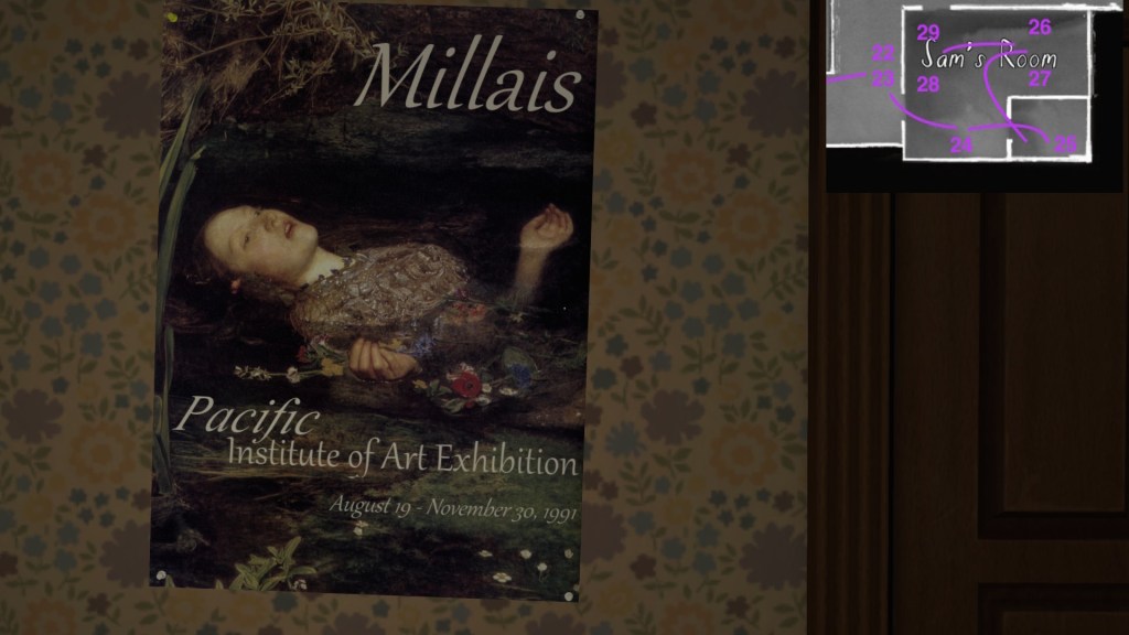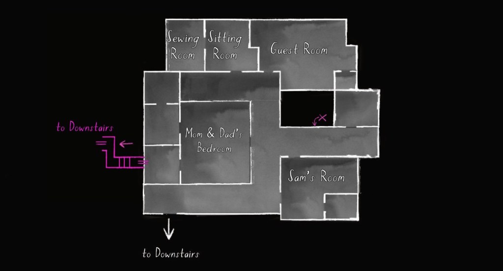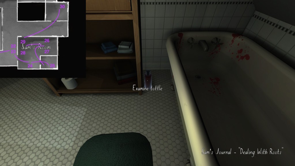 • This path has the effect of making the player’s syuzhet path almost exactly match the fabula order of Sam’s diary entries, with a couple small exceptions. (Her April 5th and April 10th journal entries are flopped, as are her May 1st and May 19th journal entries.) Since Sam’s story proceeds quite well when it is delivered in this order, I am predisposed to think of this path as Fullbright’s intended player path through the mansion, allowing for some minor variations.