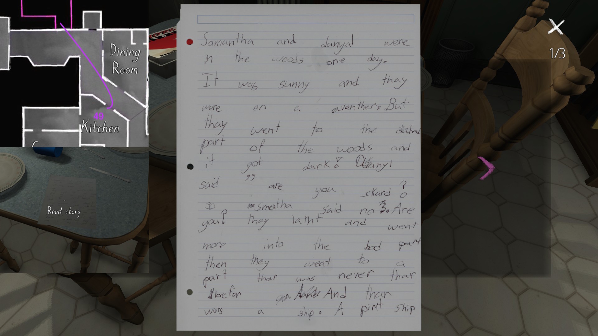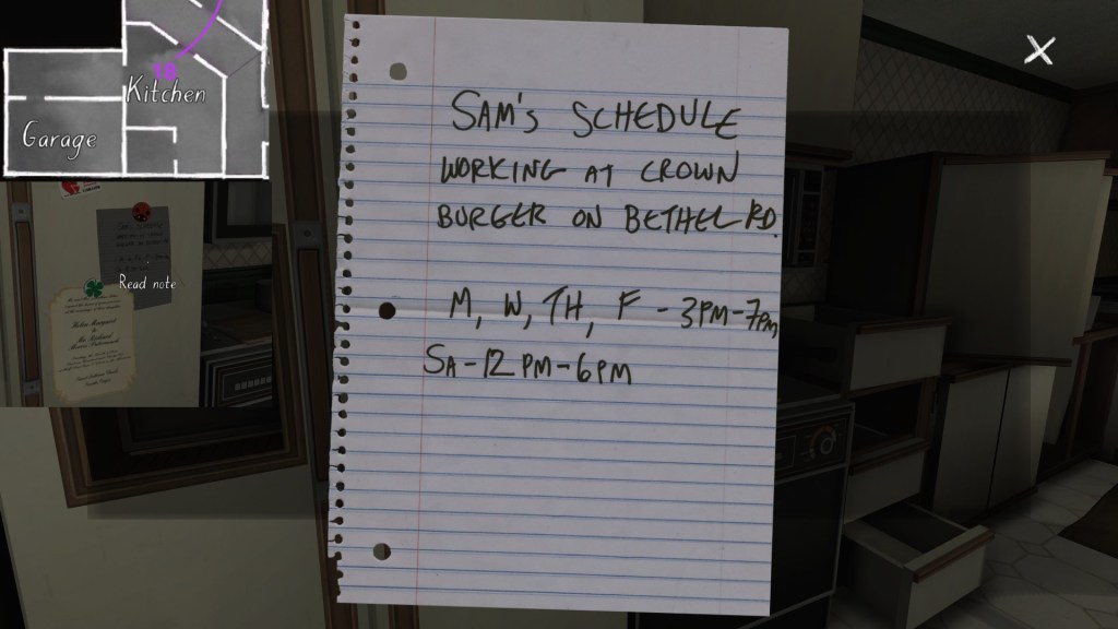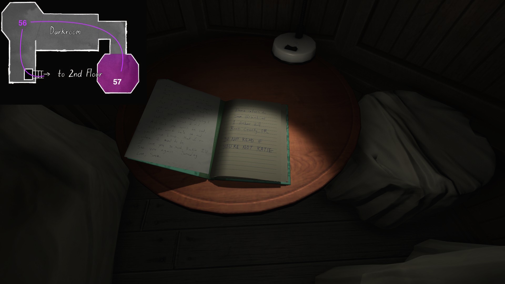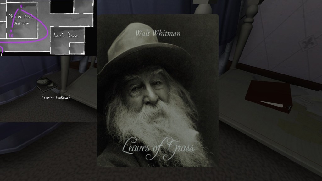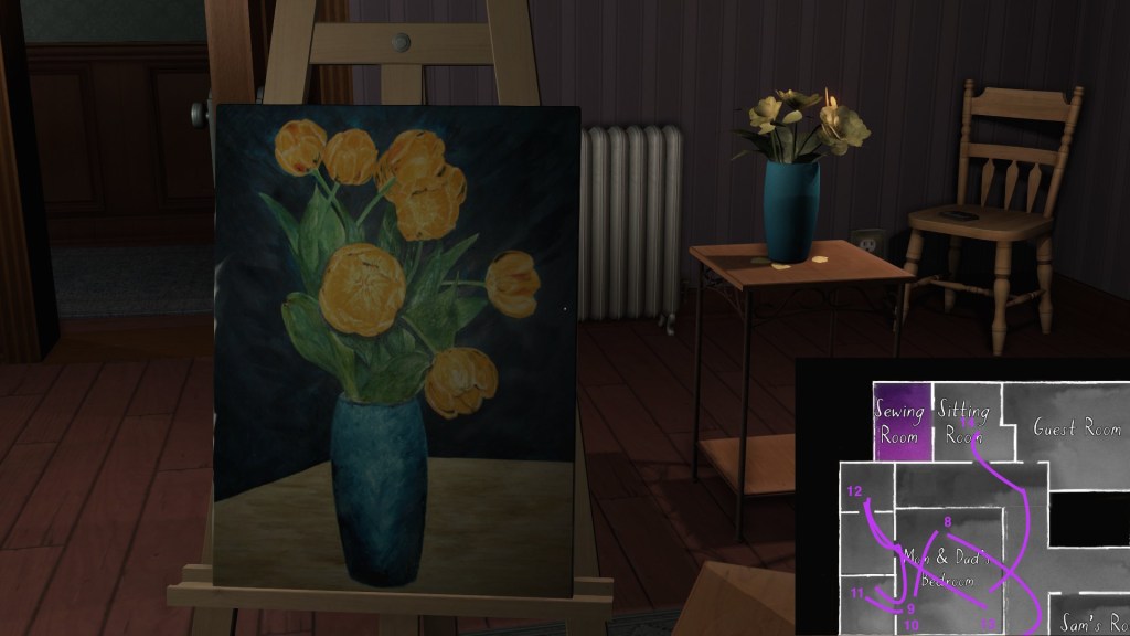 • This path has the effect of making the player’s syuzhet path almost exactly match the fabula order of Sam’s diary entries, with a couple small exceptions. (Her April 5th and April 10th journal entries are flopped, as are her May 1st and May 19th journal entries.) Since Sam’s story proceeds quite well when it is delivered in this order, I am predisposed to think of this path as Fullbright’s intended player path through the mansion, allowing for some minor variations.