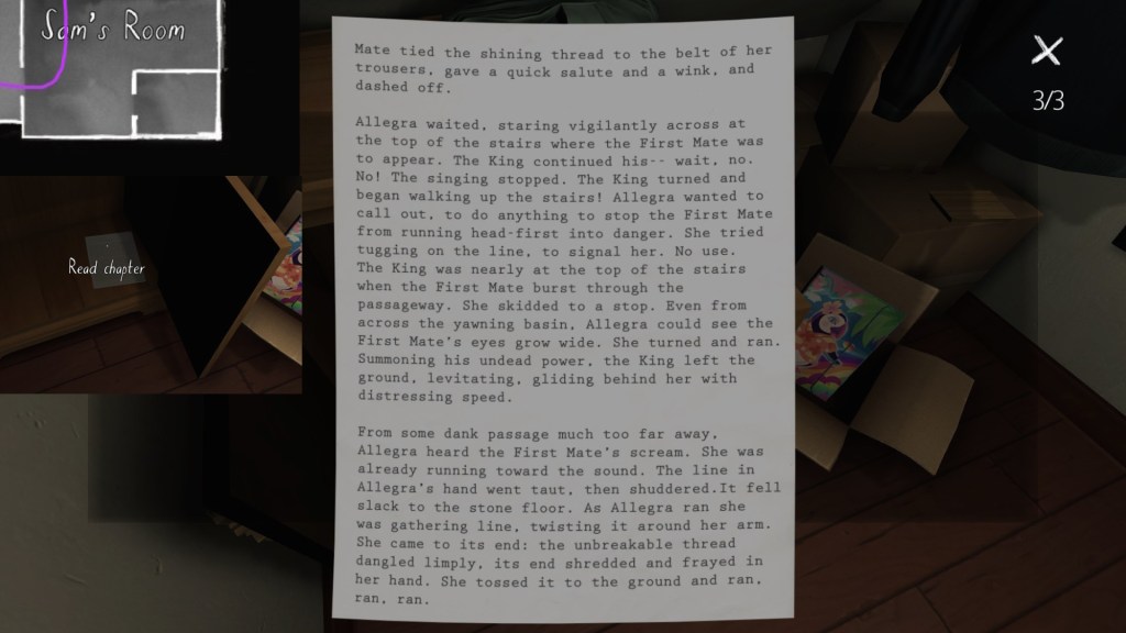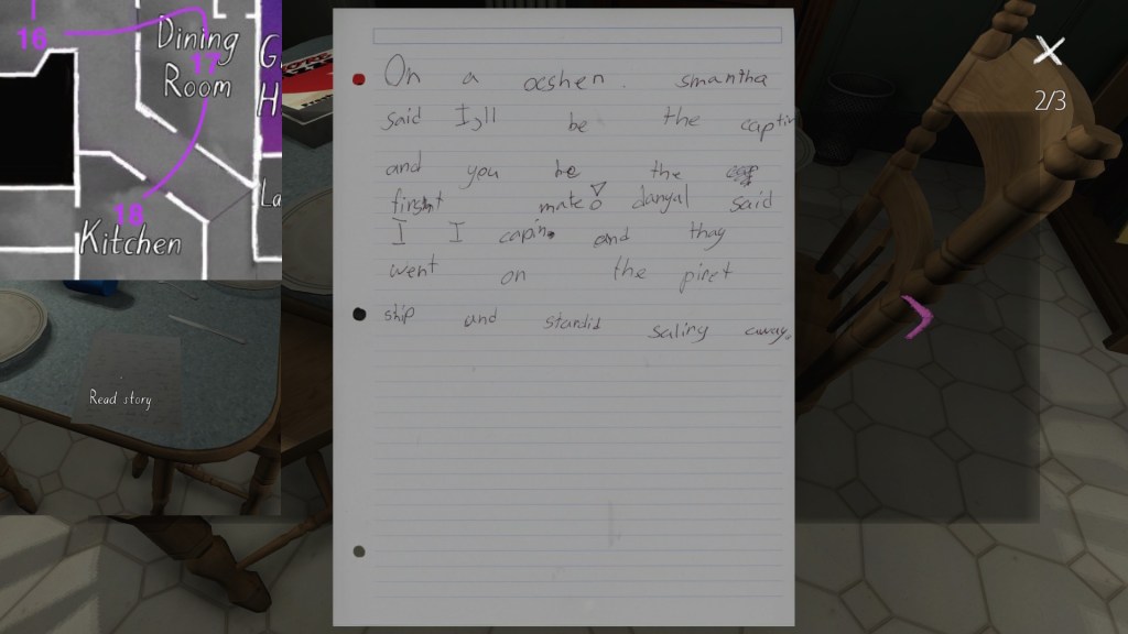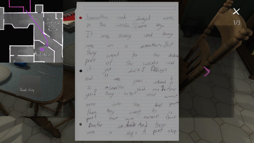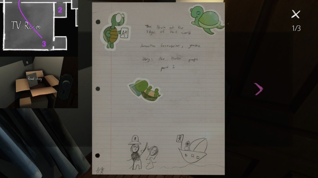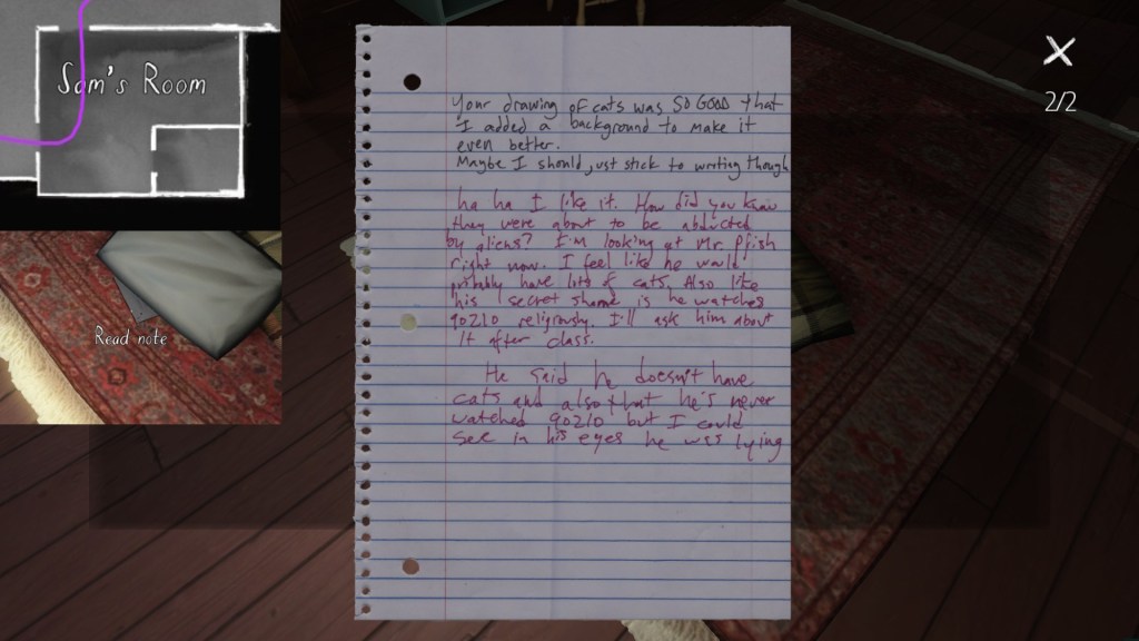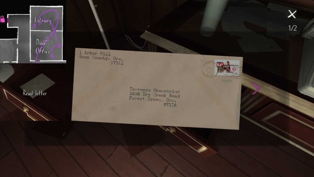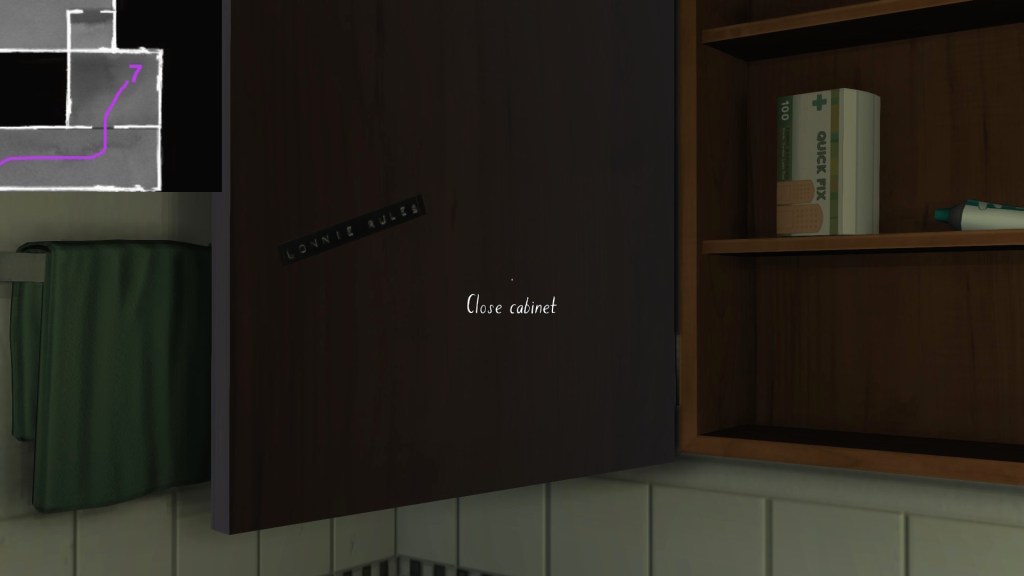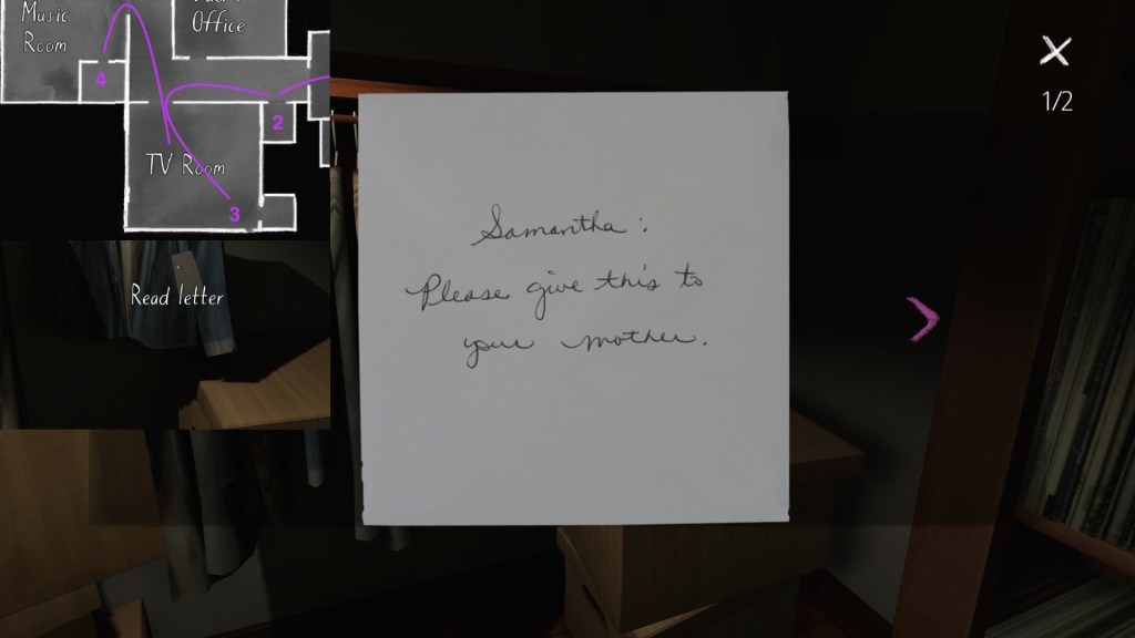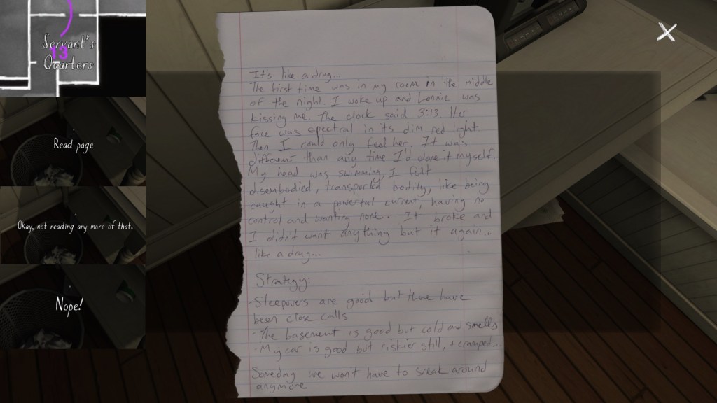 If we consider the careful curation of the syuzhet to be, in essence, the real art of storytelling, than Gone Home‘s environmental storytelling is a curious beast. Although the game is linear in some respects, with certain areas of the house not unlocking until we have found specific items in other areas, within this linearity it does offer a large amount of freedom for players to wander around and pick up items in any order. Much like HER STORY (Sam Barlow, 2015), this creates a lot of potential variability across players’ possible syuzhets.