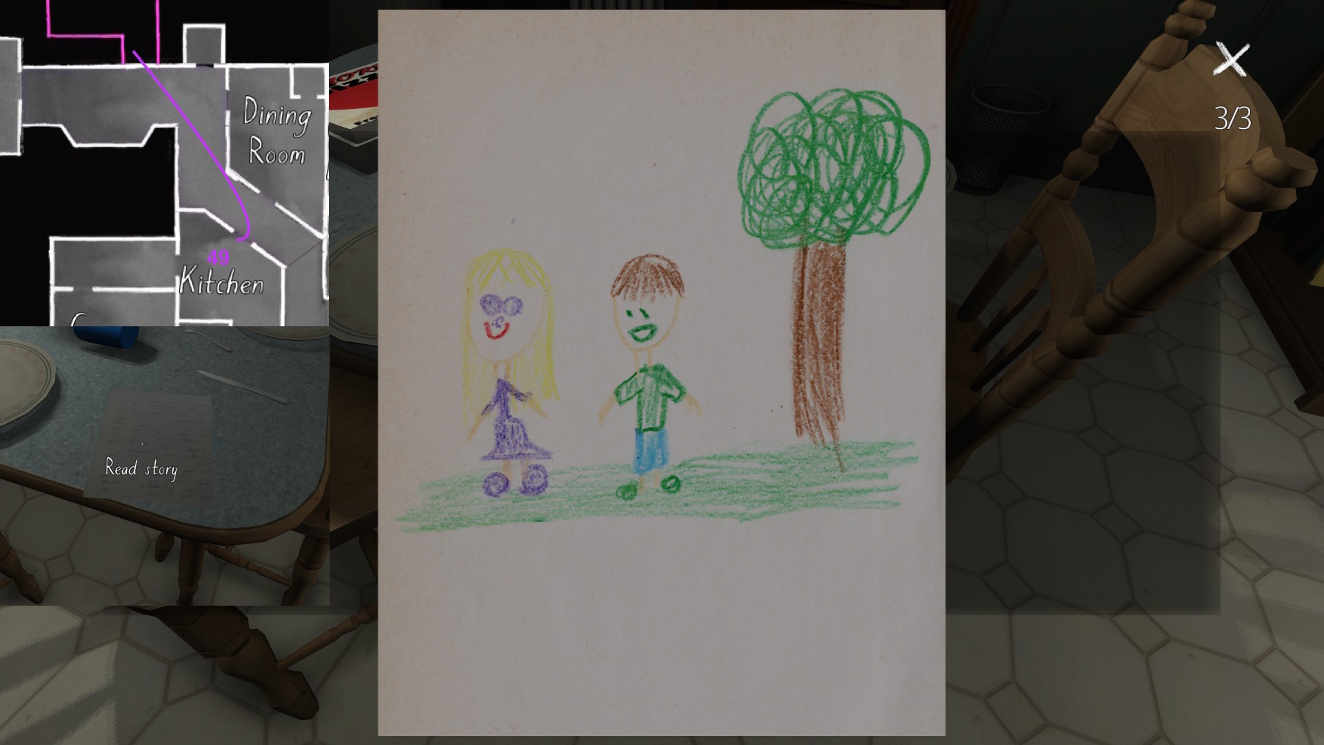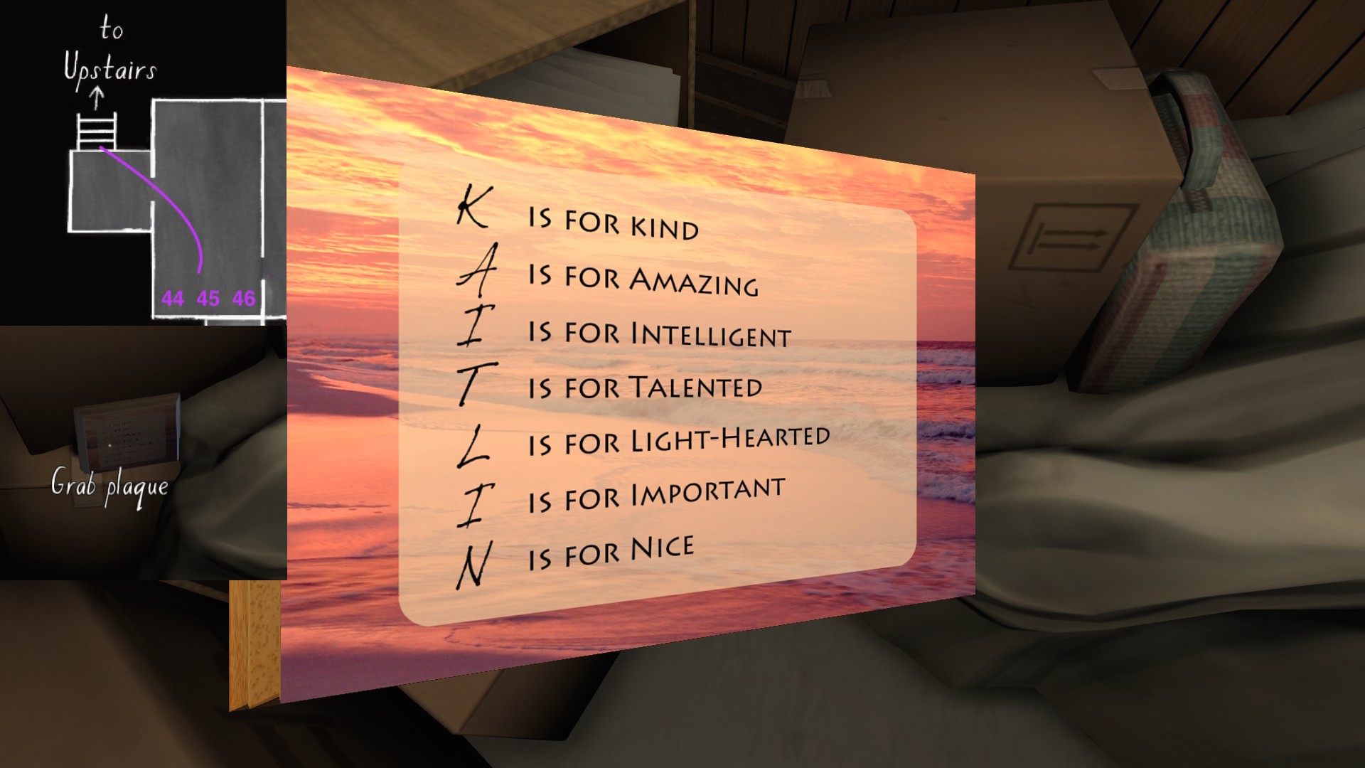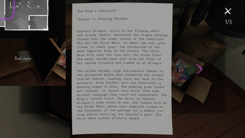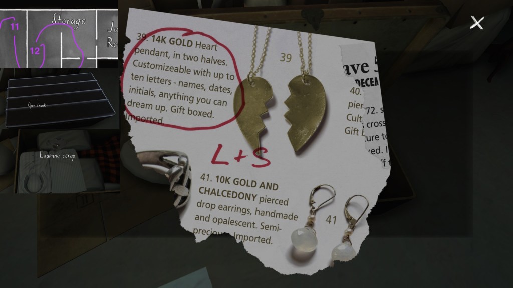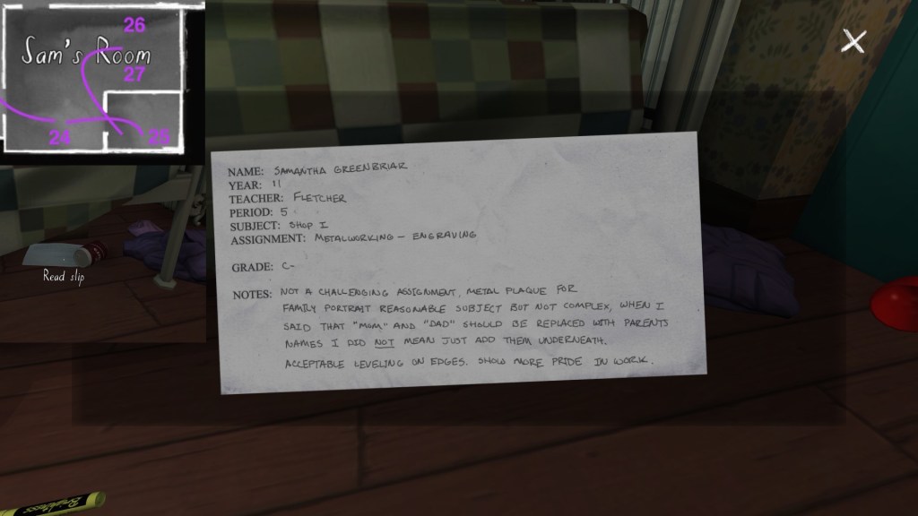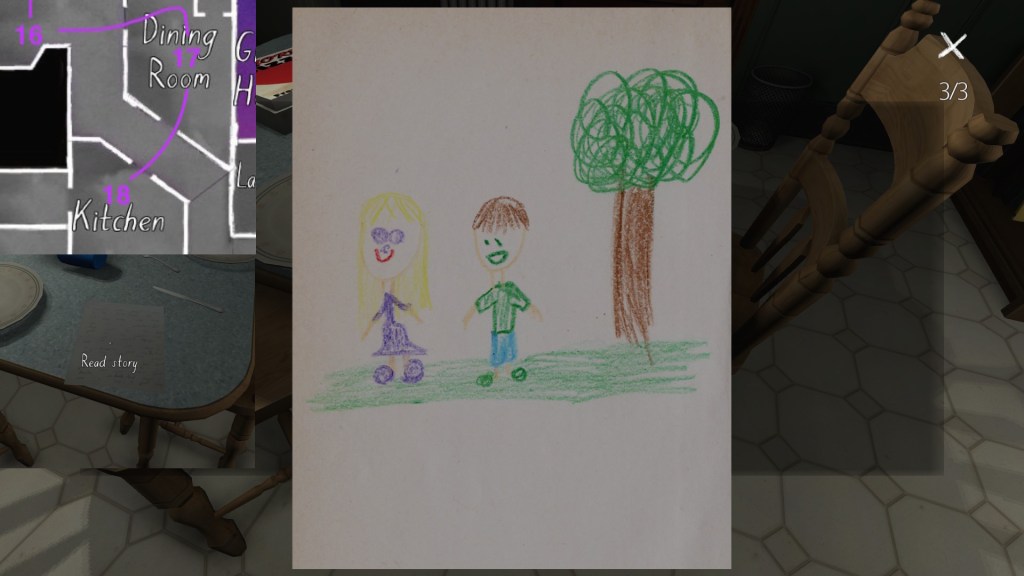 If we consider the careful curation of the syuzhet to be, in essence, the real art of storytelling, than Gone Home‘s environmental storytelling is a curious beast. Although the game is linear in some respects, with certain areas of the house not unlocking until we have found specific items in other areas, within this linearity it does offer a large amount of freedom for players to wander around and pick up items in any order. Much like HER STORY (Sam Barlow, 2015), this creates a lot of potential variability across players’ possible syuzhets.