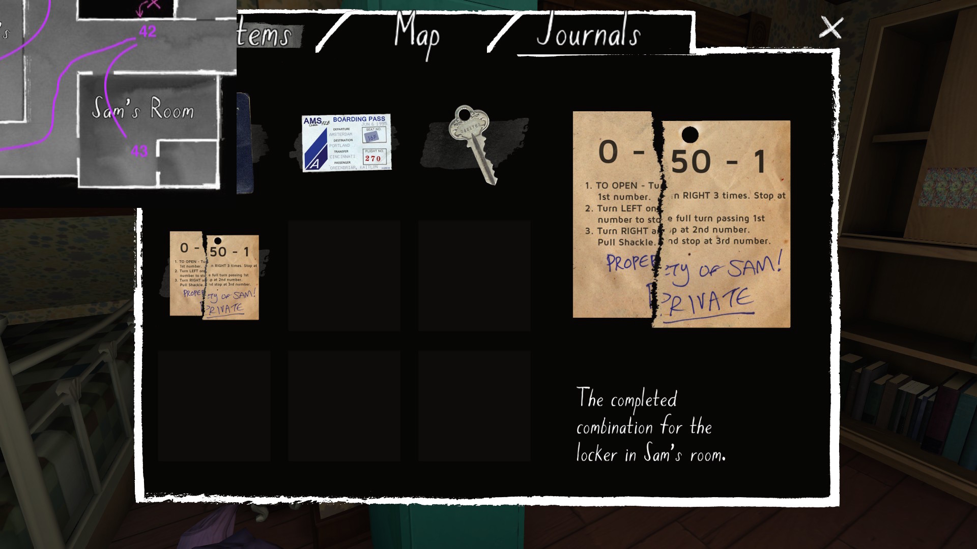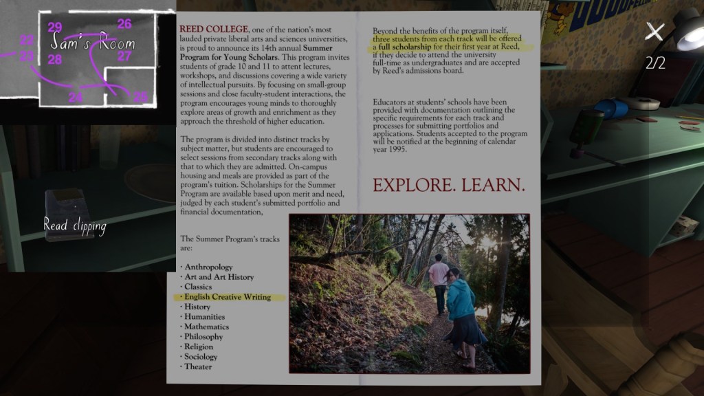 Although the question of why Katie arrives to an empty, ransacked house provides the initial hook for Gone Home, the story of Sam and her girlfriend Lonnie turns out to be very much the central story of the game. It’s the only story that is actually revealed to us in the first-person, through journal entries, rather than through letters and other environmental details. What’s more, these journal entries are actually read out, meaning that Sam is the one character with prominent voice acting in the game (although we do at points hear both Katie’s and Lonnie’s voices).
