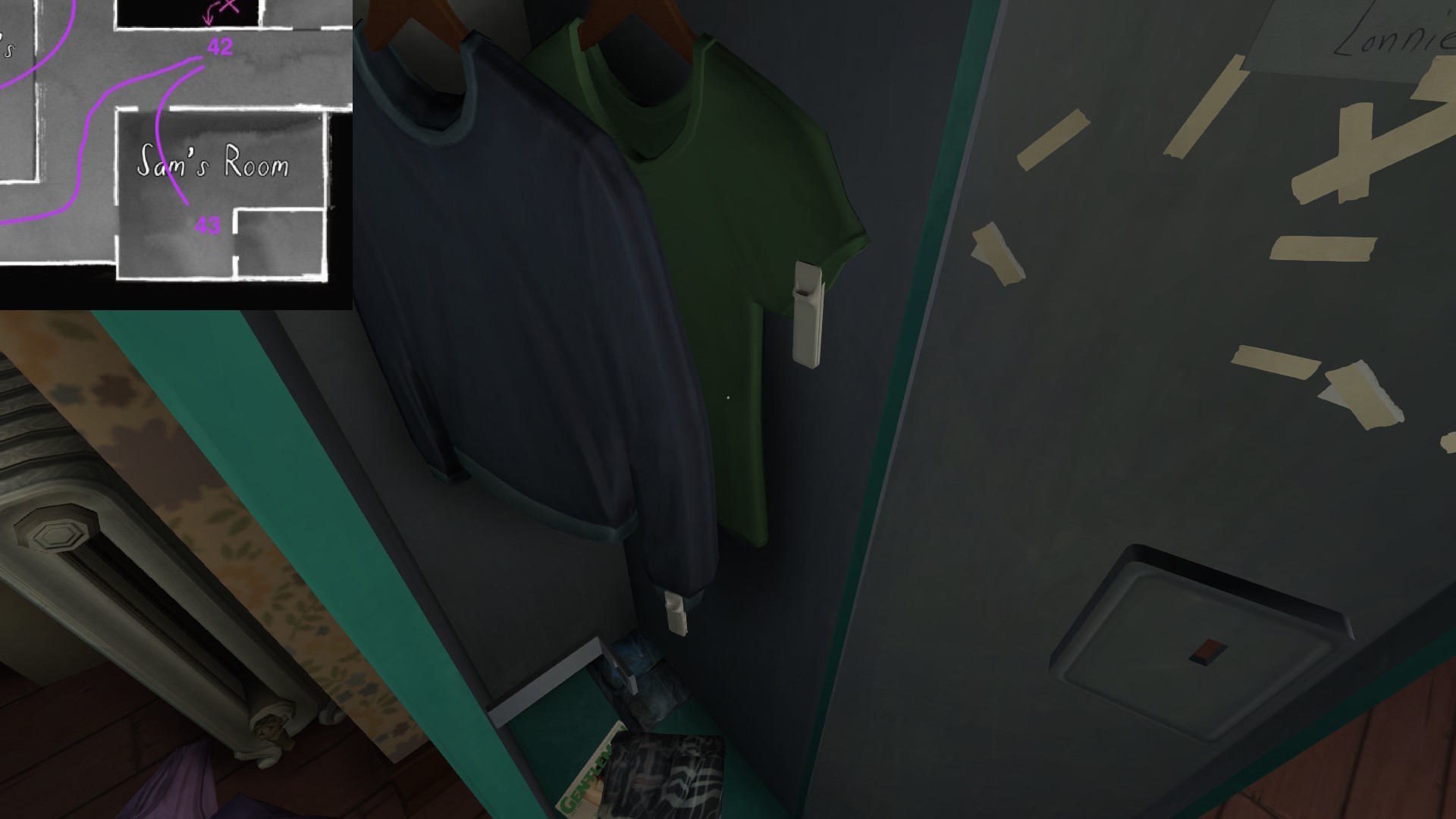 • Sam’s room and its closet