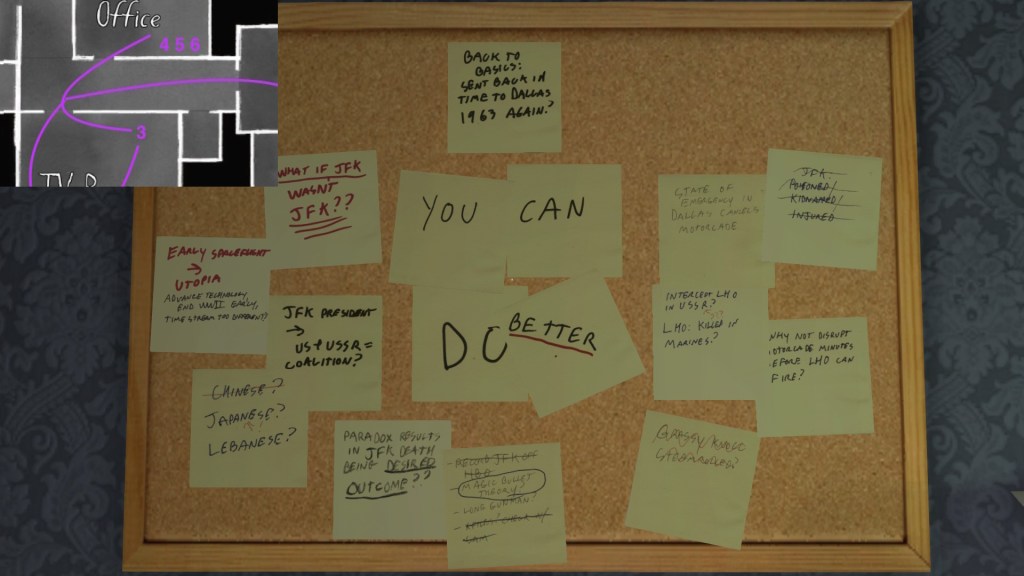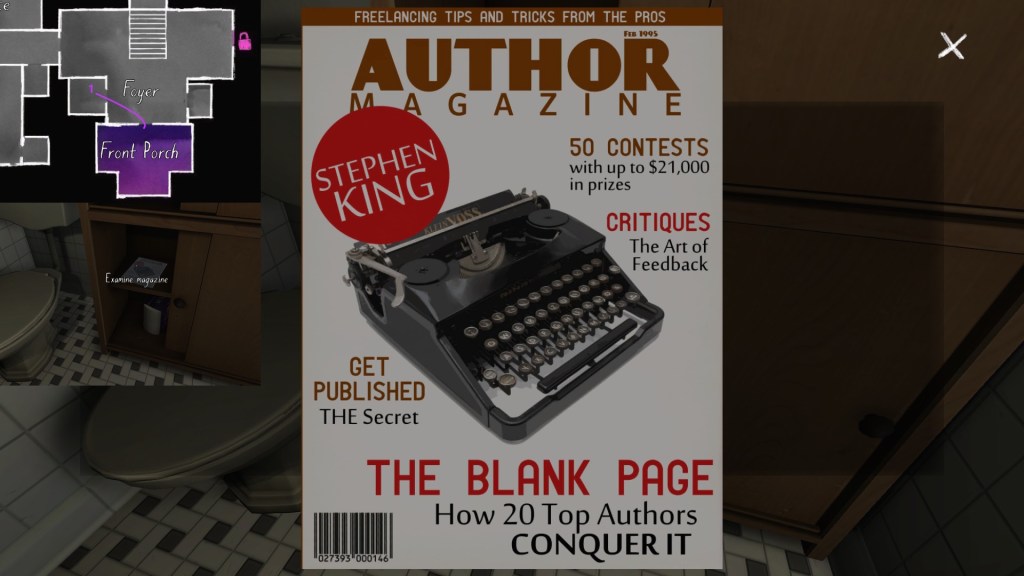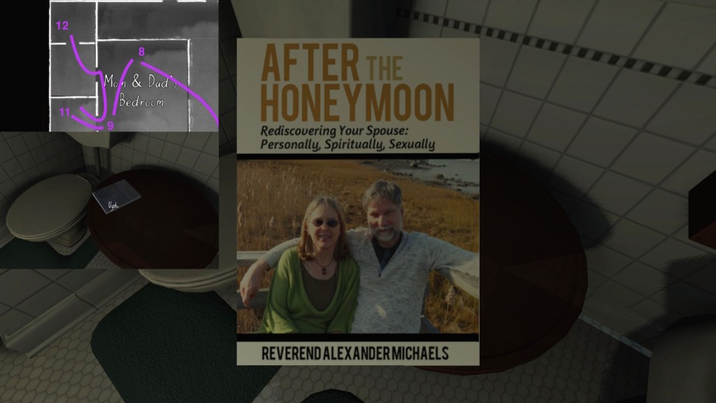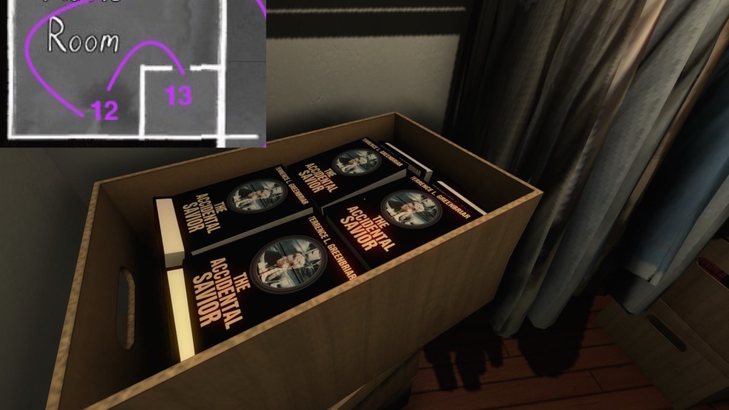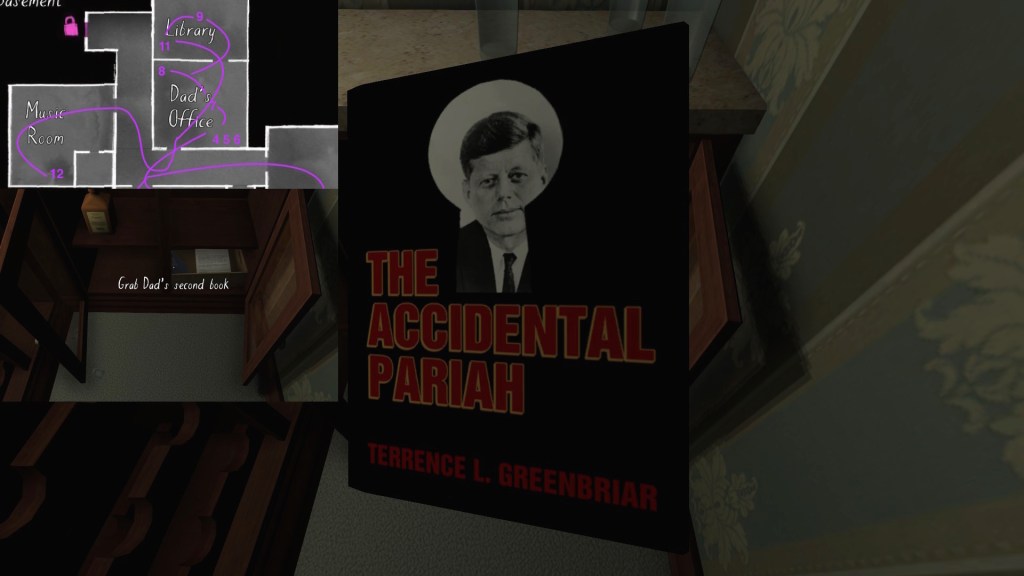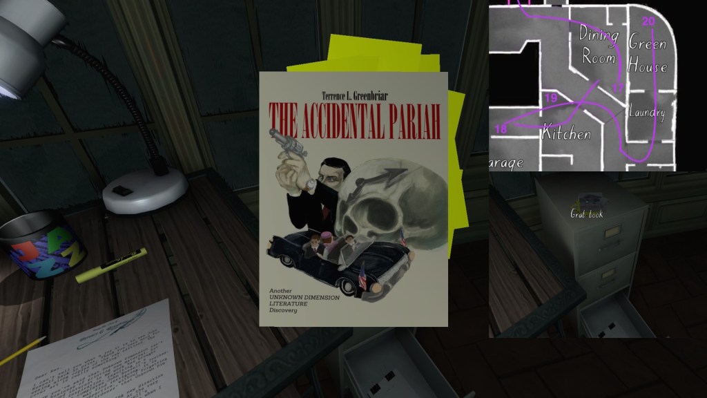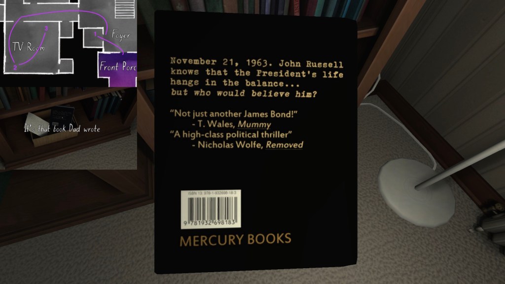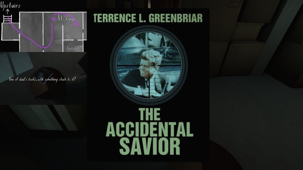 Terry’s side story is anchored by some fun props—his books, in particular, with their pulpy JFK conspiracy sci-fi alternate history nonsense subject matter. As such, it is probably the most attention grabbing of the side-stories in Gone Home. Terry’s story takes on some extra resonance when we combine it with Oscar’s story, but in this section I will just be outlining the basics of Terry’s career arc.