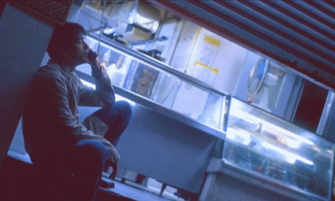 In continuation of the first story, the beginning of Cop 223’s journey is distinguished by two scenes. The first (1:54-2:47) follows Cop 223, running to catch a potential suspect through the tourist-packed streets of Hong Kong. Moments before he meets the anonymous drug smuggler, the camera catches glimpses of the world around Cop 223 as he sprints past a series of lively individuals. As he gazes against a man with a McDonald’s bag on his head and a large mannequin, we get a sense of the entirely random and disjointed lives of Hong Kong’s citizens. Although they all appear under the ecstasy of the bright street lights and the endless street vendors, very few seem to engage with the masses. The movement of the characters is so impersonal that most of the other characters are blurred as if to strip them of any sense of individuality. Cop 223, surrounded by hundreds, is entirely alone. This scene demonstrates Wong Kar-wai’s rather poetic cinematography, an instance of Cop 223 consciously pushing out those around him to wallow in his pain. Cop 223 hopes not only to get back his lost love but to connect to the world. Cop 223 seemingly believes finding love and intimacy is the solution to overcoming urban isolation. He fishes for a meaningful connection in the second scene (25:40-26:04). While it is evident that Cop 223 is physically alone in the snack bar, he is emotionally shattered. In this desperation, he calls upon the people he had the slightest of a legitimate human connection with–even if it’s someone he knew in the fourth grade.