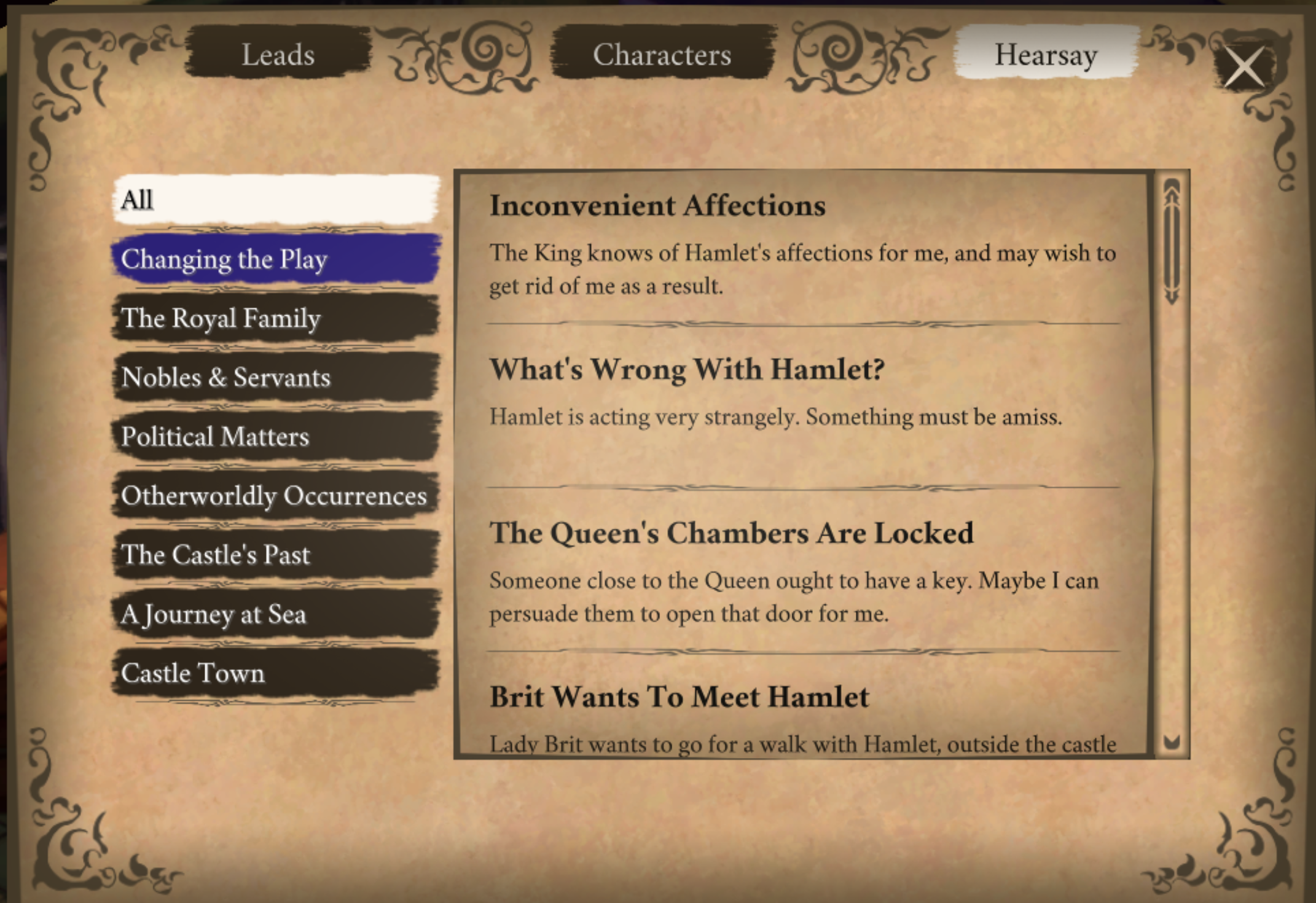 At its most simplistic description, Elsinore is a click-and-point adventure game where the player embodies Hamlet’s Ophelia. As the game unfolds, your abilities as a player expand. At the start, you learn that you are living through Shakespeare’s tragedy but you are able to interact with it by clicking on the characters around you and either following them or talking to them. You can only talk to people about information that you gather from others, stored in your electronic journal as “hearsay.” You also gain hearsay by following characters and listening in on their conversations. One of your main sources of agency in the game comes from your ability to distribute information to characters that might change their course of action— something we often long for as viewers of tragedy, when we want to warn Romeo that Juliet is simply sleeping or tell Hamlet that it’s not his uncle behind the curtain.
