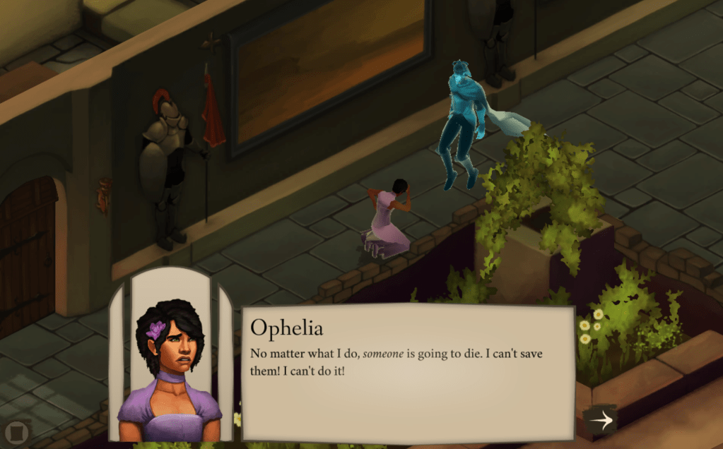 Another large source of agency comes at the end of Saturday (the story of Hamlet begins on a Thursday morning) after Hamlet has mistakenly killed your father, a hooded and masked figure simply titled “The Spy” (who you’ve likely heard about from listening in on royal meetings) walks up to your character and murders you. A black screen with a small animation of a lily pad and skull pops up and offers that you try again. You wake up in your bedroom as Ophelia on Thursday morning before all the tragedy has transpired.