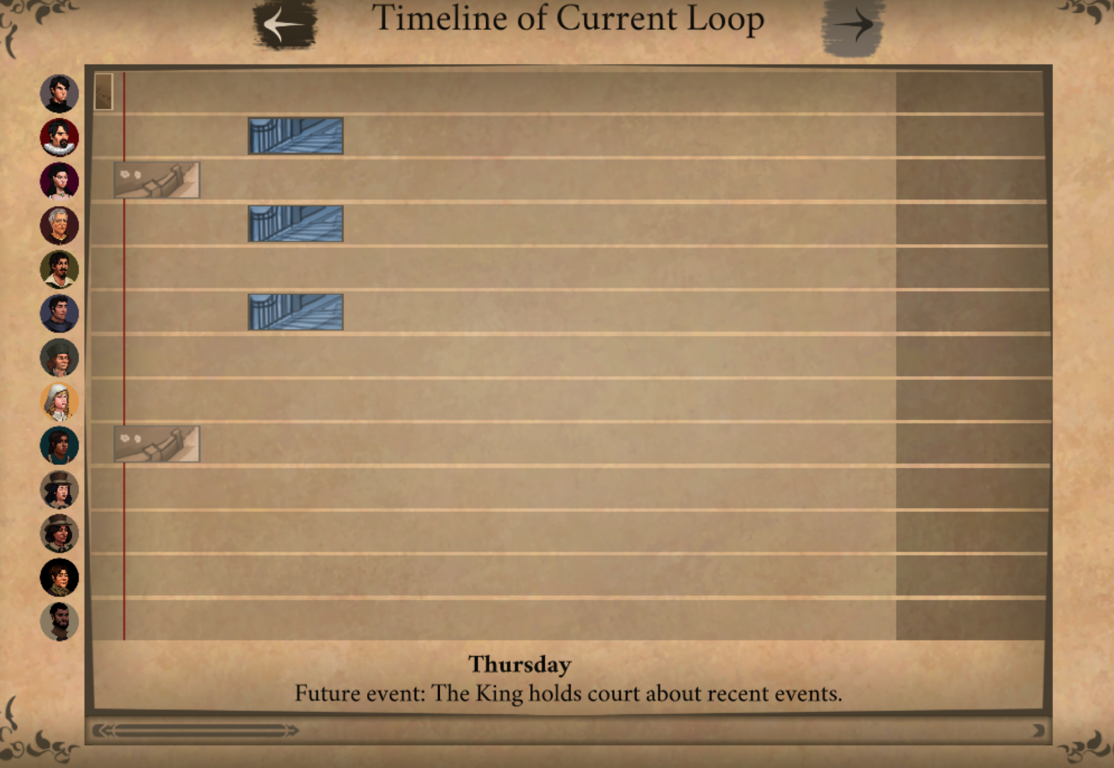 You realize that you are somehow moving outside the flow of time and you gain the ability to both fast-forward time and to reset the time loop. The timeline feature that the player is introduced to in the first cycle suddenly takes on a new meaning. As you hear about events in the future or even set them into motion you will see them pop up on your timeline, if you want to jump ahead to this event you can simply fast forward your time to it. If you set something in motion that is unlikely to occur (perhaps it’ll be after the Norwegian Army invades or your father won’t go to a meeting because Hamlet will have killed him at that point) a faint blue X will appear on the timeline, indicating to the player that if you really need this event to happen, you’ll have to try again after a reset.
