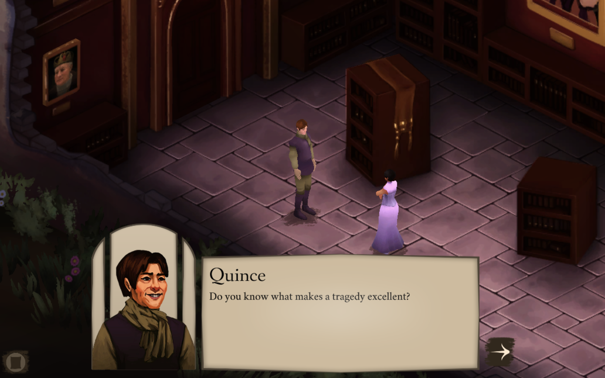 When you are first murdered and the game resets, the natural conclusion is that you are now playing a contest game. Your obvious adversary is the spy who killed you, so now, to save yourself from dying and presumably win the game you need to eliminate the spy. However, once you find and eliminate the spy the game doesn’t stop. You are able to arrest the spy and live to the next day but time keeps looping. Moreover, Peter Quince, who is the playmaster who Hamlet invites to put on a replica play of his uncle killing his father in order to get him to confess, moves from a background character to the foreground. After your first reset it’s revealed that he is also moving outside the flow of time, and he often discusses tragedy and how to craft a tragic story with Ophelia. After you finish the time loop where you get the spy arrested and evade your own death, Quince appears and says he’s bored of that plot line and eliminates it, meaning that the spy is no longer trying to kill you. He then gives you a new objective, to find the Book of Fates, and in order to do this you must befriend your old murderer, flipping the idea of the contest story on its head.