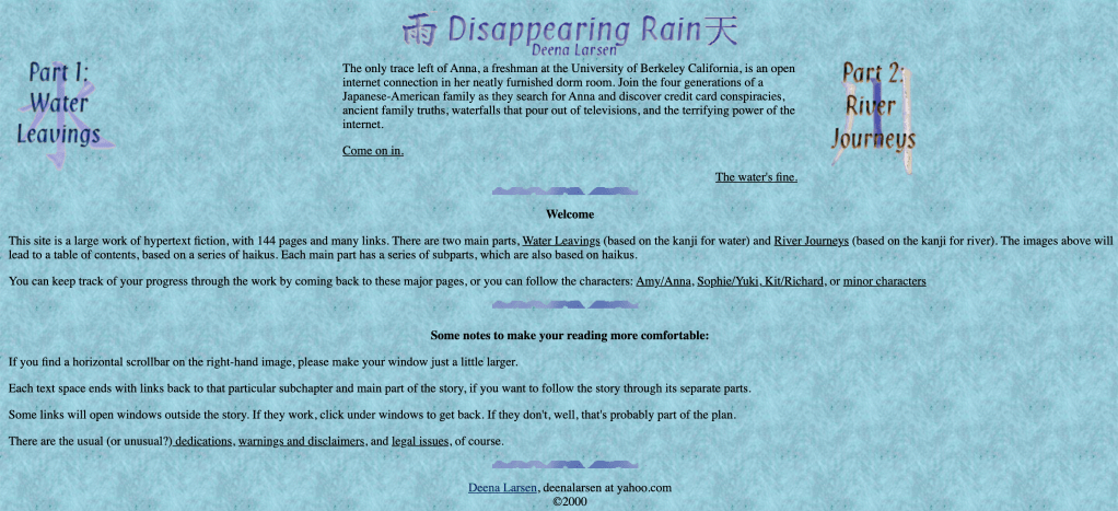 Upside down underwater amidst a turbulent storm– that’s what my first two hours engaging with Deena Larsen’s hypertext fiction Disappearing Rain felt like. Confused and blinded by the darkness of the water, I flailed against the torrents, waves hitting me from all angles as I struggled to discern up from down. Yet despite the turmoil, I was already absorbed in the mystery of the narrative– the disappearance of Anna Mizunami. As I fell down a rabbit hole of hyperlinks and haiku, like Mat Anderson and Patricia Tomaszek, contributors to the Electronic Literature Directory, muse in their eponymous article about Disappearing Rain, “Larsen … orchestrate[d] [my] own disappearance in the virtual reality of the Internet,” one that, as I would soon realize, mirrored the disappearance of Anna herself (Anderson and Tomaszek).