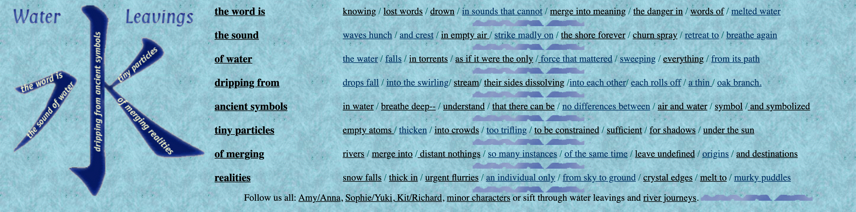 For my opening dive, I clicked on “Water Leavings,” and my eyes were immediately inundated with tons of visual stimuli. The “Water Leavings” and “River Journeys” pages contain a series of haiku– one central, bolded haiku reading from top to bottom, and a series of smaller, unbolded haiku reading in lines from left to right that branch off the individual lines of the bolded haiku. Clicking a link on an individual line or segment of a haiku links to another page with a short section from the story, each typically containing multiple linked words to another webpage’s story. And at the bottom of each page lies two haikus oriented horizontally– the bolded haiku (associated with part 1 and part 2), and the haiku subsection linked to the particular line of the bolded haiku. Thus, the haiku form an organizational system resembling a table of contents– the story divides into two thematic parts, represented with a bolded haiku; each line of the bolded haiku links to a sub-haiku, each line of which contains a page of the story. Thus, each line of the bolded haiku functions like the chapter of a book, containing a series of pages as represented figuratively by the individual parts of the sub-haiku and literally by the contents within these parts’ webpages.