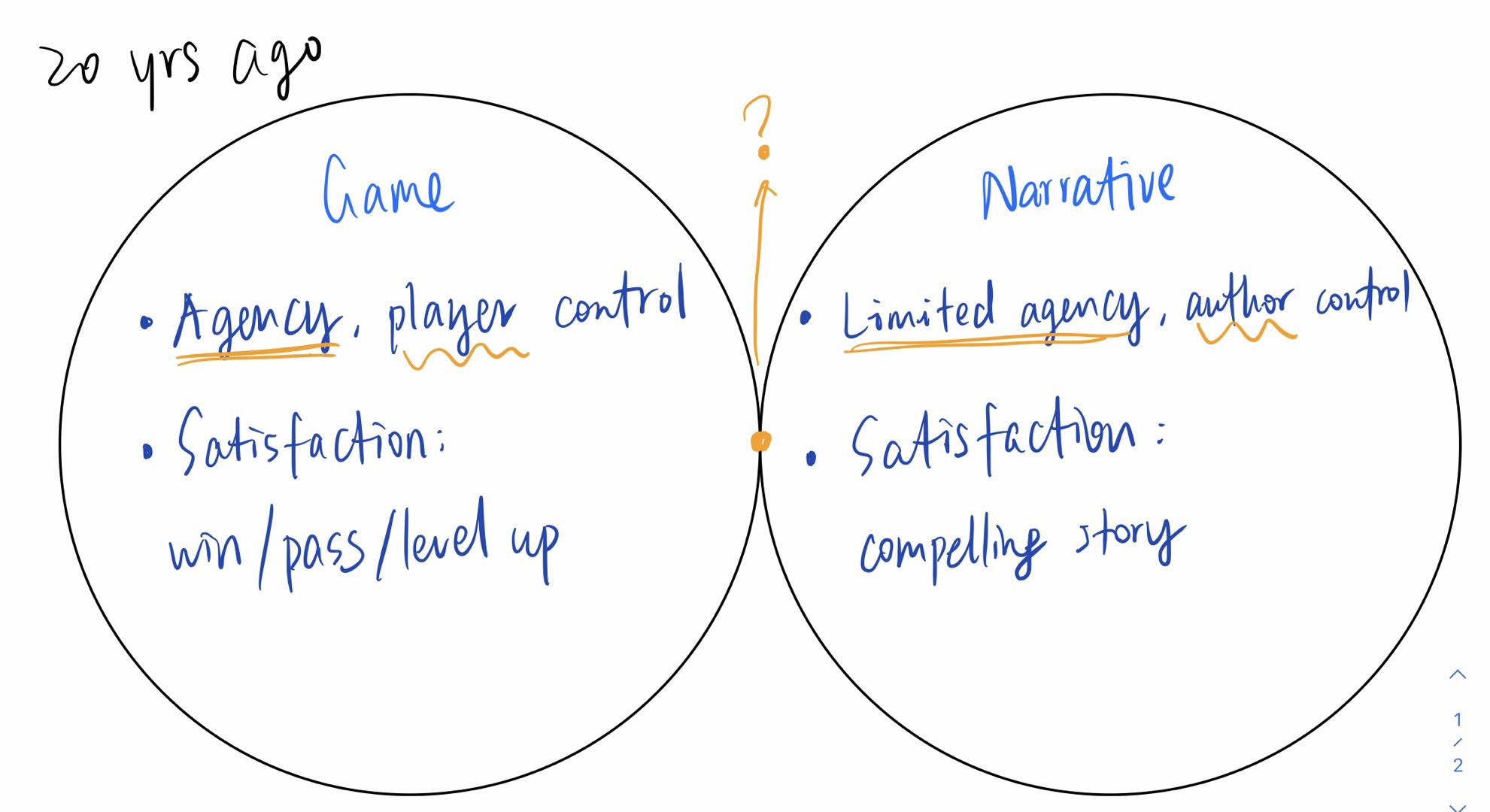 Between games and narratives exists a decades-long debate about whether games constitute good narratives. Ludologists want to shift the focus of game study to game mechanics and regard narratives as a secondary aspect of games, while narratologists are interested in studying games as a form of storytelling medium. A long-standing binary of game and narratives are created out of the debate, which delineates their boundary using agency/interactivity. According to this binary, games and narratives are in direct conflict with each other because narratives need to remain under the author’s control, which calls for minimum agency/participation from the players. On the contrary, the agency of players offered by the game’s interactivity is the primary feature of the game as a medium. In addition, gaming satisfaction might be in opposition to narrative satisfaction, which adds to their incompatibility. E.g., when a losing ending of the game provides a better story, the player is pushed into a conflict of whether to seek the narrative satisfaction which requires losing the game, or to seek the gaming satisfaction, which is to win at the stake of losing a better story.