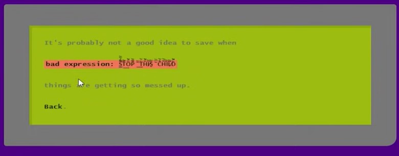The two games we played last week subverted these experiences somewhat. The Uncle who Works for Nintendo indeed started off creepy in my initial playthrough. When the Uncle appeared for the first time to eat my character, I jumped at the successive knocking sounds, then at the cacophonous noise that accompanied the glitching, “erroneous” Twine commands, which made clear that my character faced certain death. However, as I progressed through different endings of the game, the “haunted interface” took on a contrasting tone—rather than anticipating the Uncle, I found myself eagerly awaiting the malfunctioning interfaces because I knew it meant I would progress in the story. At that moment, the “fear factor” that I would have felt toward the Uncle transformed more into a feeling of curiosity: unlike the anxiety-induced hesitation we experienced bracing ourselves for Lisa’s appearance, an urge to “find” the alternate endings trumped any notion of fear.