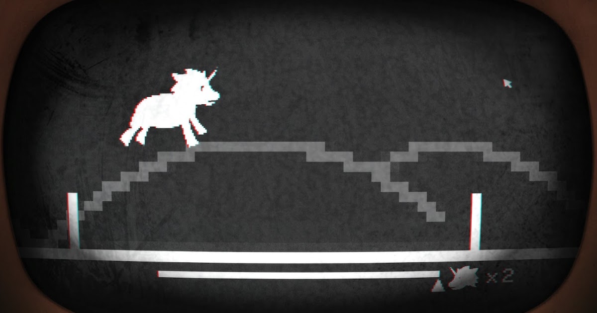 Pony Island’s subversion of the fear factor is more clean-cut. Upon its first clicks, immediately my group sensed that the hacker aesthetic was not curated to necessarily scare us with its devil antagonist, unlike the historical Satanic Panic incidents we talked about in class (backmasking, etc.). Rather, we were laughing at the interface’s whimsical tone, and we thought that the self-awareness that Lucifer and his demon horde possessed actually enhanced an otherwise mundane game. At its core, Pony Island is a platformer game—and a tedious, repetitive, uninspiring one at that. The player controls a pixelated unicorn who can only jump over obstacles in a mostly horizontally-scrolling environment. There are no enemies to take down, no power upgrades to look forward to, and no change in the speed or intensity of the scrolling.