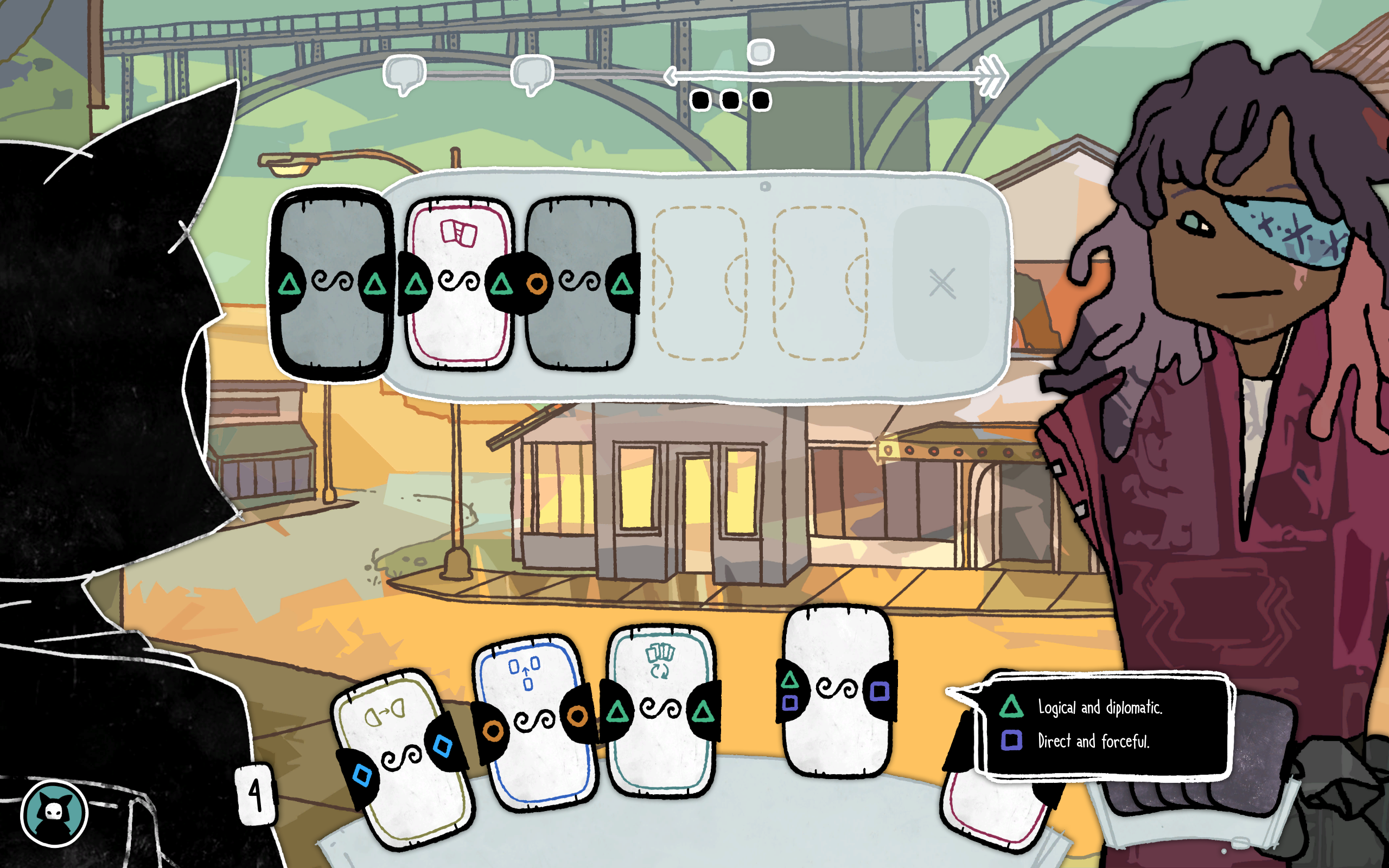 Signs of the Sojourner uses its deck-building structure as a jumping off point for creating a procedural rhetoric that encourages empathetic, compassionate communication. Players can only succeed in conversations–and therefore receive the items they need to complete goals and the information to unlock new paths–by forming matches with characters. In order to form a match, players have to recognize the right-hand symbol of the other character and mirror it. In order to set up a subsequent match, the player must introduce a new symbol that corresponds to the kinds of symbols the character they are talking to is likely to have. There can only be a match when characters listen to each other and recognize their partner’s conversation style. And in order to do this, players need to intentionally build a deck suited to the characters they want to talk to.