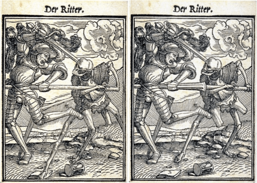 A Hans Holbein woodcut from around 1497 (right) next to a version edited to depict a variant of Slender Man (left) (in Emery, 2017).